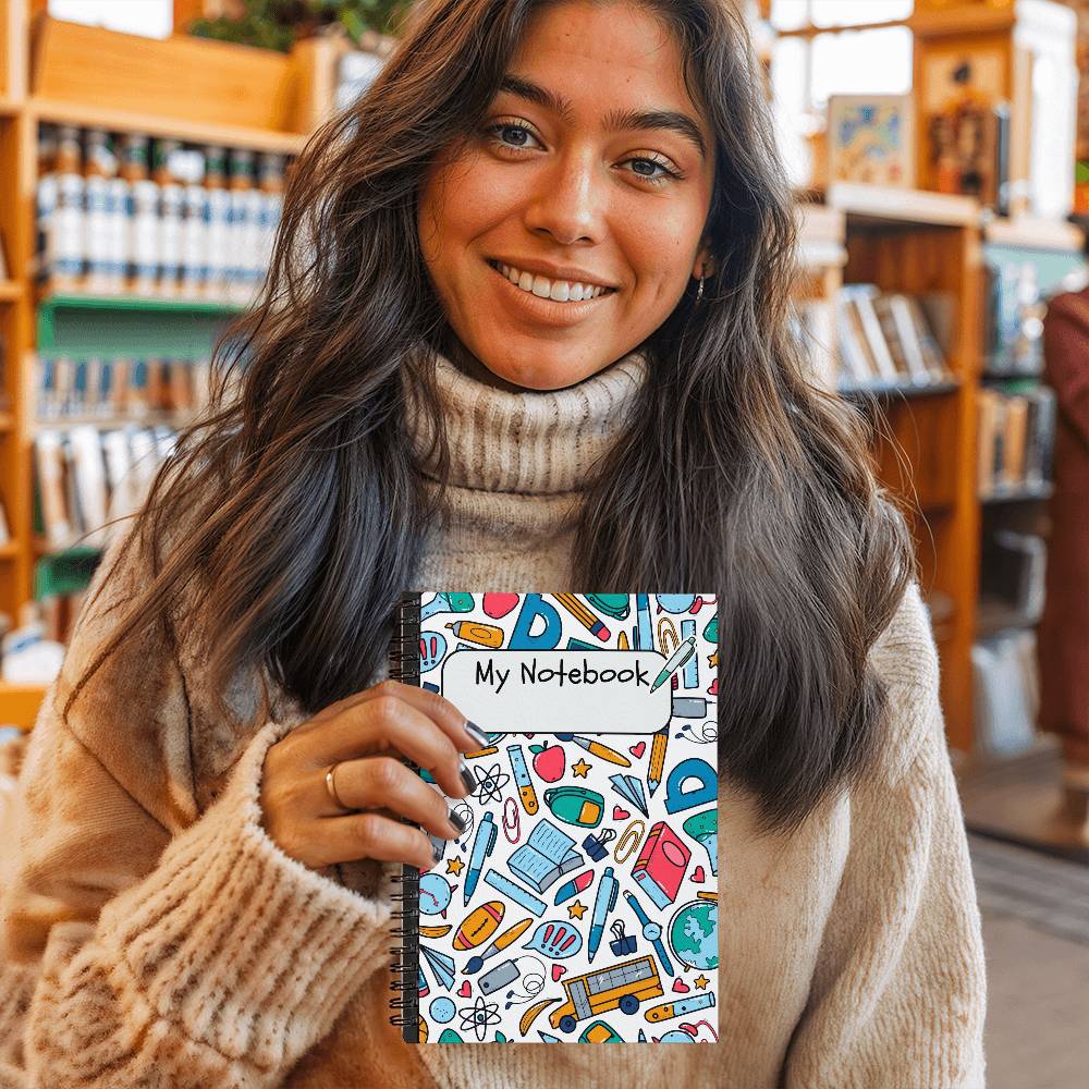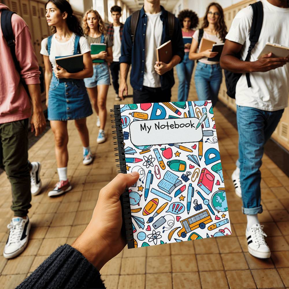 Introducing the School Doodles Notebook, a vibrant and playful journal designed to bring fun and organization to your school days. Measuring a handy 6" x 8", this spiral-bound notebook features a lively cover adorned with colorful doodles of school supplies, perfect for students of all ages. With 120 pages of premium quality paper, it's your ideal companion for taking notes, drawing, or organizing your thoughts.