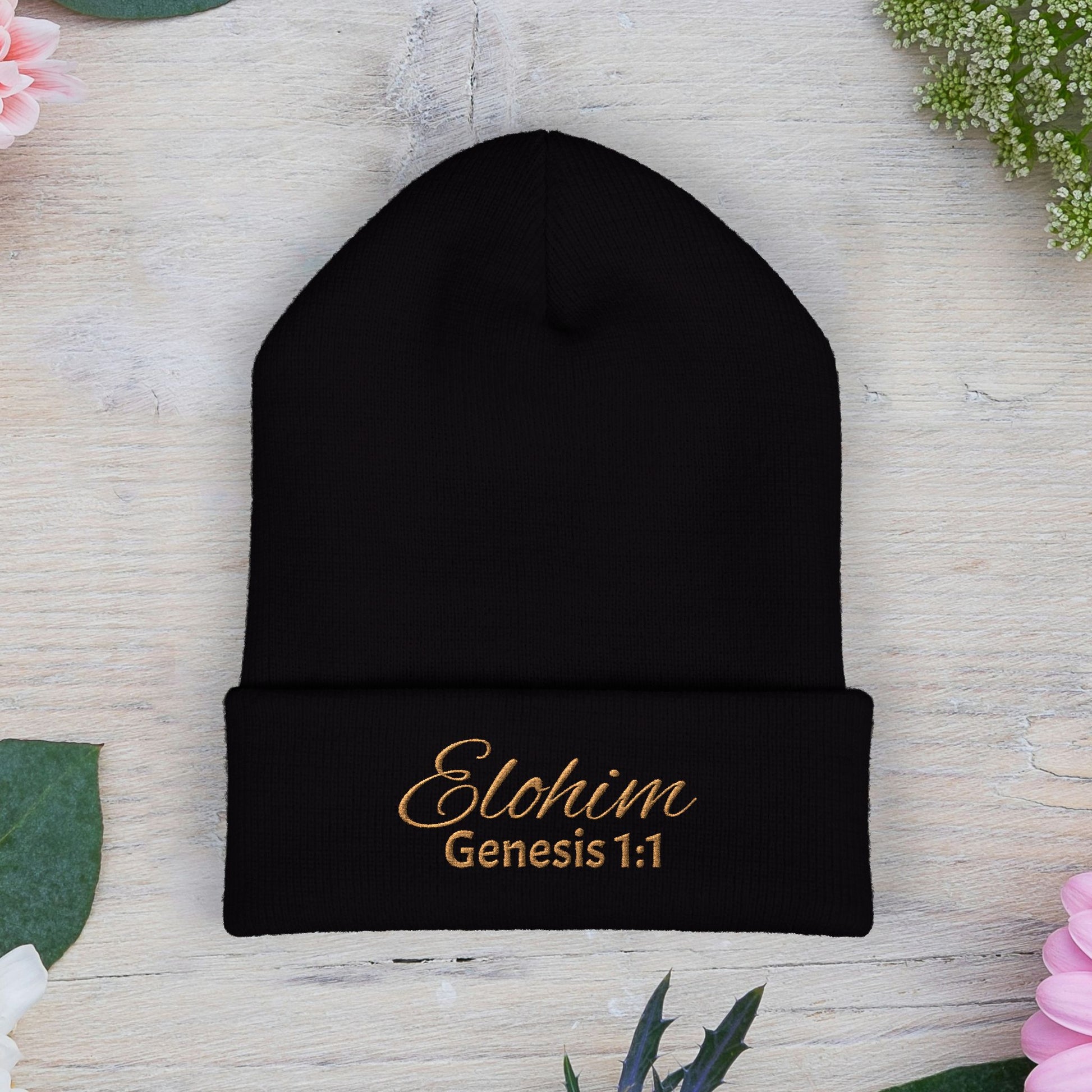 Brown Embroidered 'ELOHIM, GENESIS 1:1' Classic Cuffed Beanie - Cozy Winter Hat, Streetwear Accessory, Personalized Gifts, Religious Apparel, Unisex Beanie