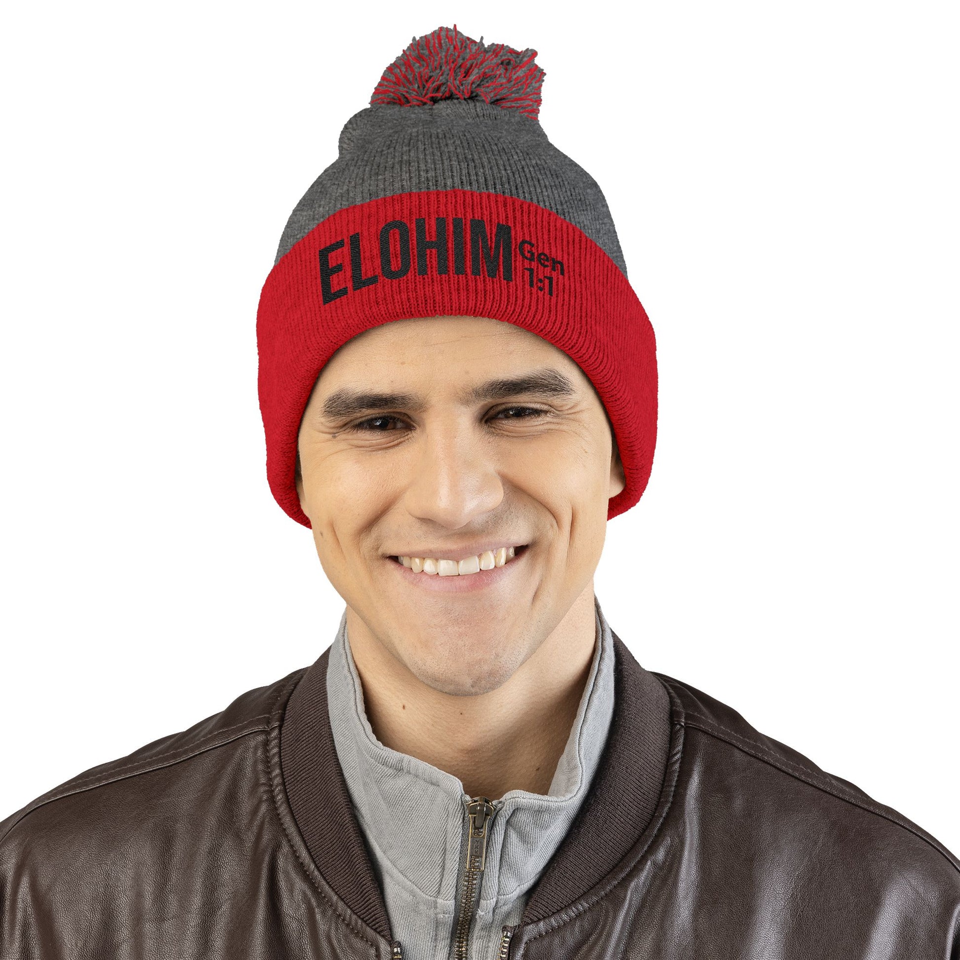 Cozy Pom-Pom Knit Cap with 'ELOHIM, GENESIS 1:1' Embroidery Beanie - Stylish Winter Accessory for All Ages, Perfect Gift for Birthdays, Holidays, and Outdoor Activities