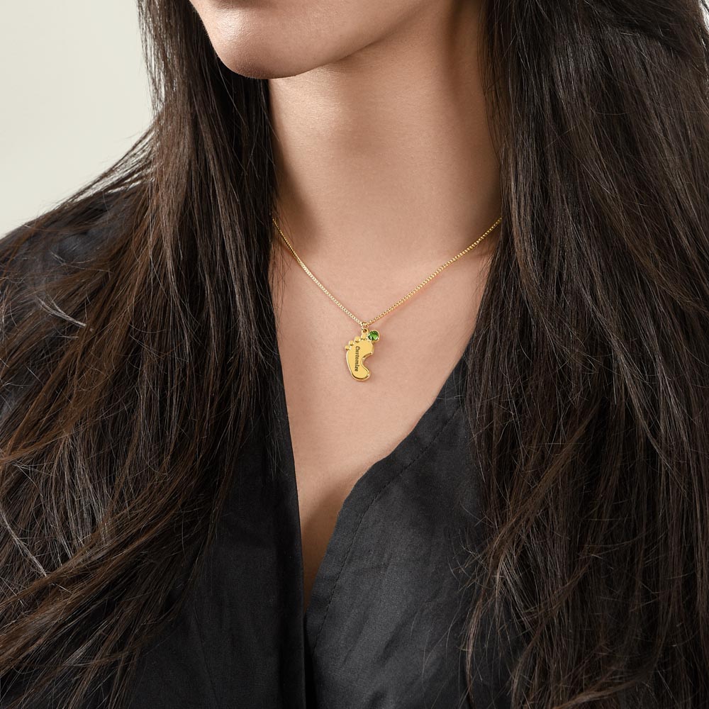 Celebrate the arrival of a newborn or cherish a precious memory with our Custom Baby Feet Necklace with Birthstone. Personalize your gift by engraving a name of your choice onto the pendant and choosing a crystal that correlates with the baby's birth month. And by picking multiple pendants, a custom present like this is perfect for moms and grandmothers with big families. This is a one-of-a-kind keepsake that will be treasured for a lifetime!