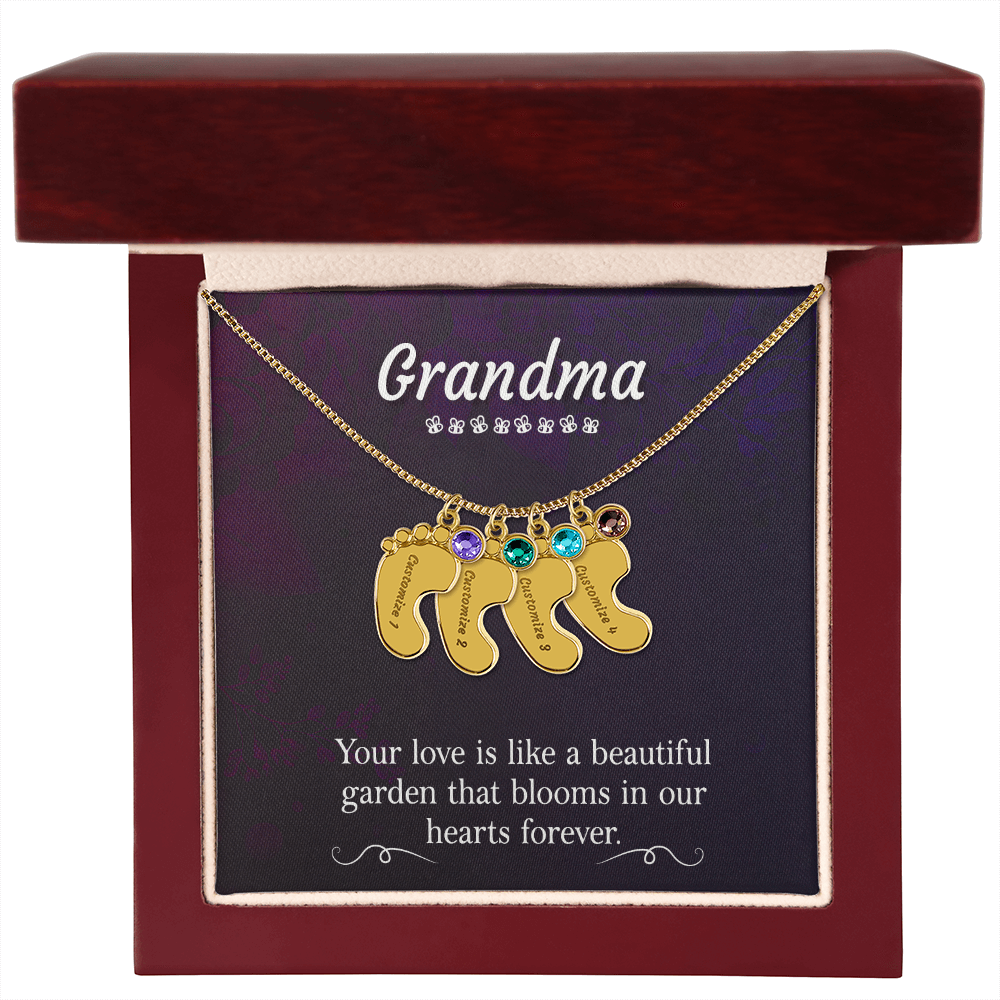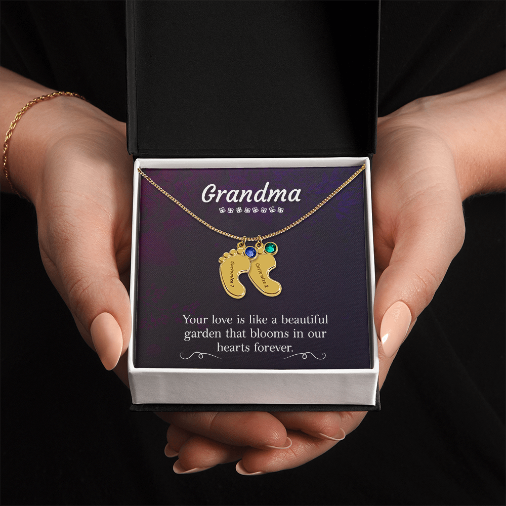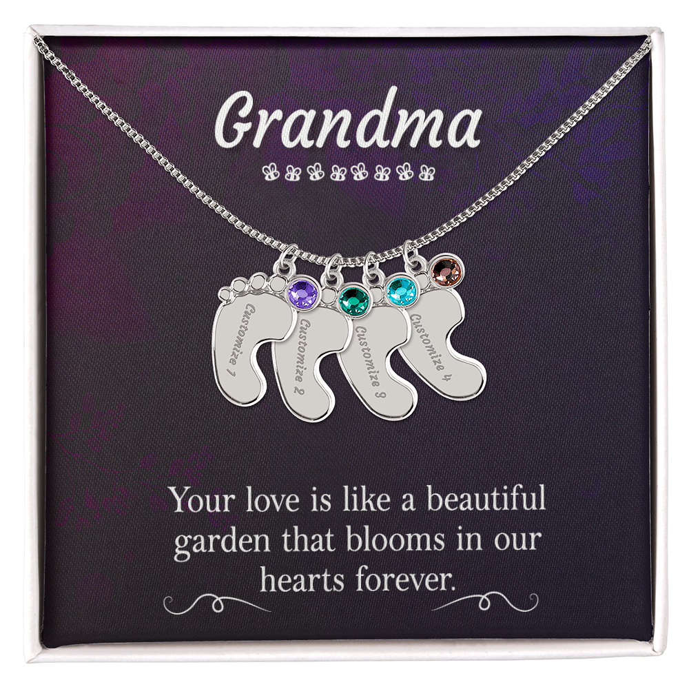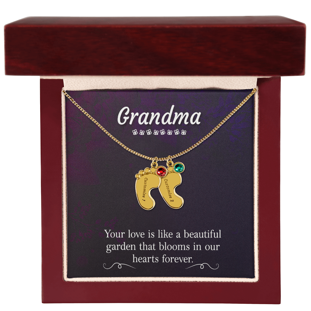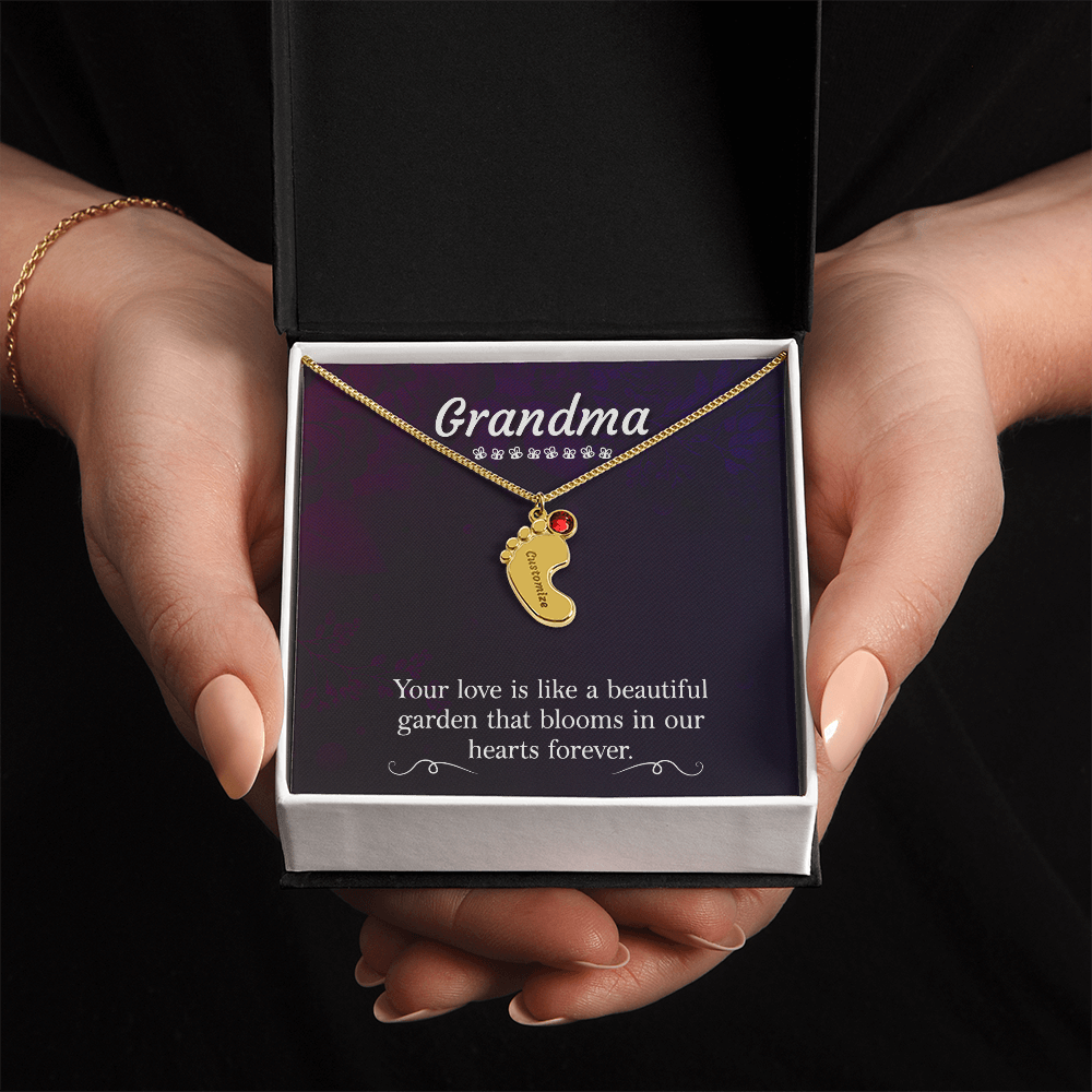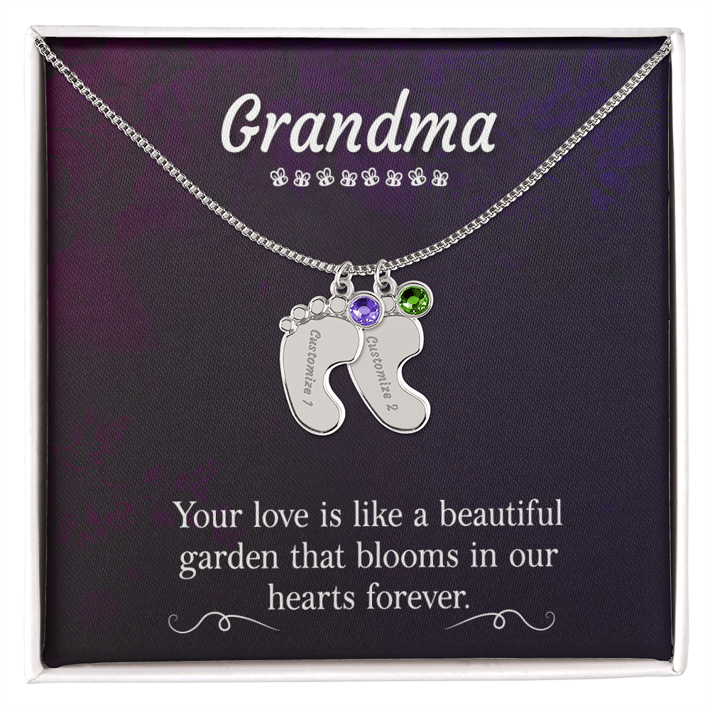 Celebrate the arrival of a newborn or cherish a precious memory with our Custom Baby Feet Necklace with Birthstone. Personalize your gift by engraving a name of your choice onto the pendant and choosing a crystal that correlates with the baby's birth month. And by picking multiple pendants, a custom present like this is perfect for moms and grandmothers with big families. This is a one-of-a-kind keepsake that will be treasured for a lifetime!