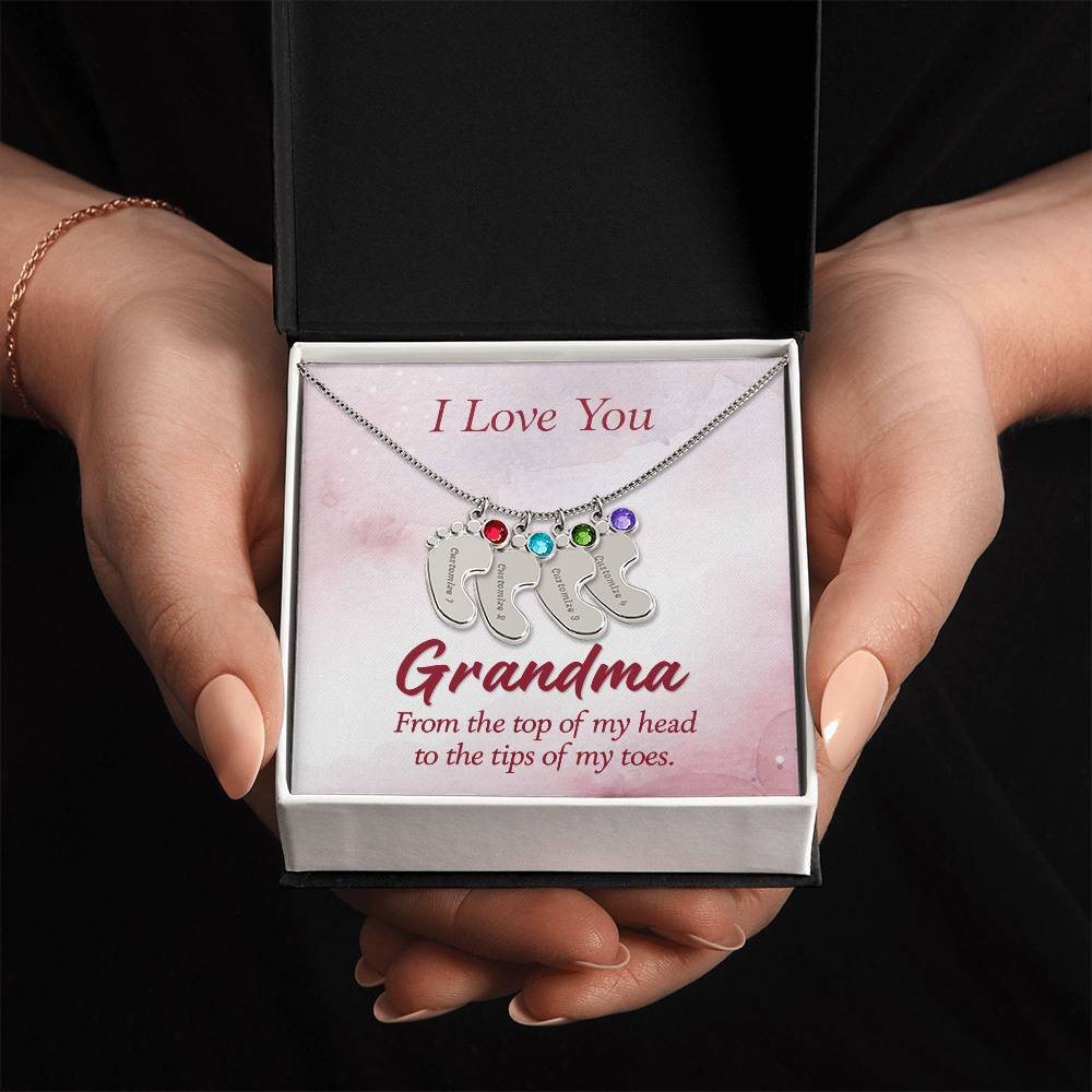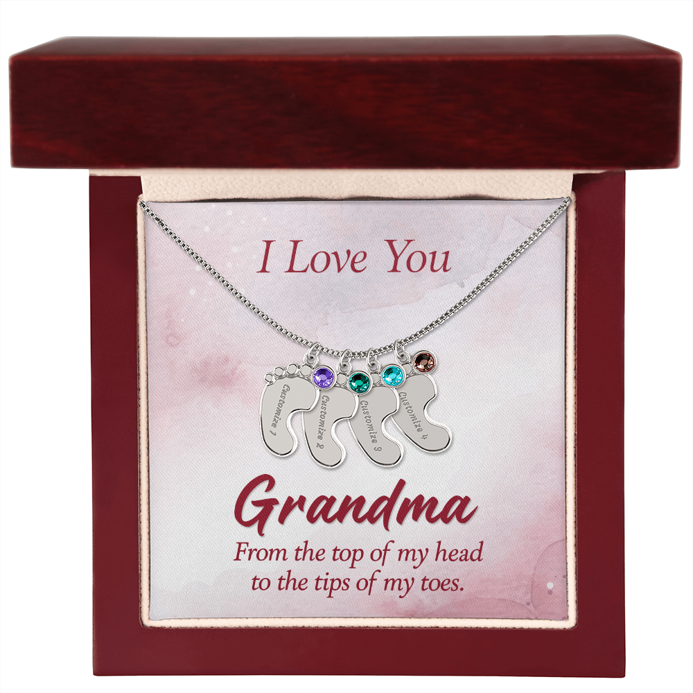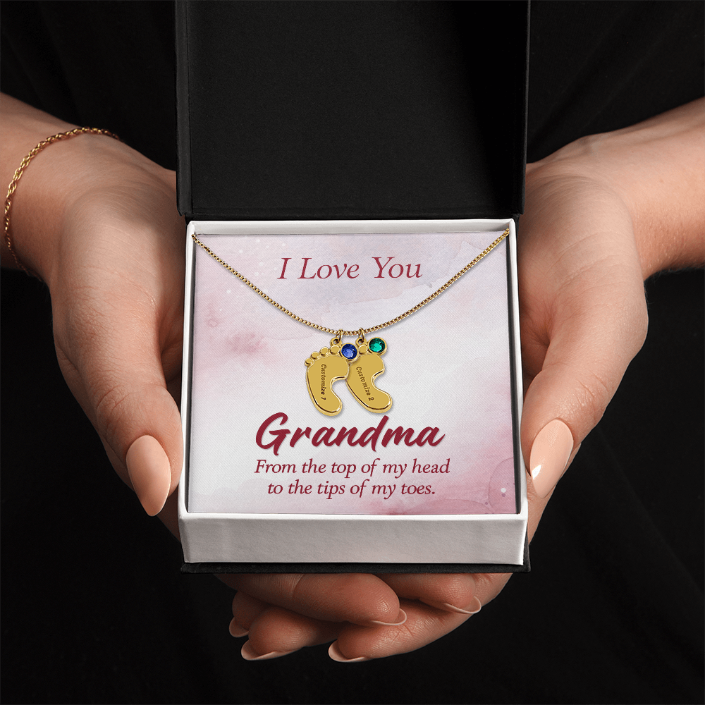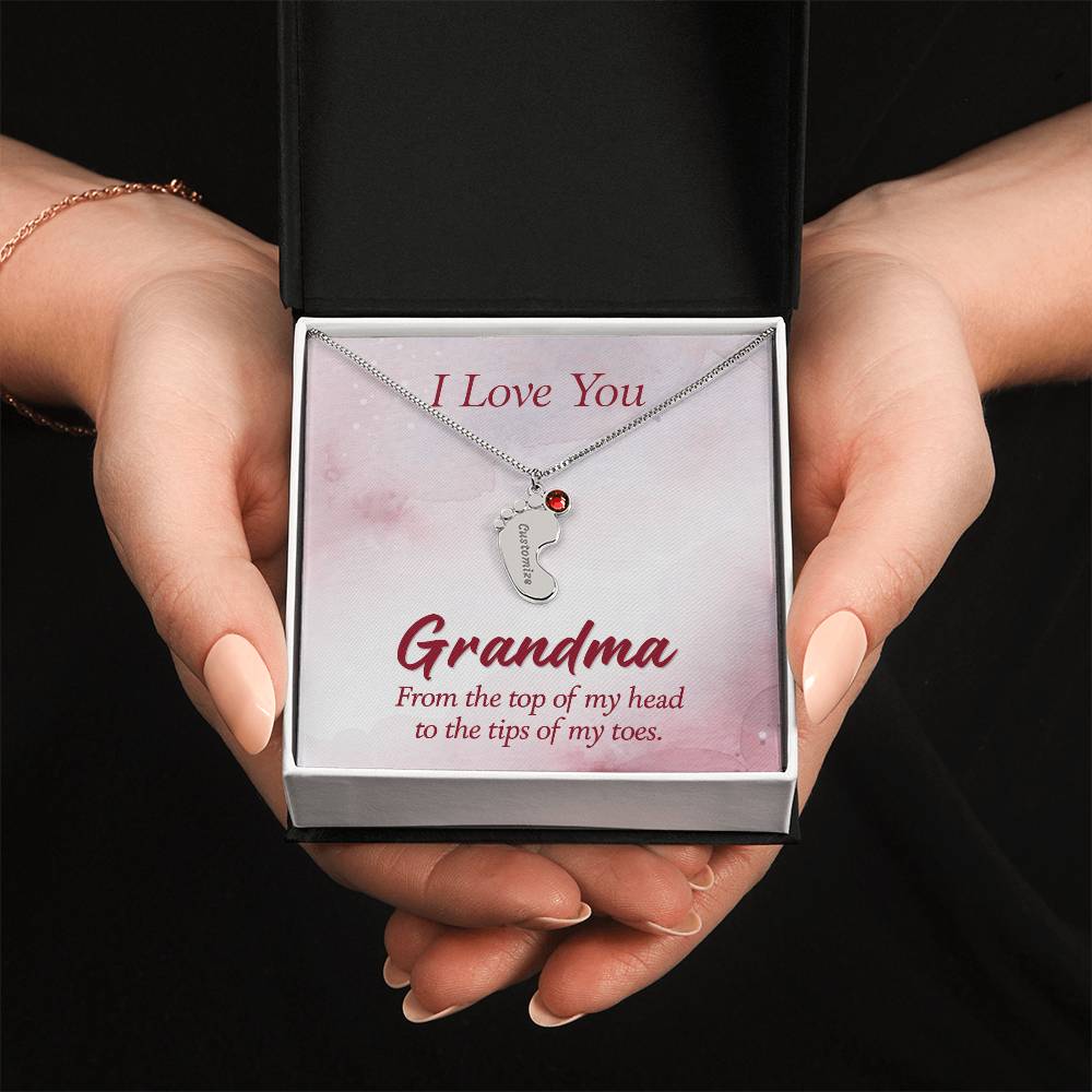 Celebrate the arrival of a newborn or cherish a precious memory with our Custom Baby Feet Necklace with Birthstone. Personalize your gift by engraving a name of your choice onto the pendant and choosing a crystal that correlates with the baby's birth month. And by picking multiple pendants, a custom present like this is perfect for moms and grandmothers with big families. This is a one-of-a-kind keepsake that will be treasured for a lifetime!