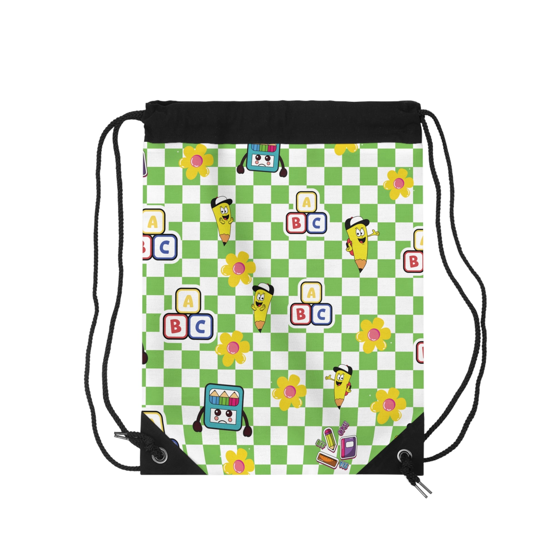 Custom Green SchoolYard Chic Composition Book Inspired Colorful plsyful icons Drawstring Bag | Personalized College Ruled Tote | Kids School Gear | Fun Gym Sack | Back to School Accessory