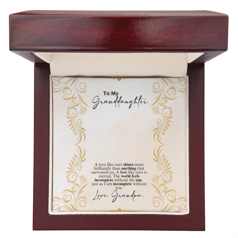 A love like ours shines more brilliantly than anything that surrounds us. A love like ours is eternal. The world feels incomplete without the sun, just as I am incomplete without you. Love Grandpa.