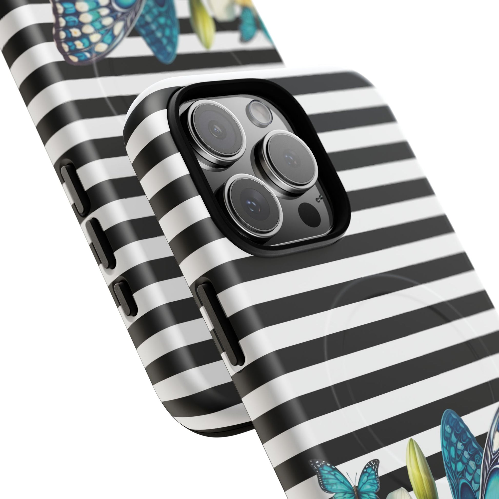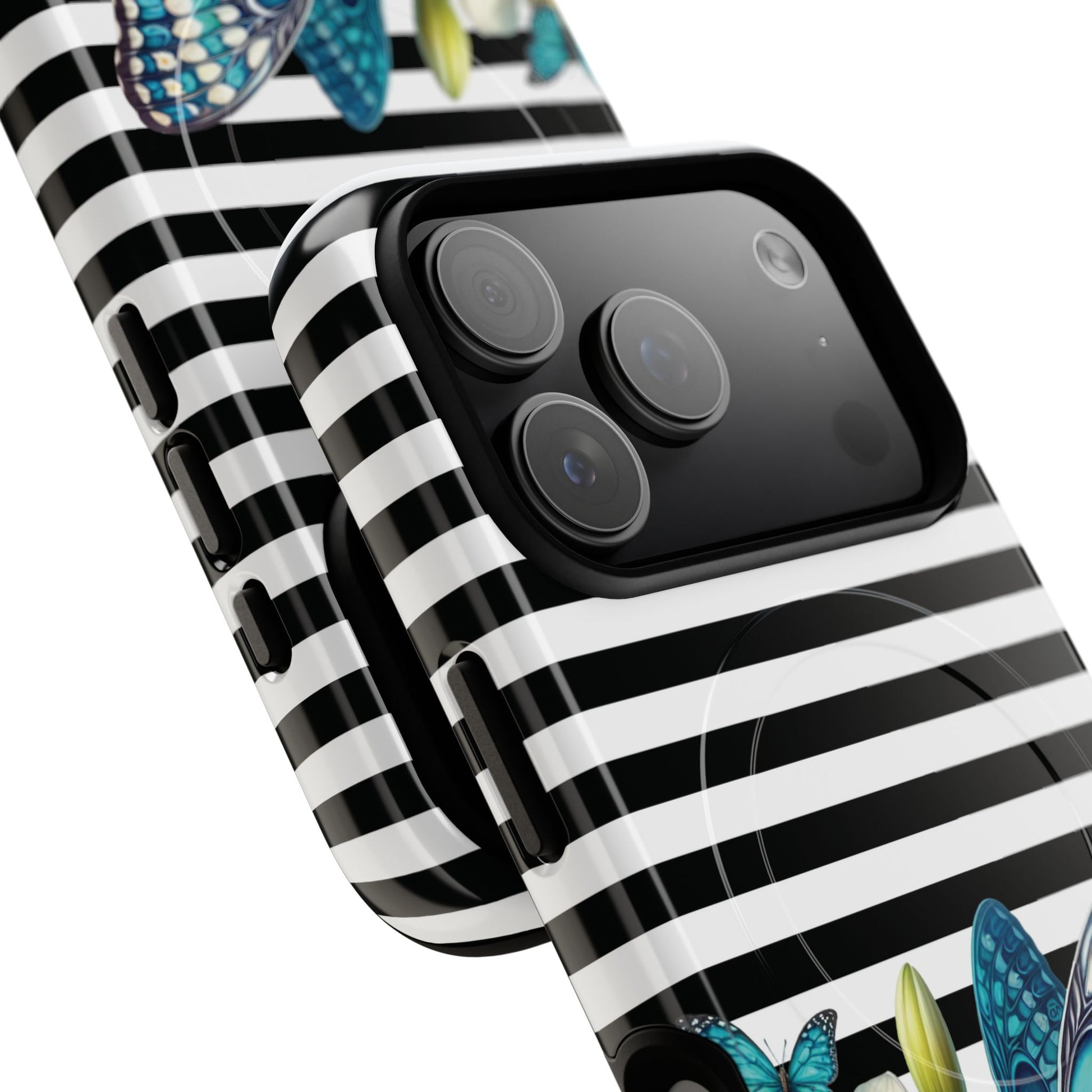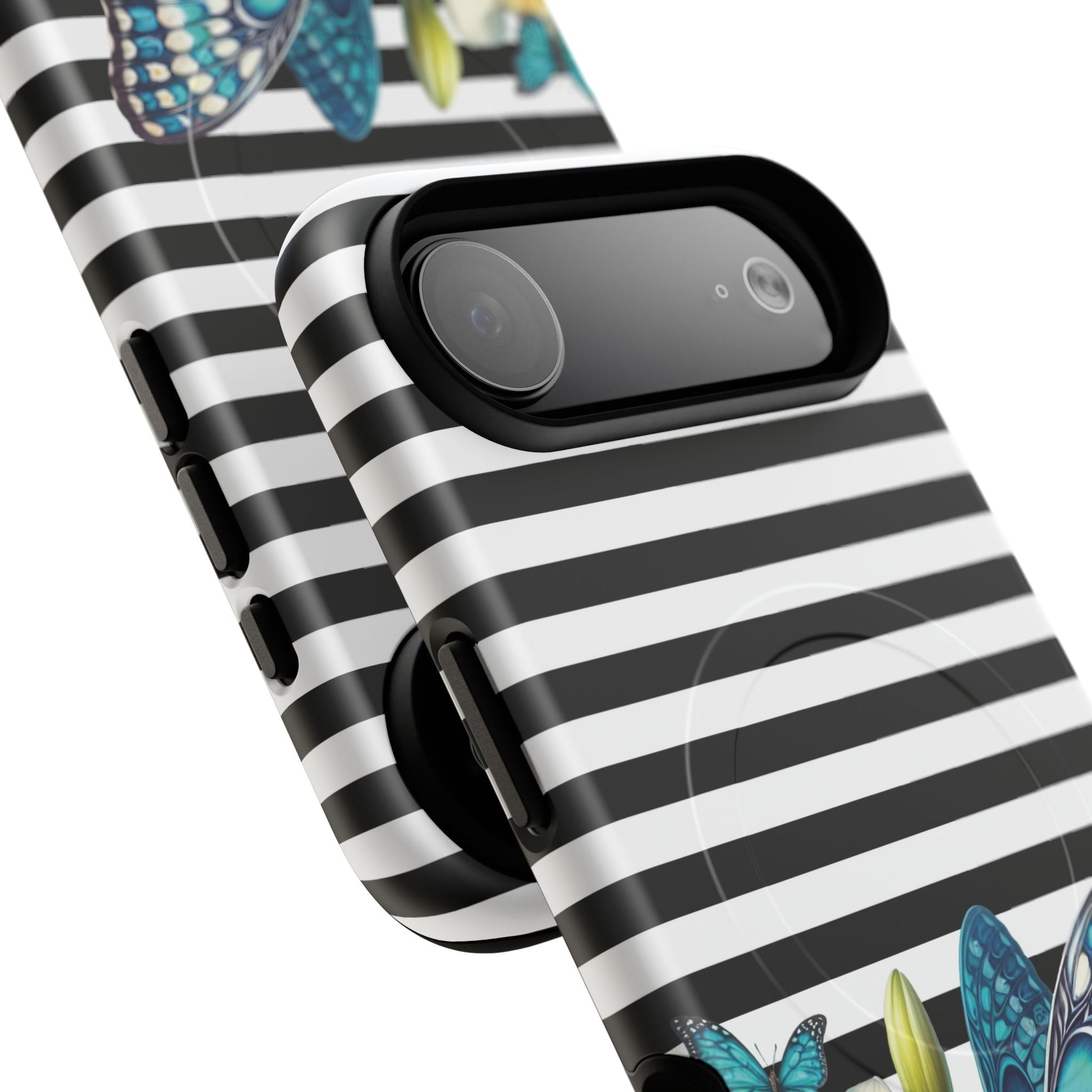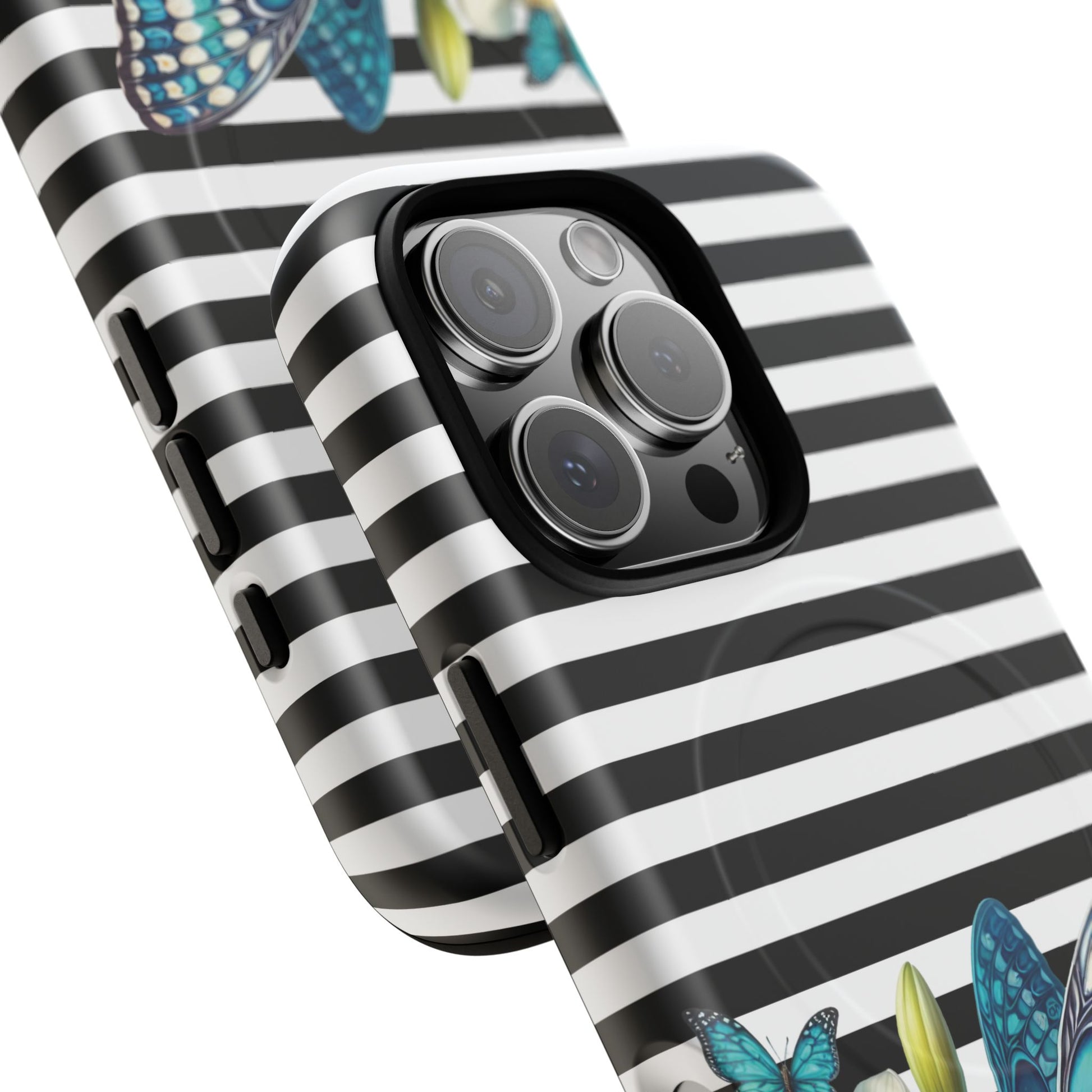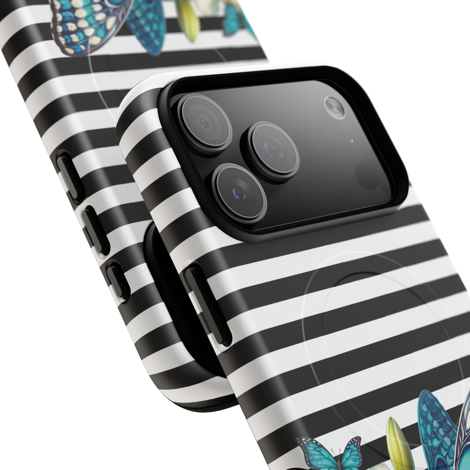 Introducing our stylish Tough iPhone Magnetic Case, perfect for those who want to combine aesthetics with reliability. This case boasts a vibrant design featuring delicate butterflies among bold stripes, bringing a touch of nature to your everyday tech. It’s not just about looks; it’s designed to protect your device while enhancing its charm.