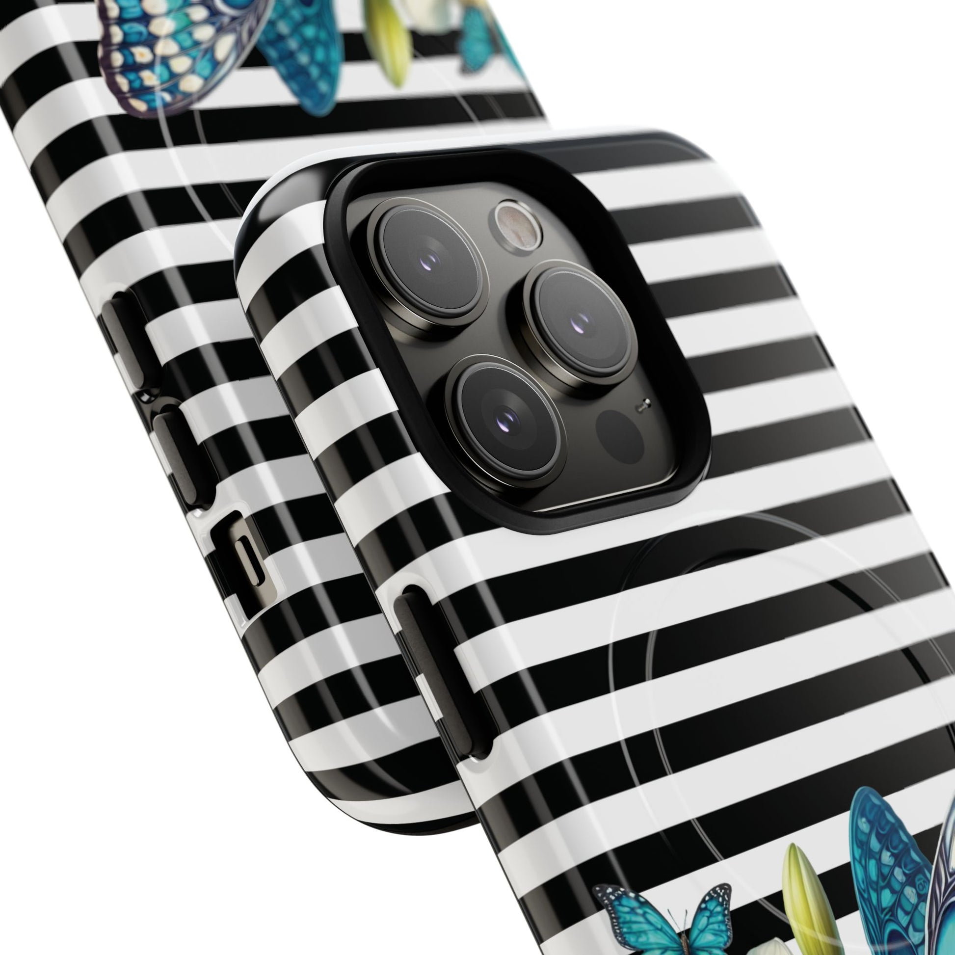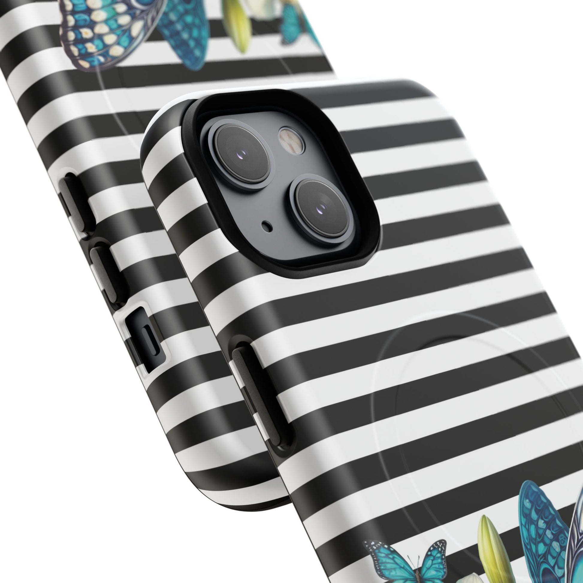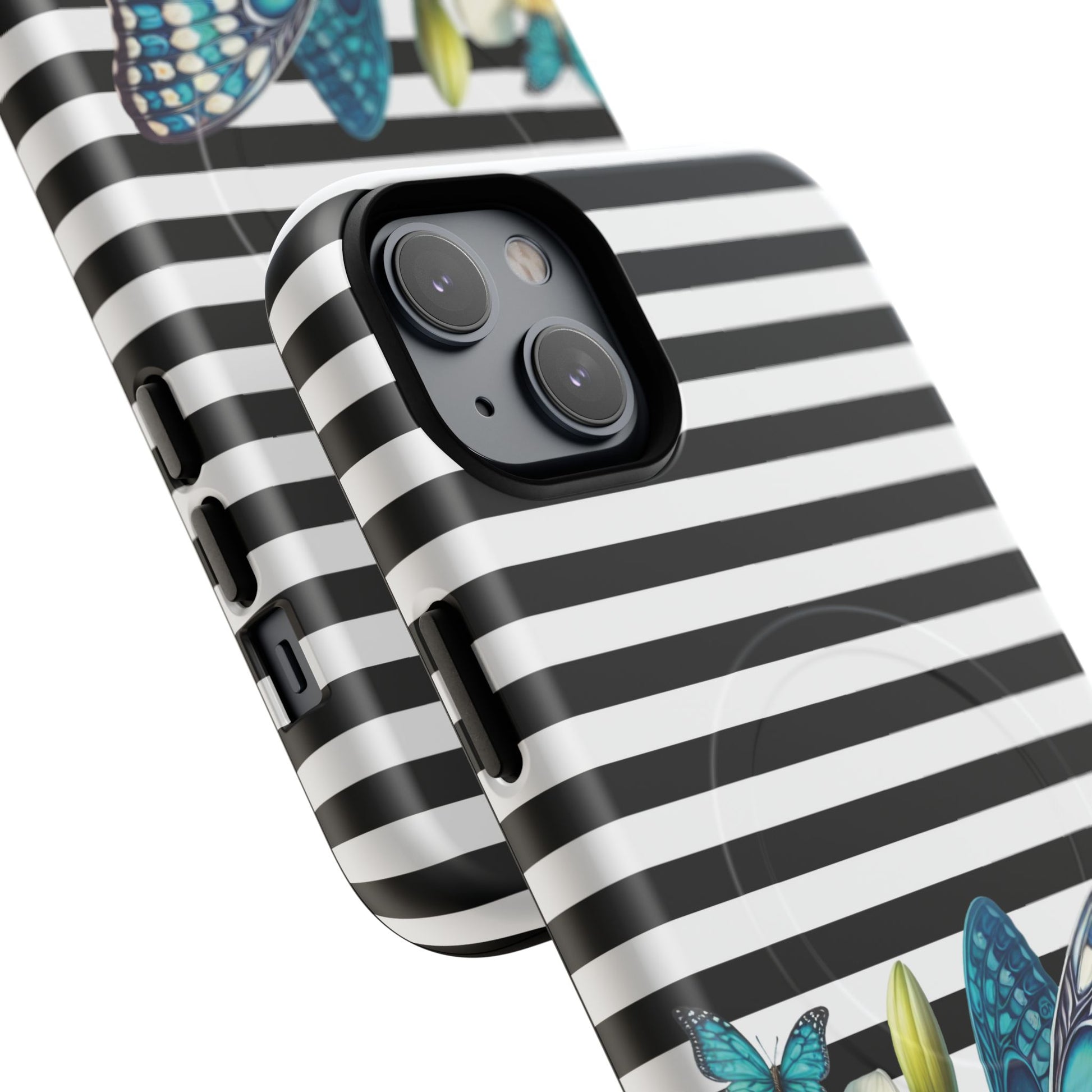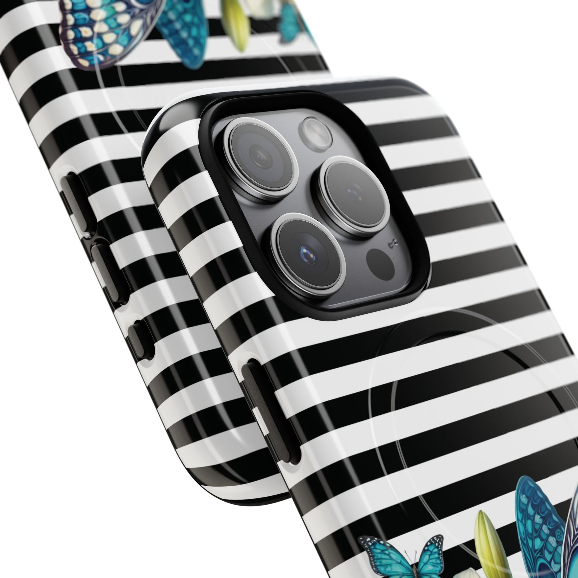 Introducing our stylish Tough iPhone Magnetic Case, perfect for those who want to combine aesthetics with reliability. This case boasts a vibrant design featuring delicate butterflies among bold stripes, bringing a touch of nature to your everyday tech. It’s not just about looks; it’s designed to protect your device while enhancing its charm.