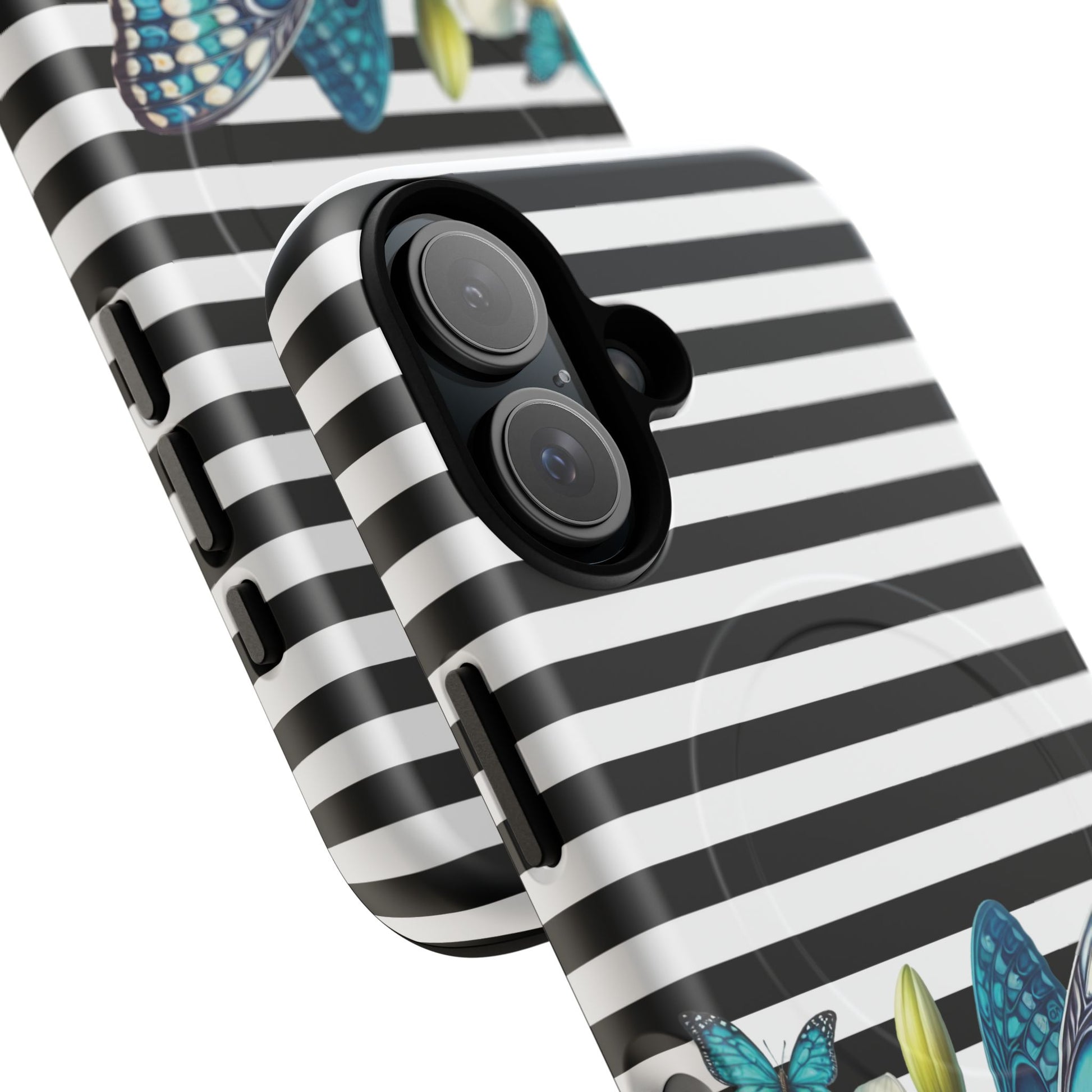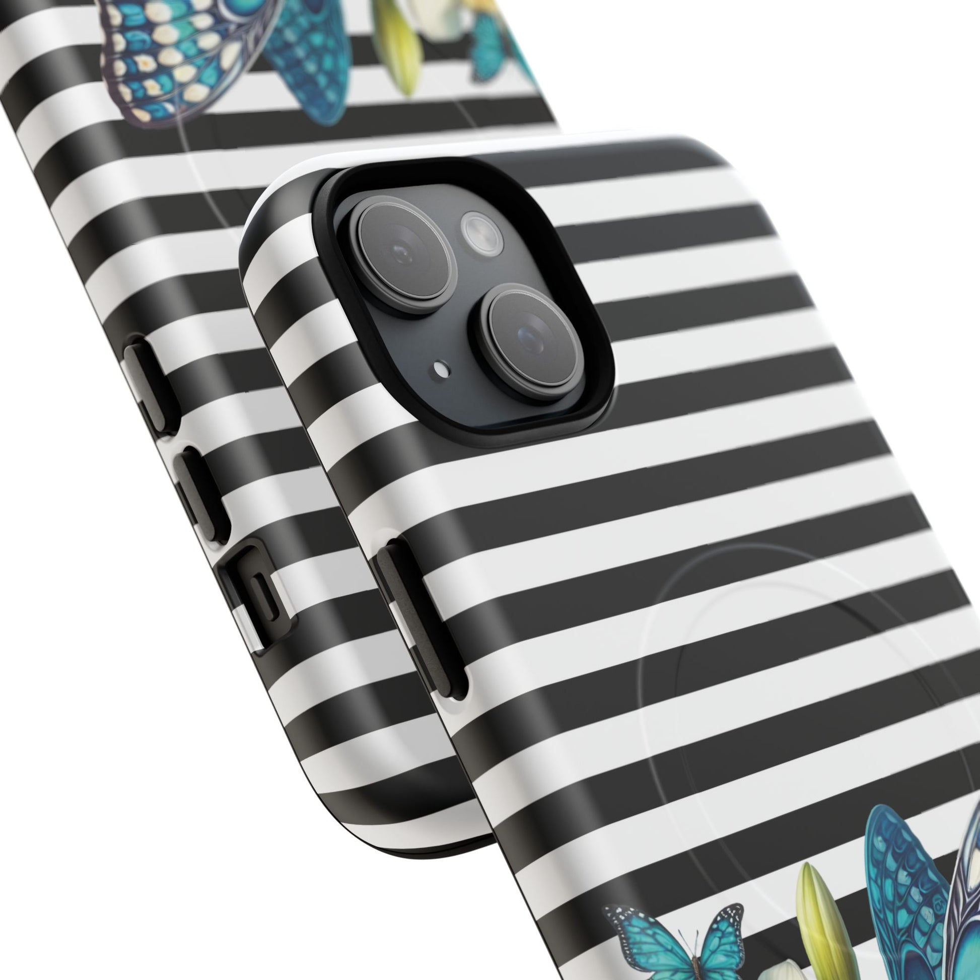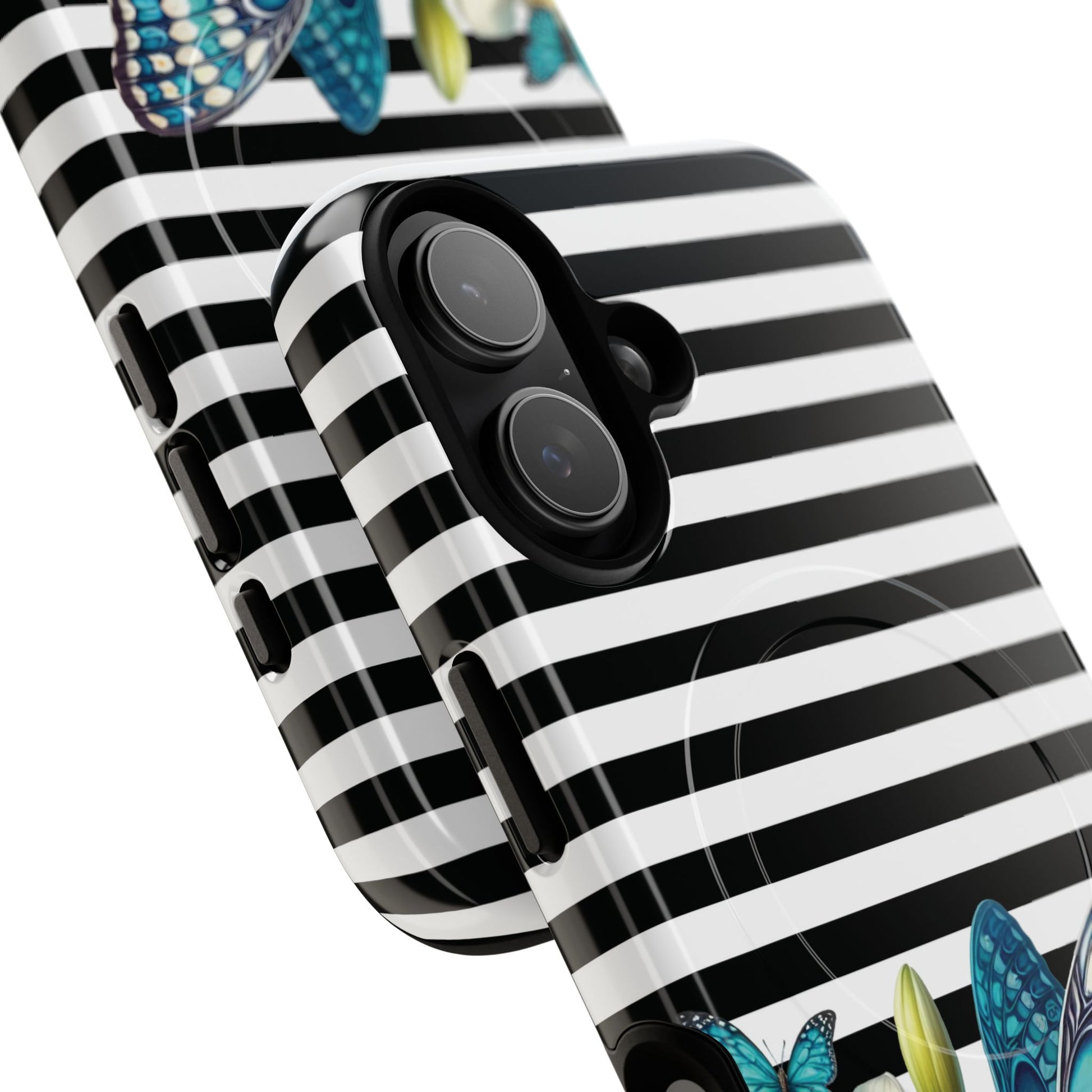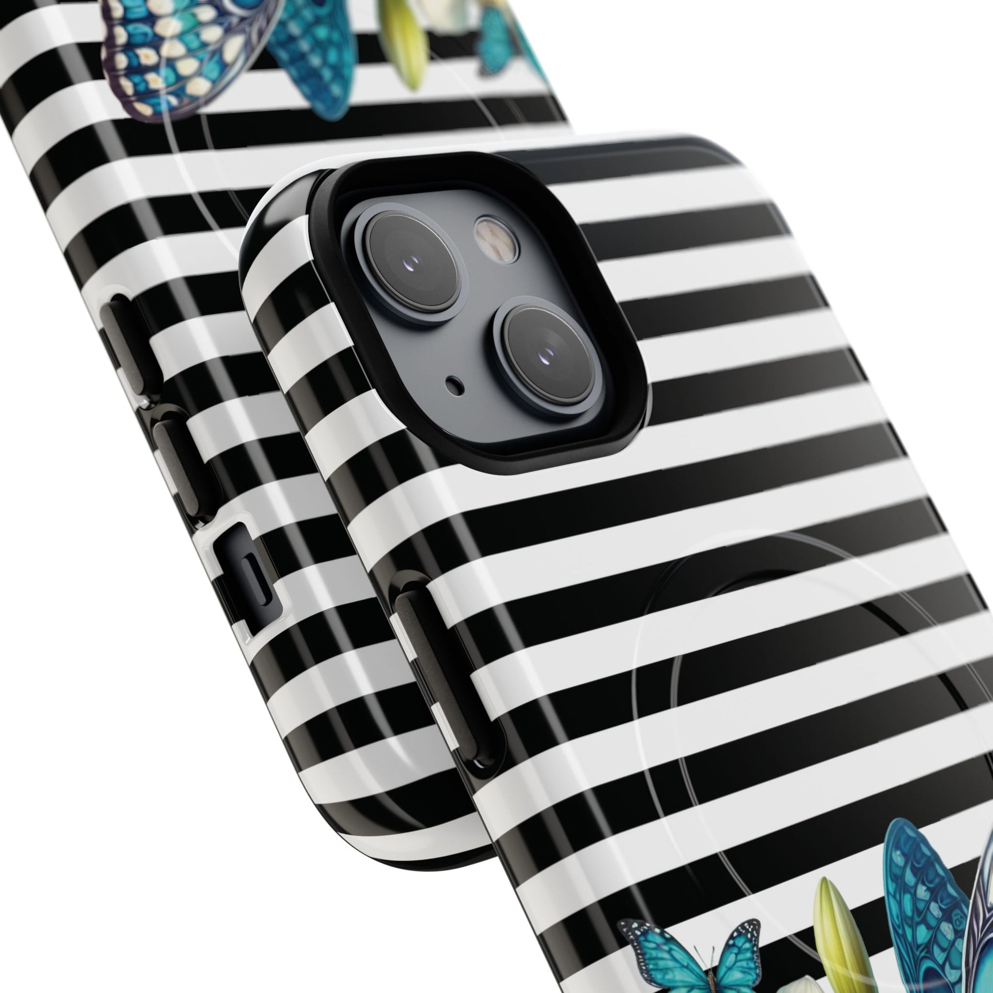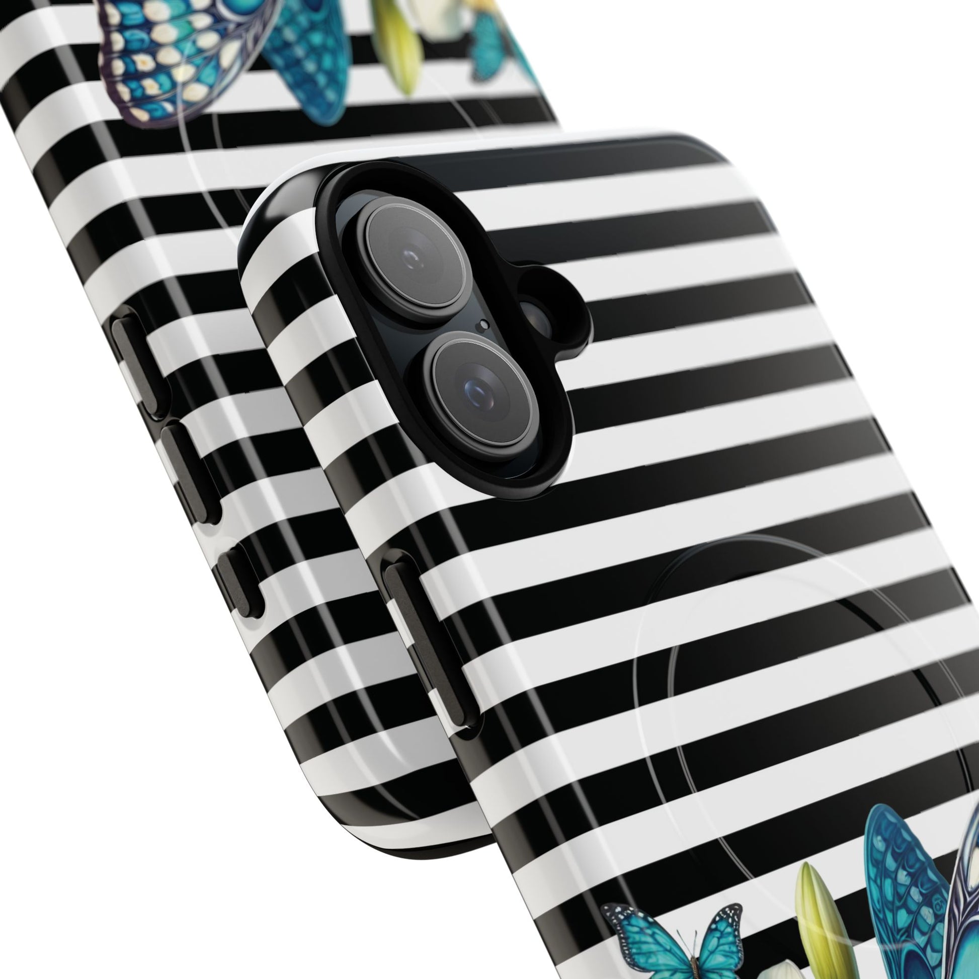 Introducing our stylish Tough iPhone Magnetic Case, perfect for those who want to combine aesthetics with reliability. This case boasts a vibrant design featuring delicate butterflies among bold stripes, bringing a touch of nature to your everyday tech. It’s not just about looks; it’s designed to protect your device while enhancing its charm.