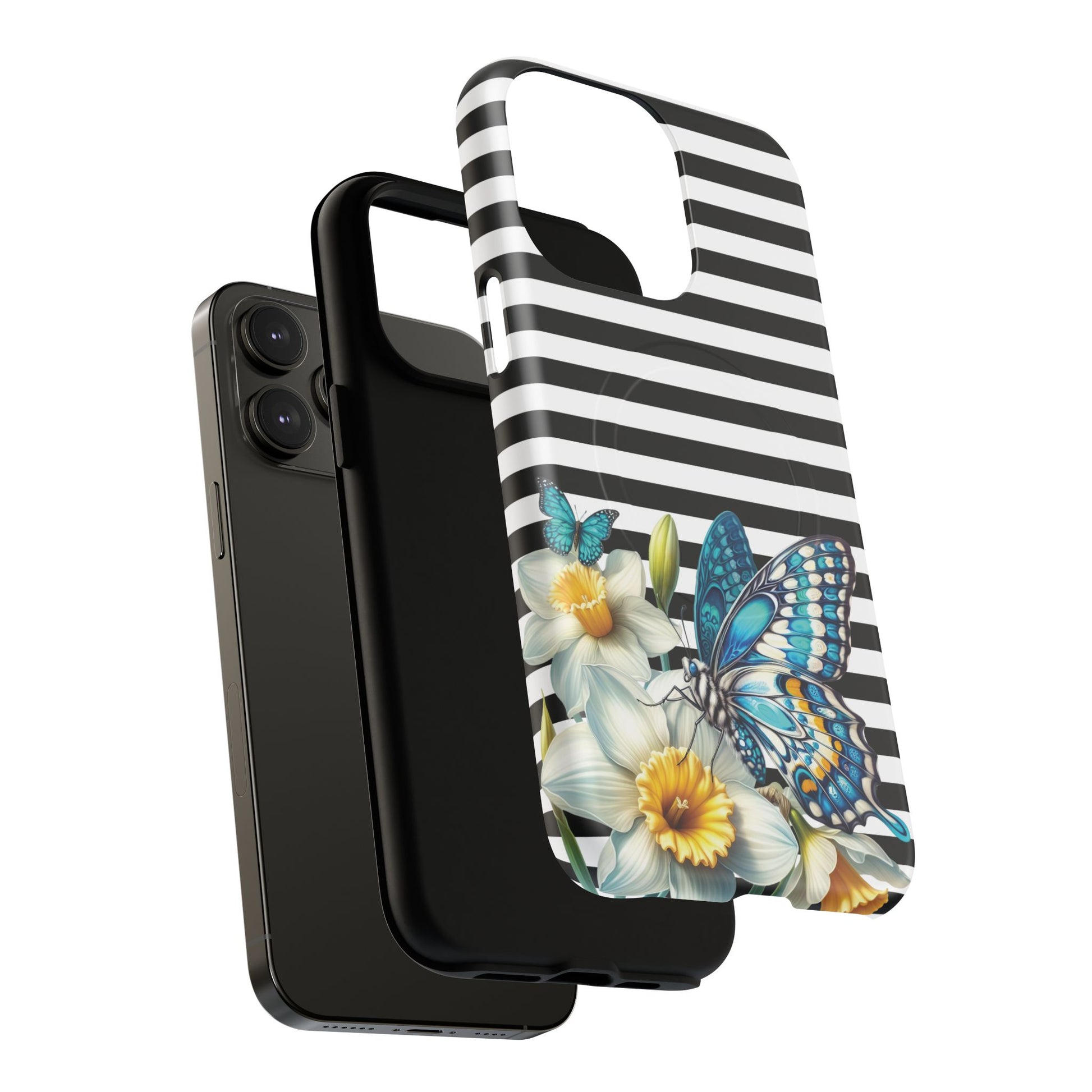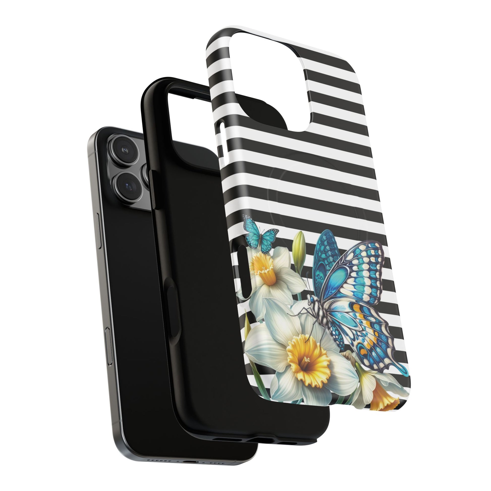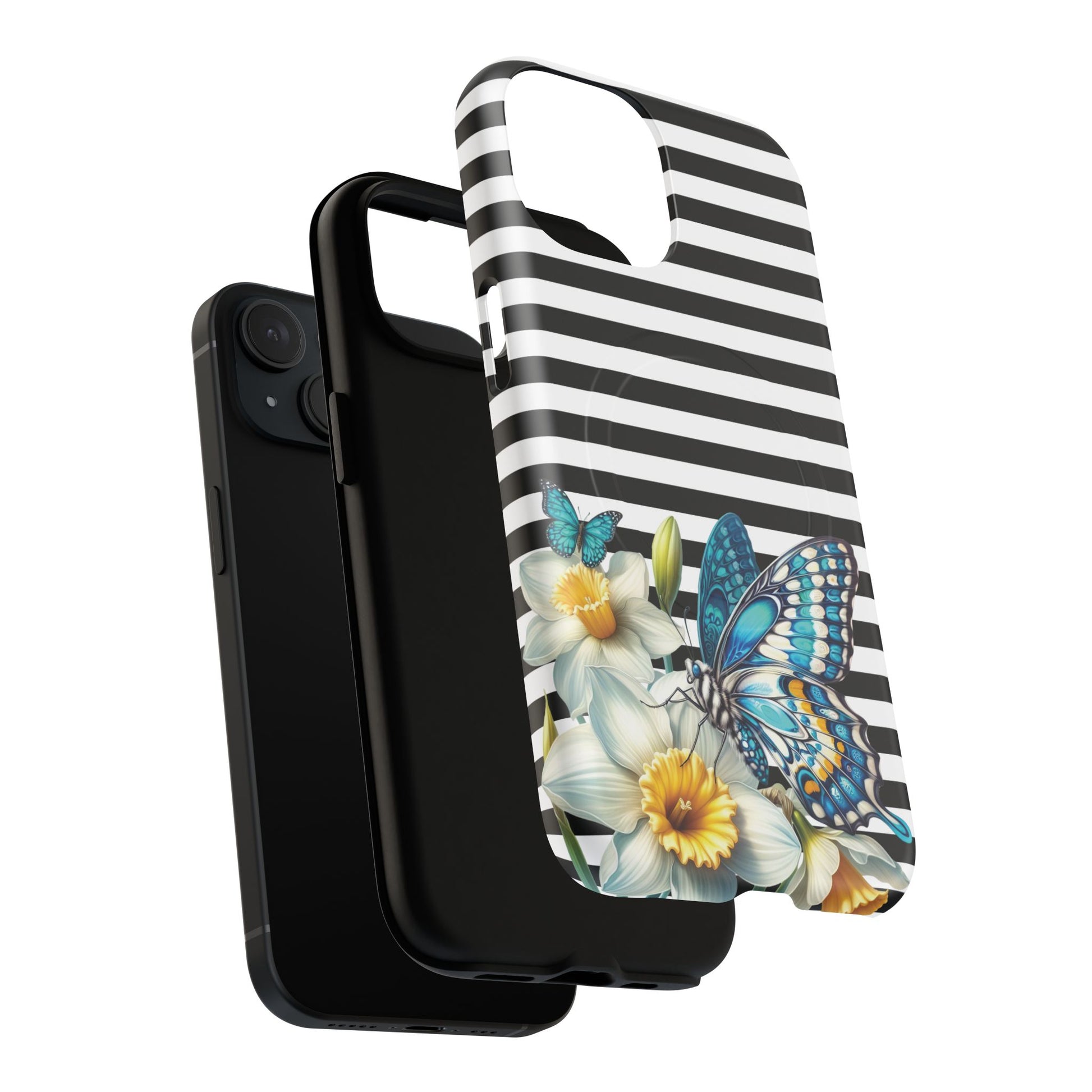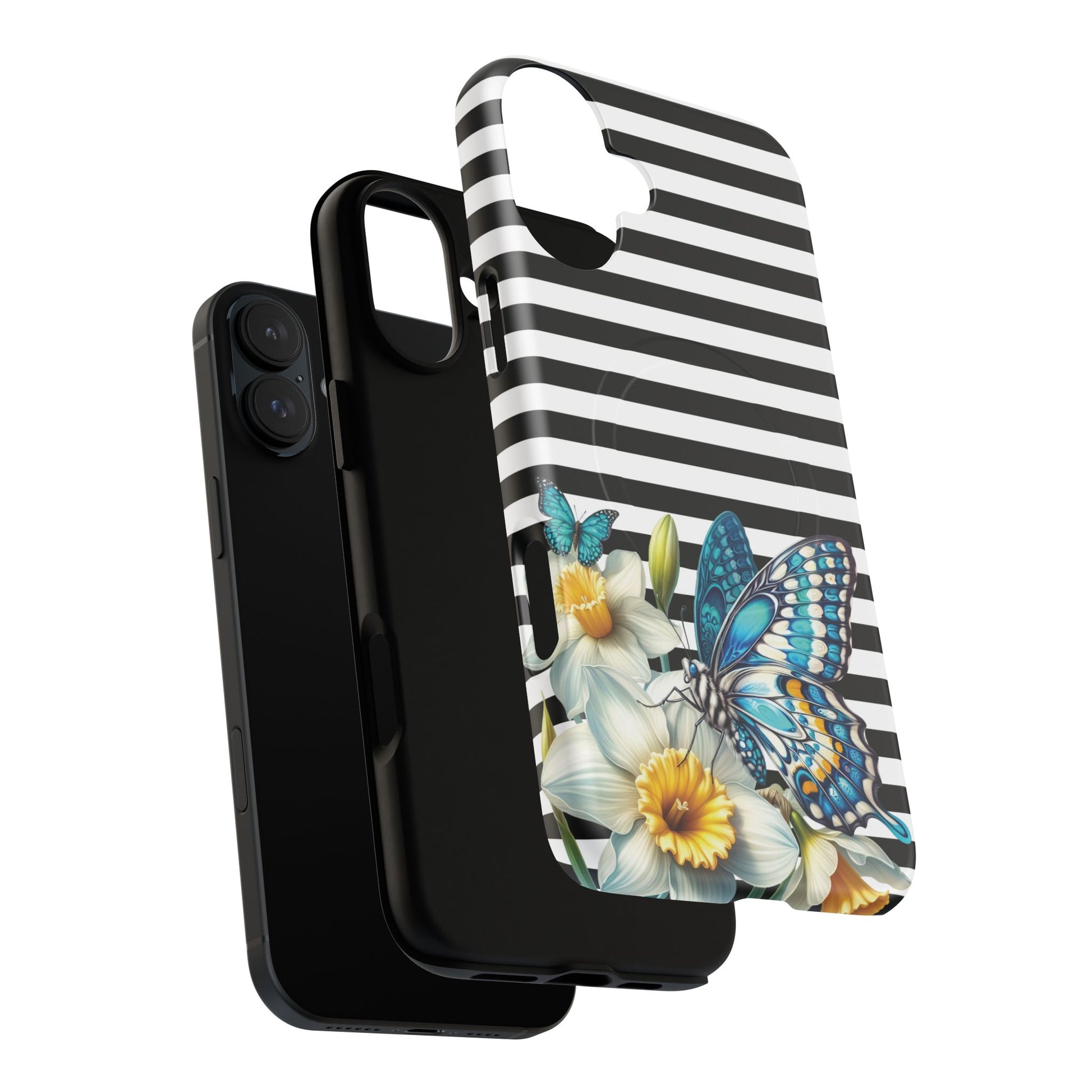 Daffodil Flutter Tough iPhone Magnetic Case A vibrant butterfly dances among fresh spring blooms on a bold striped canvas.