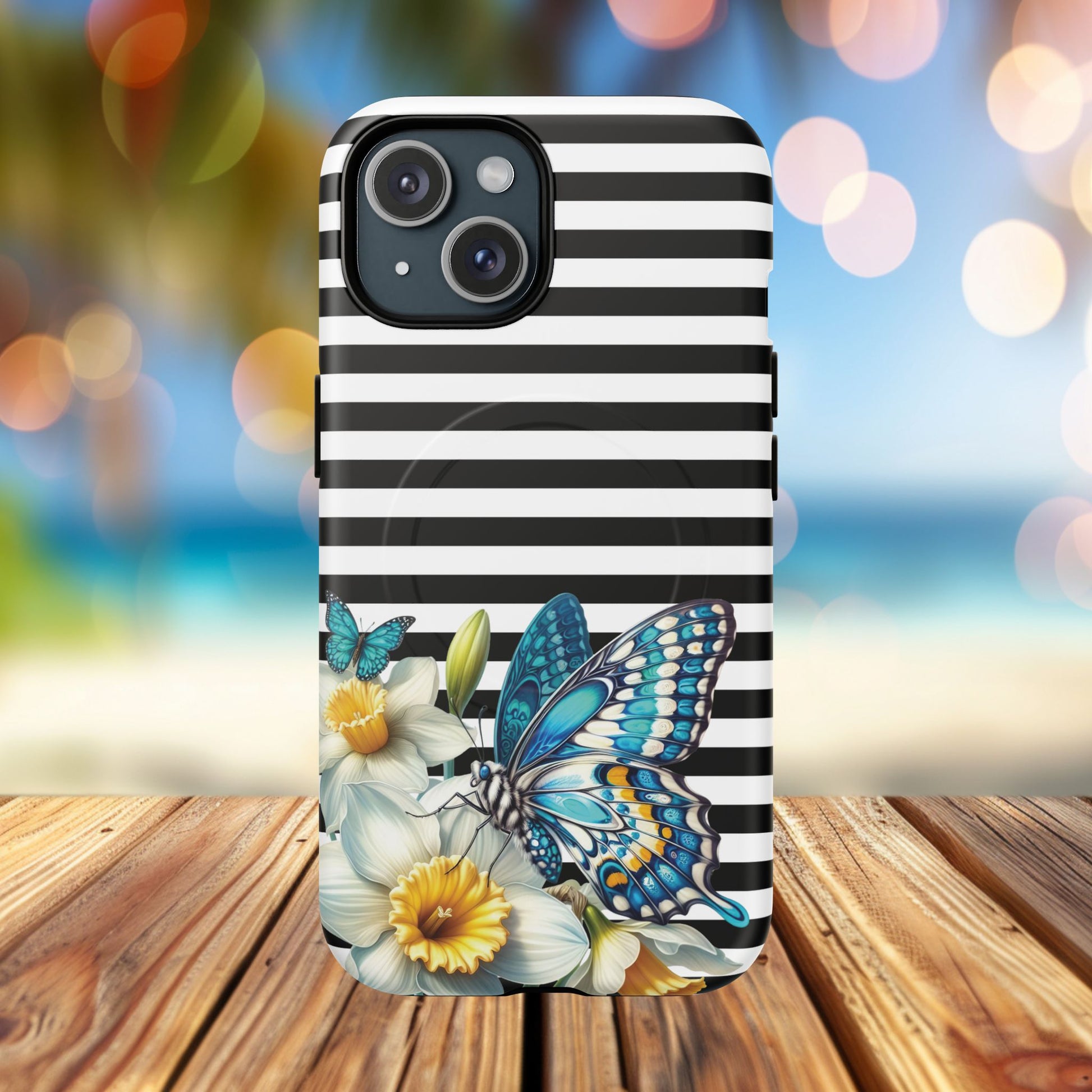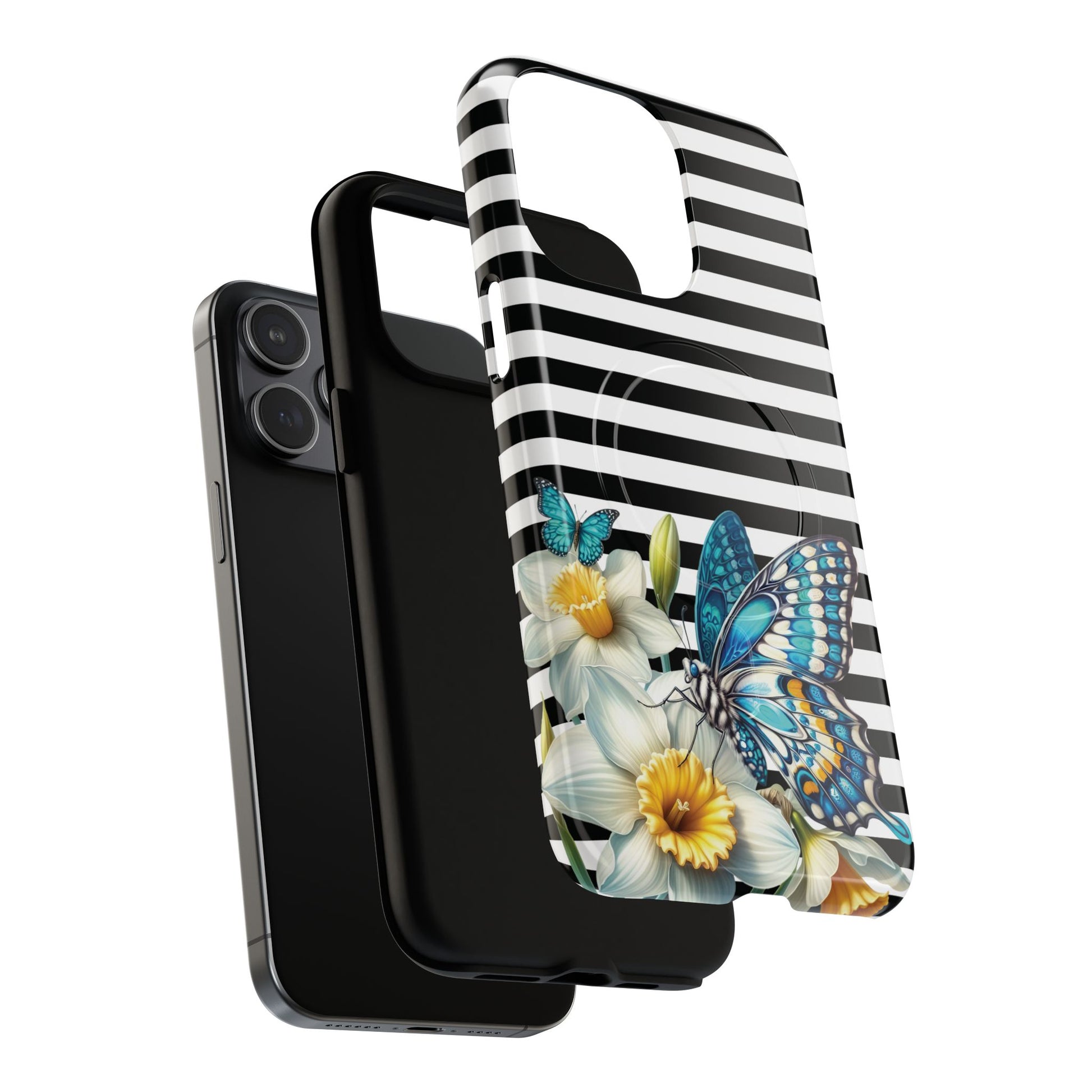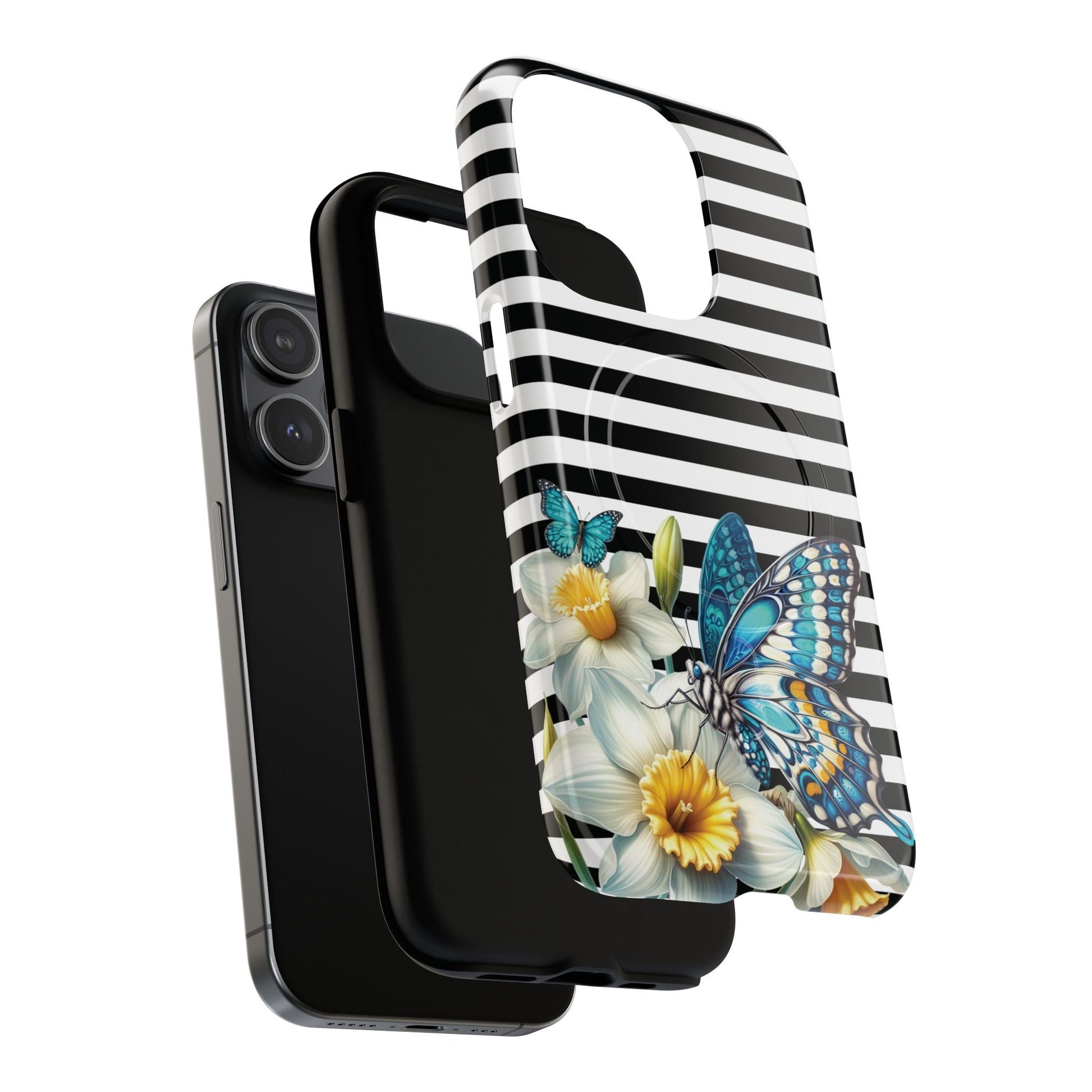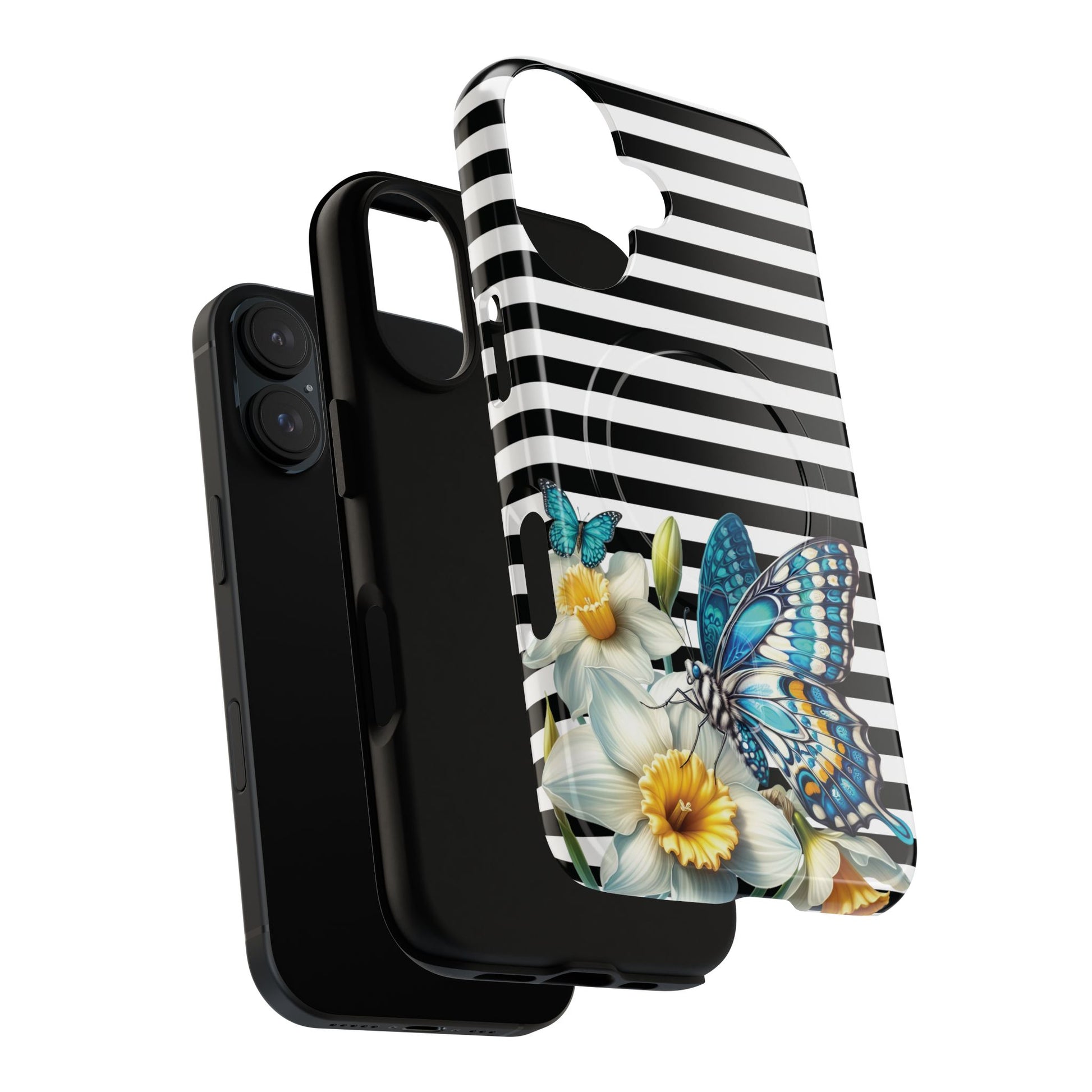 Daffodil Flutter Tough iPhone Magnetic Case A vibrant butterfly dances among fresh spring blooms on a bold striped canvas.