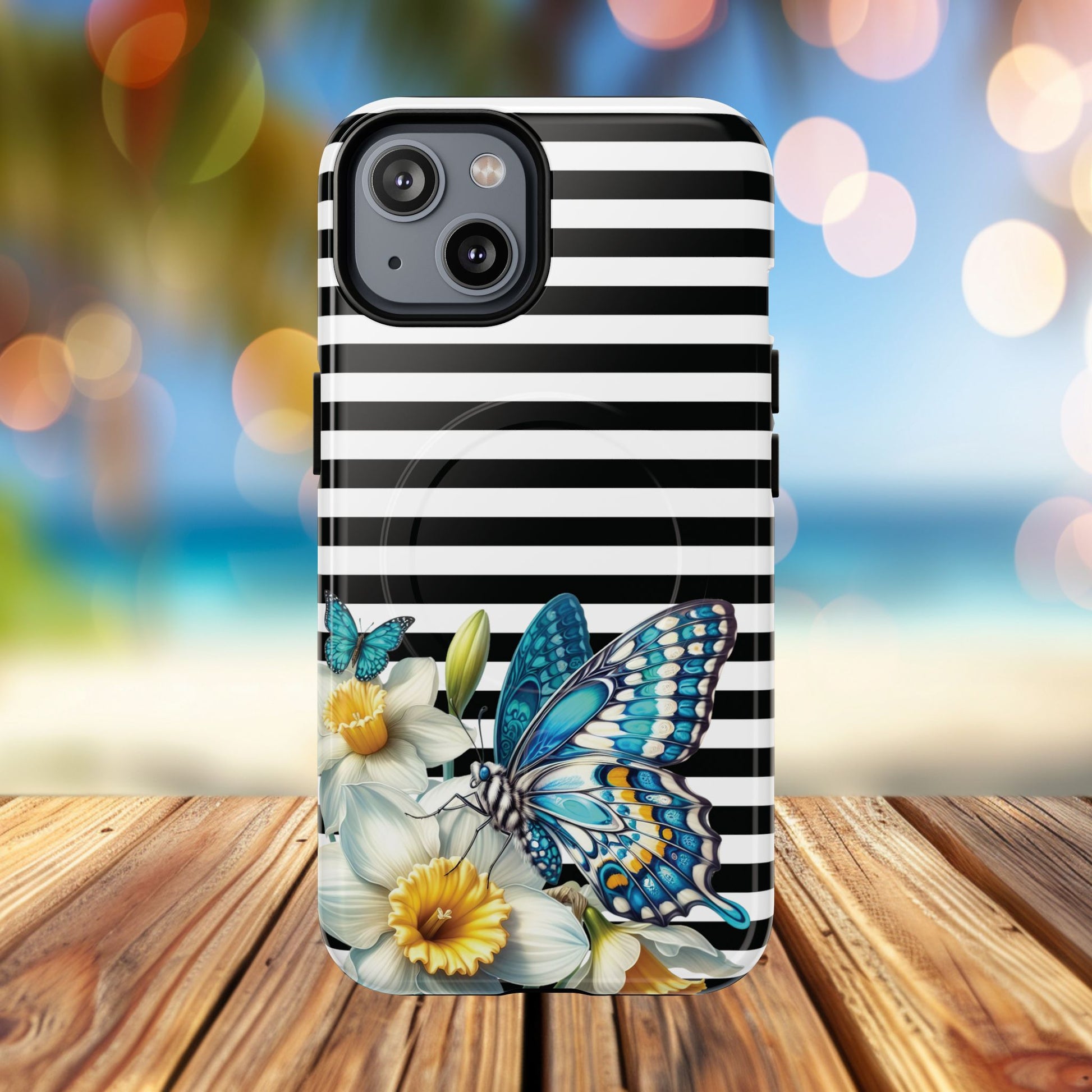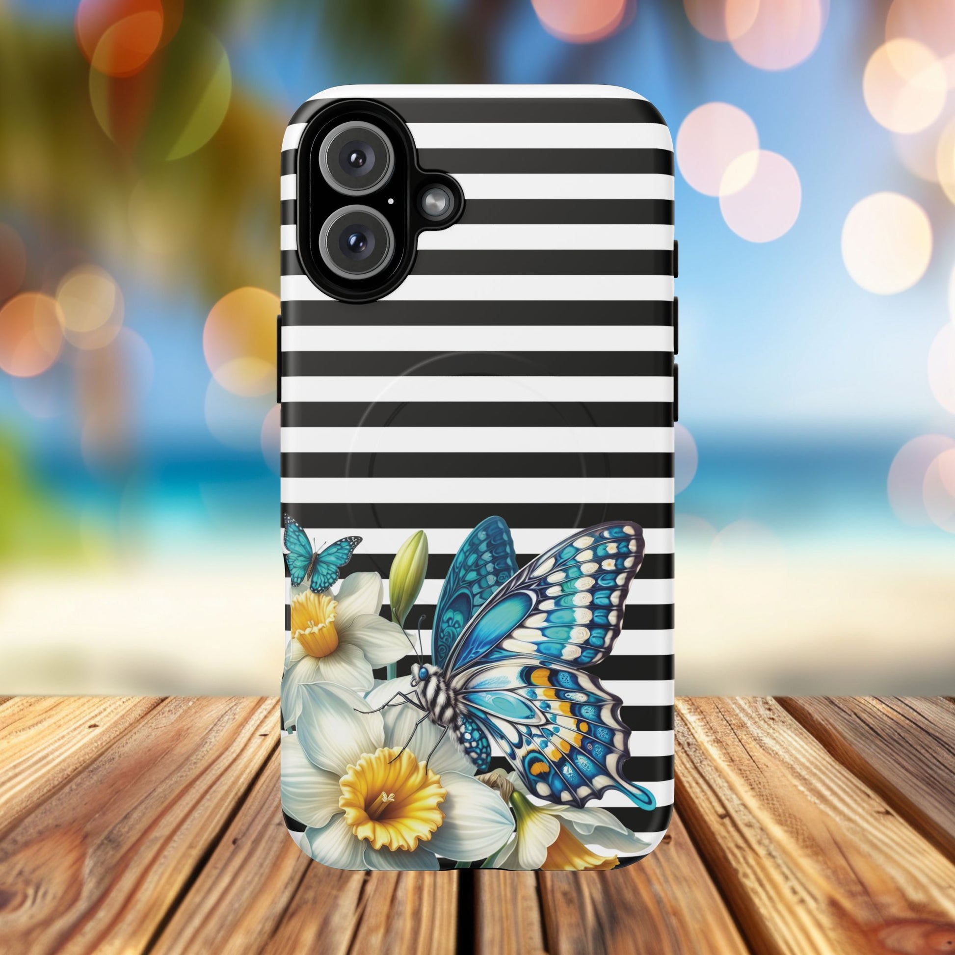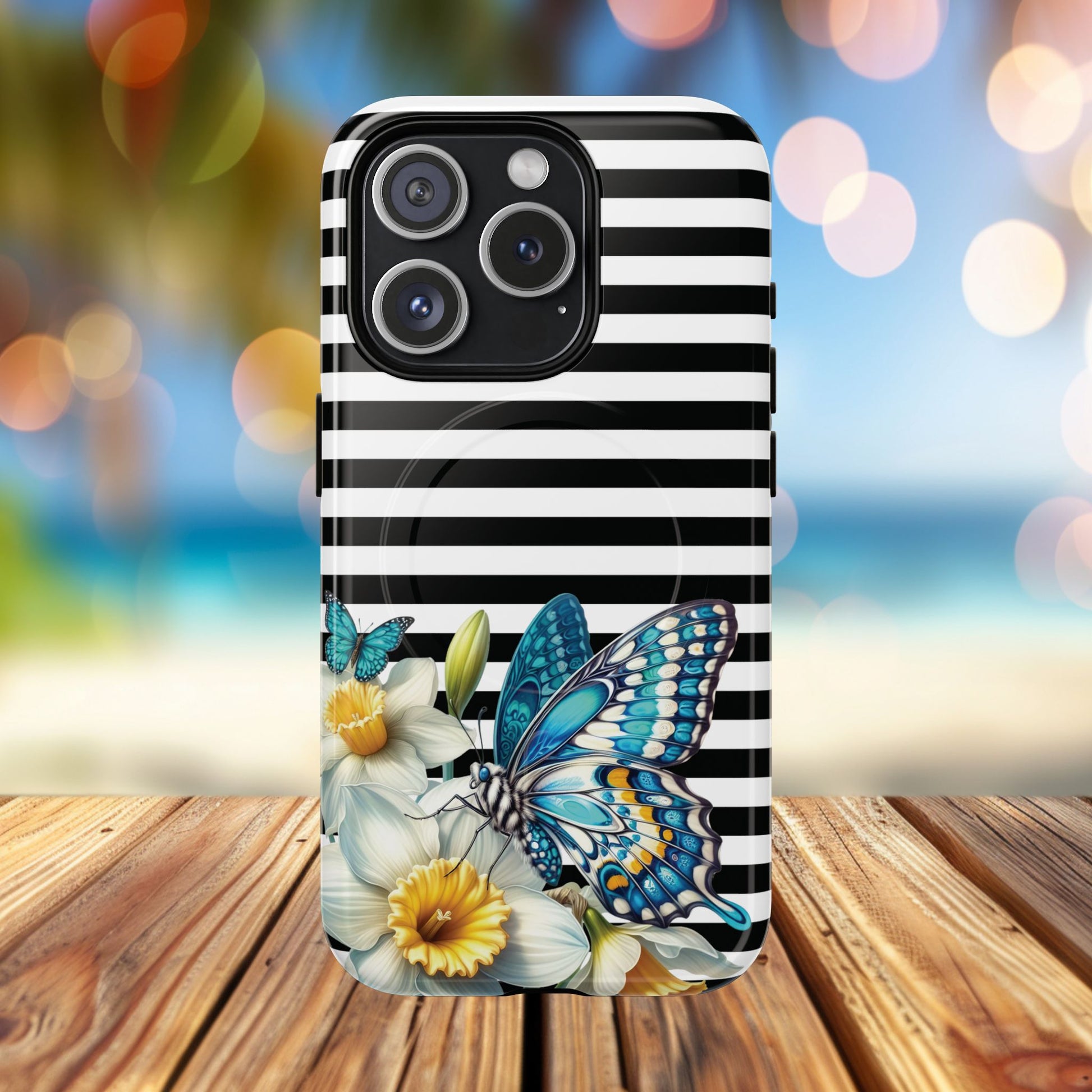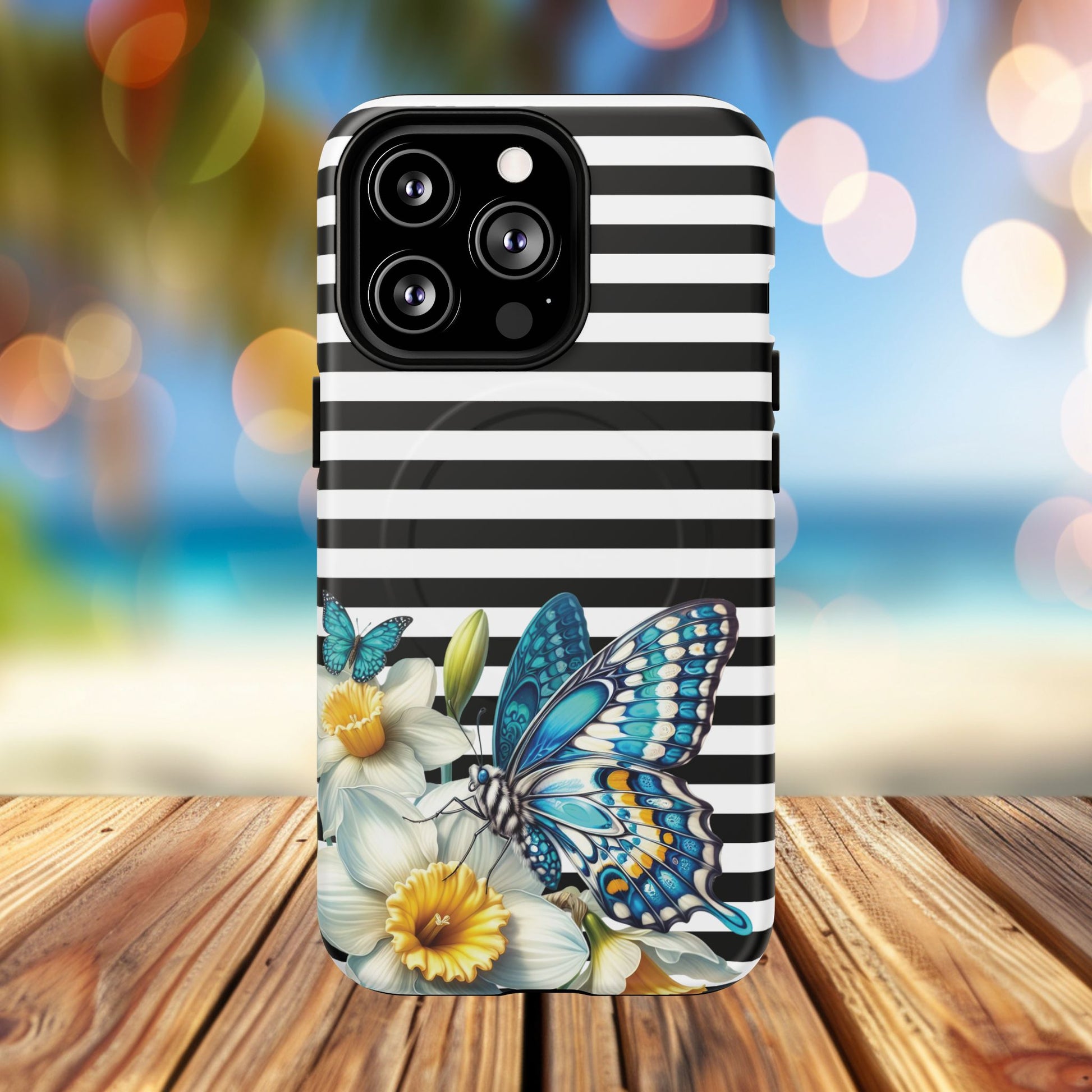 Daffodil Flutter Tough iPhone Magnetic Case A vibrant butterfly dances among fresh spring blooms on a bold striped canvas.