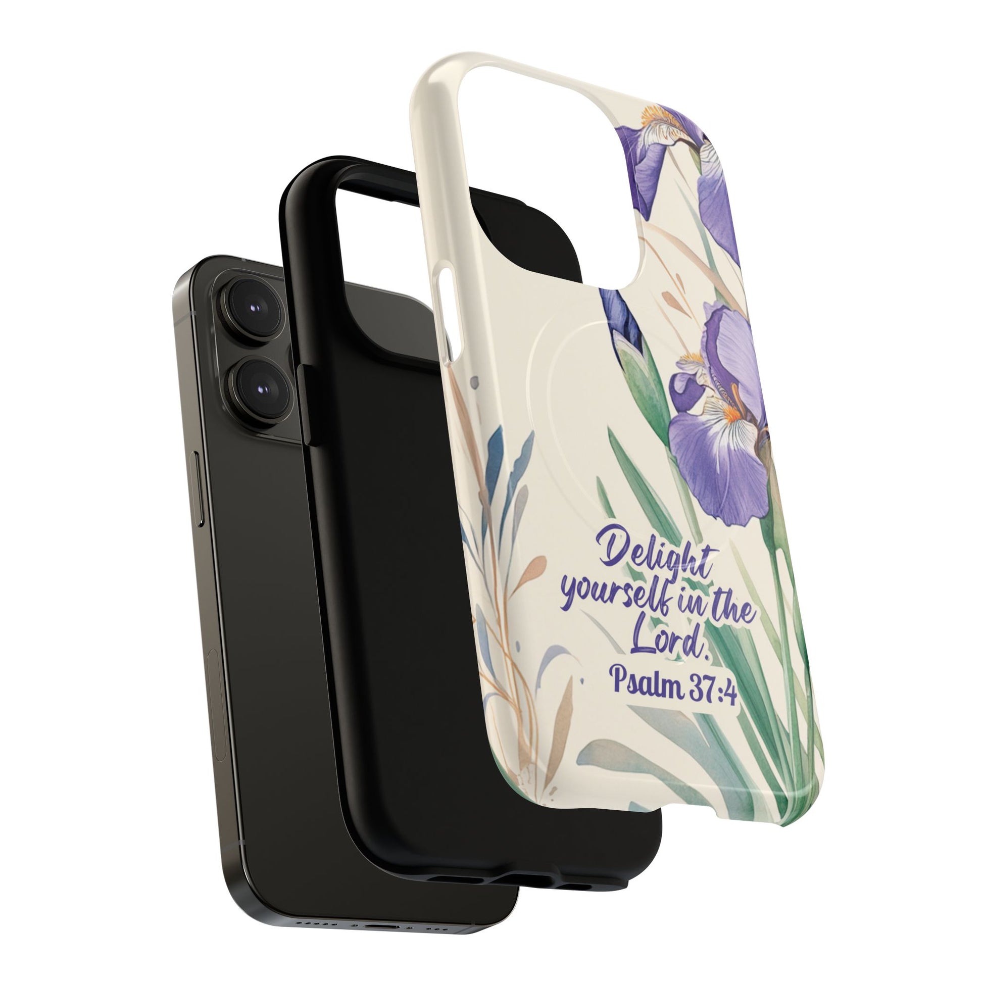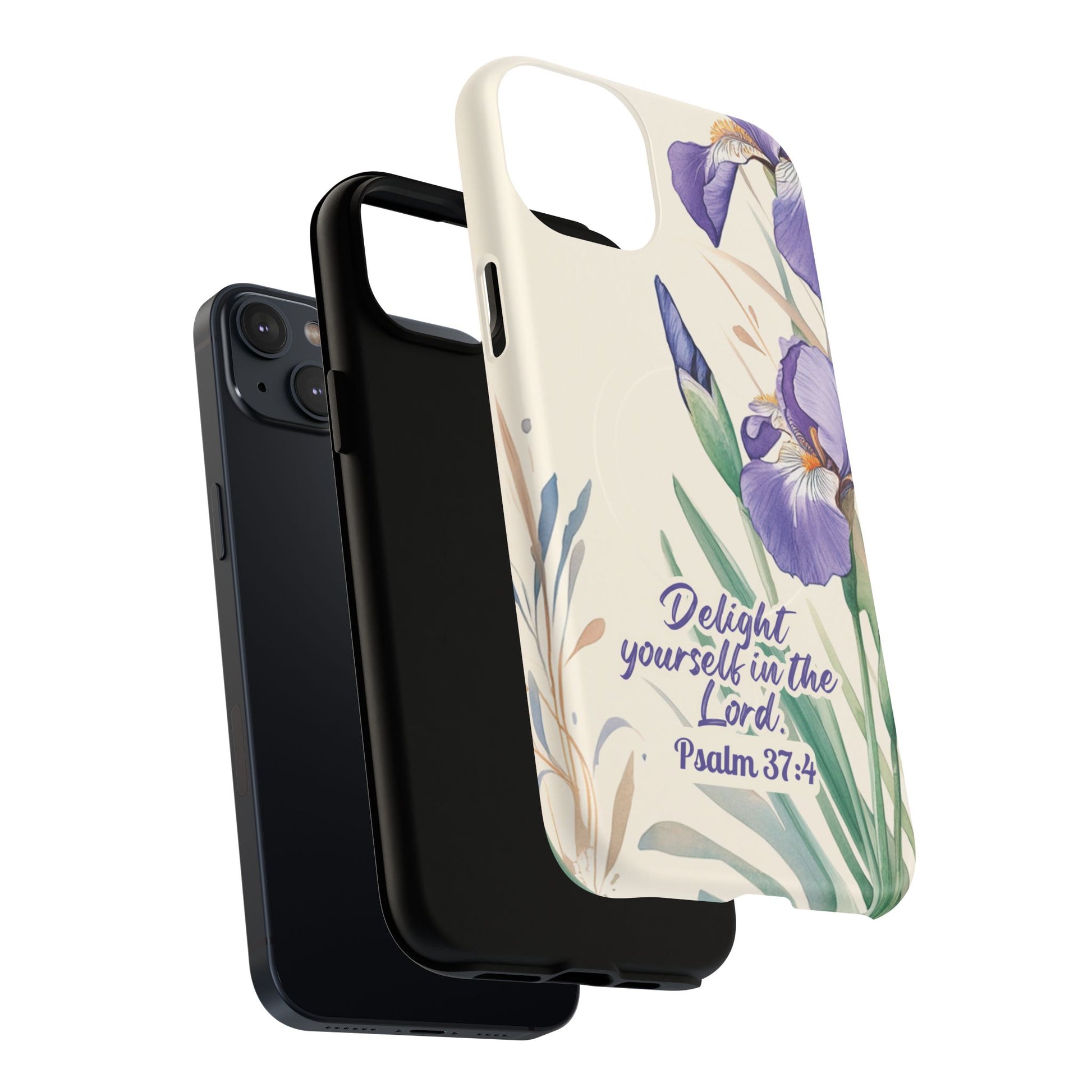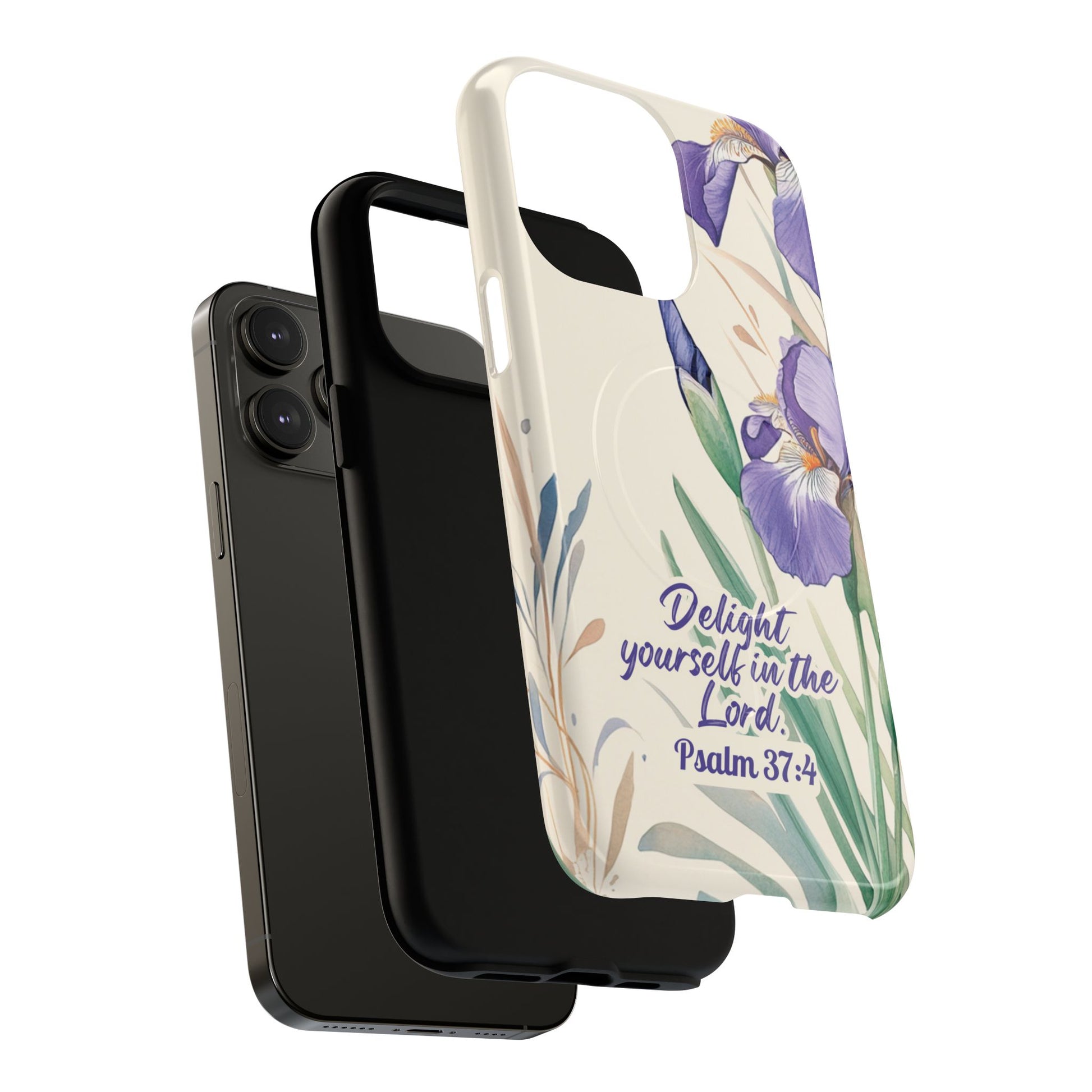 Delight yourself in the Lord Psalm 37:4, Inspirational Gift, iPhone Magnetic Case Scripture, Floral Bible Verse, MagSafe® iPhone® Tough Case, iPhone 14, iPhone 15, iPhone 16, Pro, Pro Max, Plus.