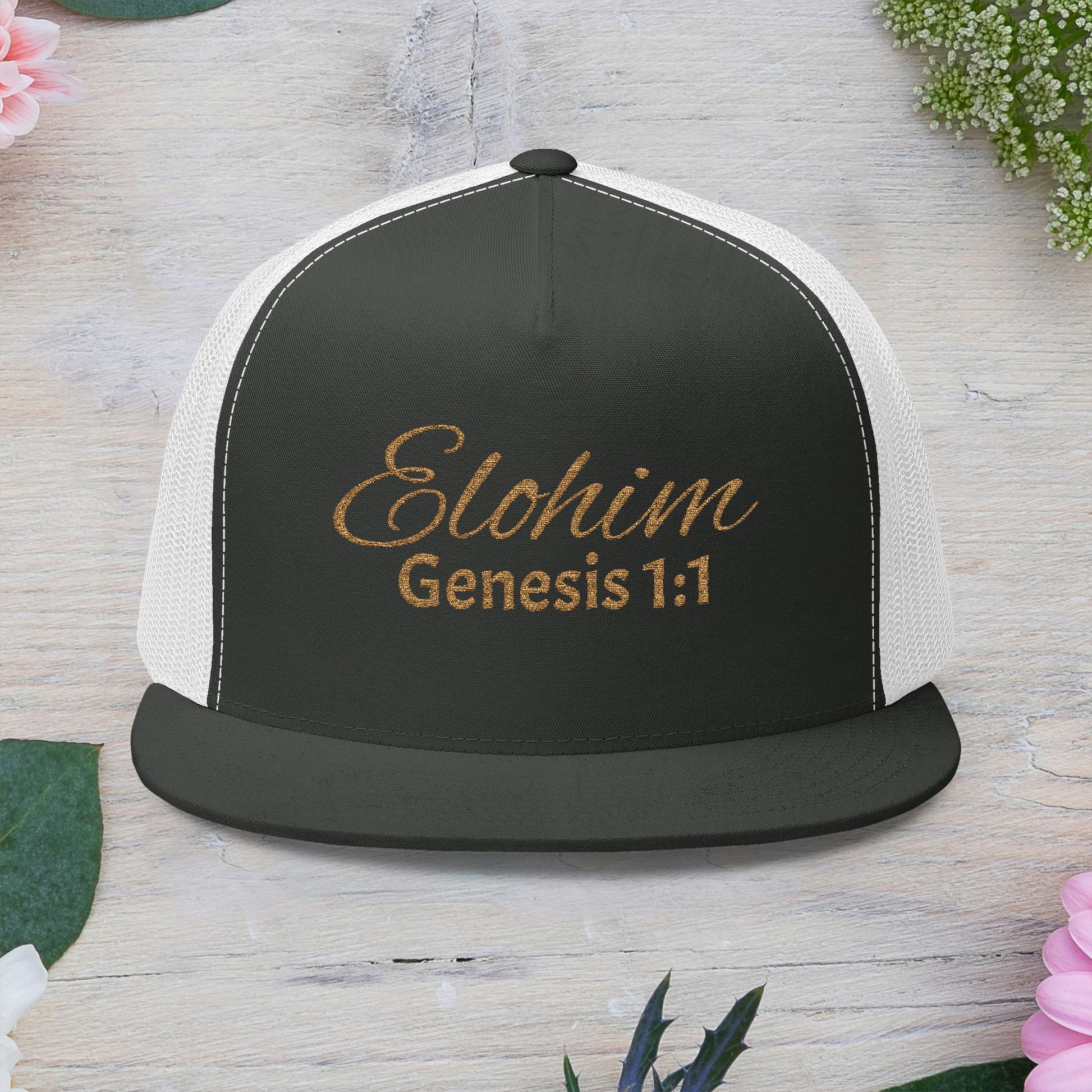 'ELOHIM, GENESIS 1:1' Embroidered 5 Panel Trucker Cap | Casual Style Hat, Adjustable, Unisex, Perfect Gift for Outdoors, Festivals, Daily Wear