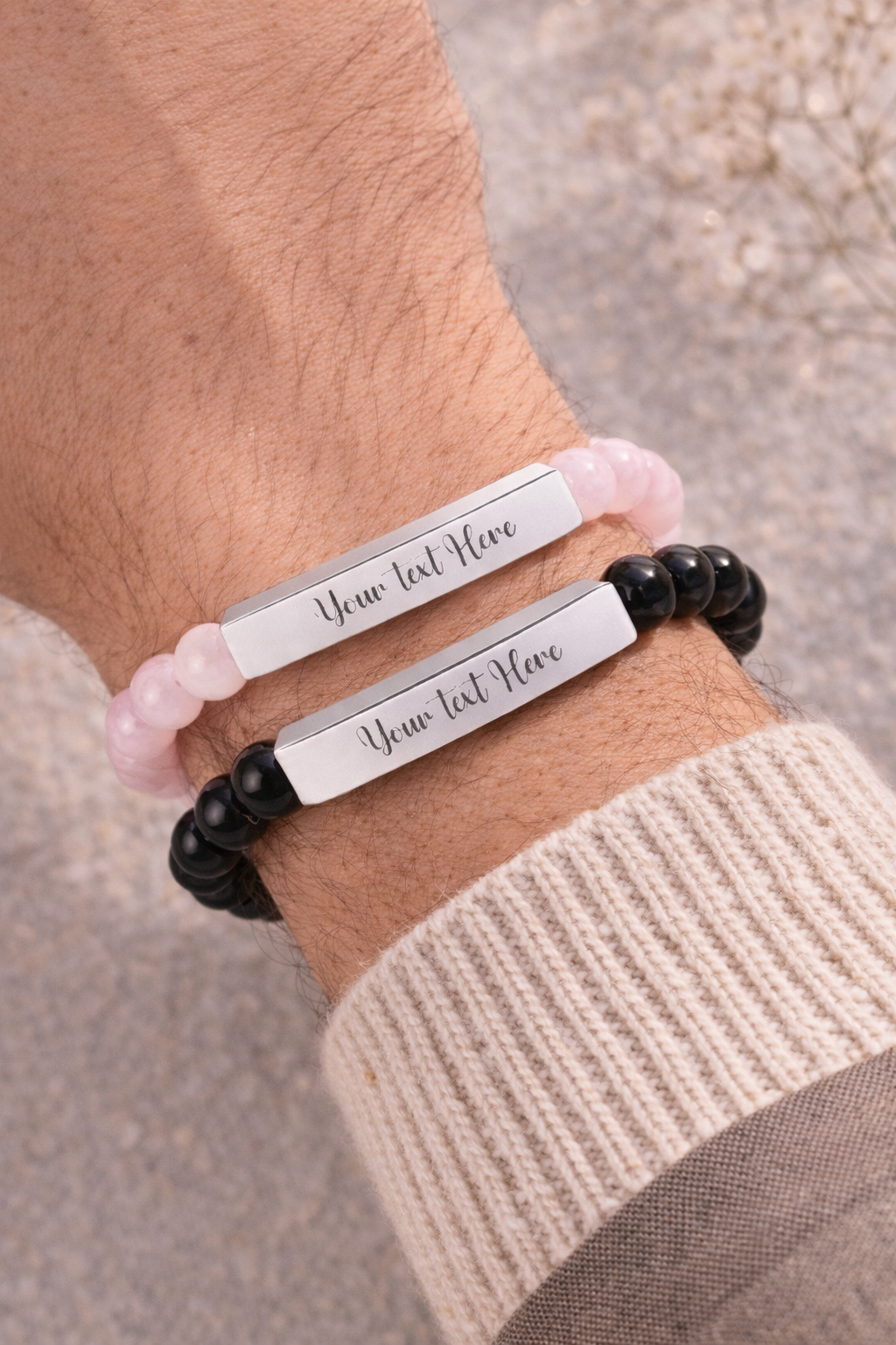 Smooth, grounding, and quietly elegant — this stretch stone bracelet brings natural calm to everyday wear. Polished round beads in soft neutral tones wrap the wrist with a comfortable, flexible fit. A low-profile stainless steel bar sits at the front with a crisp engraved line for a subtle personal touch. Wear it alone for a minimalist look or stack it with other bracelets to add texture and an earthy accent to casual and refined outfits alike. Each piece arrives in a white gloss jewelry box with non-tarnish cotton fiber, ready to be slipped into a jewelry rotation or kept safe between wears.
