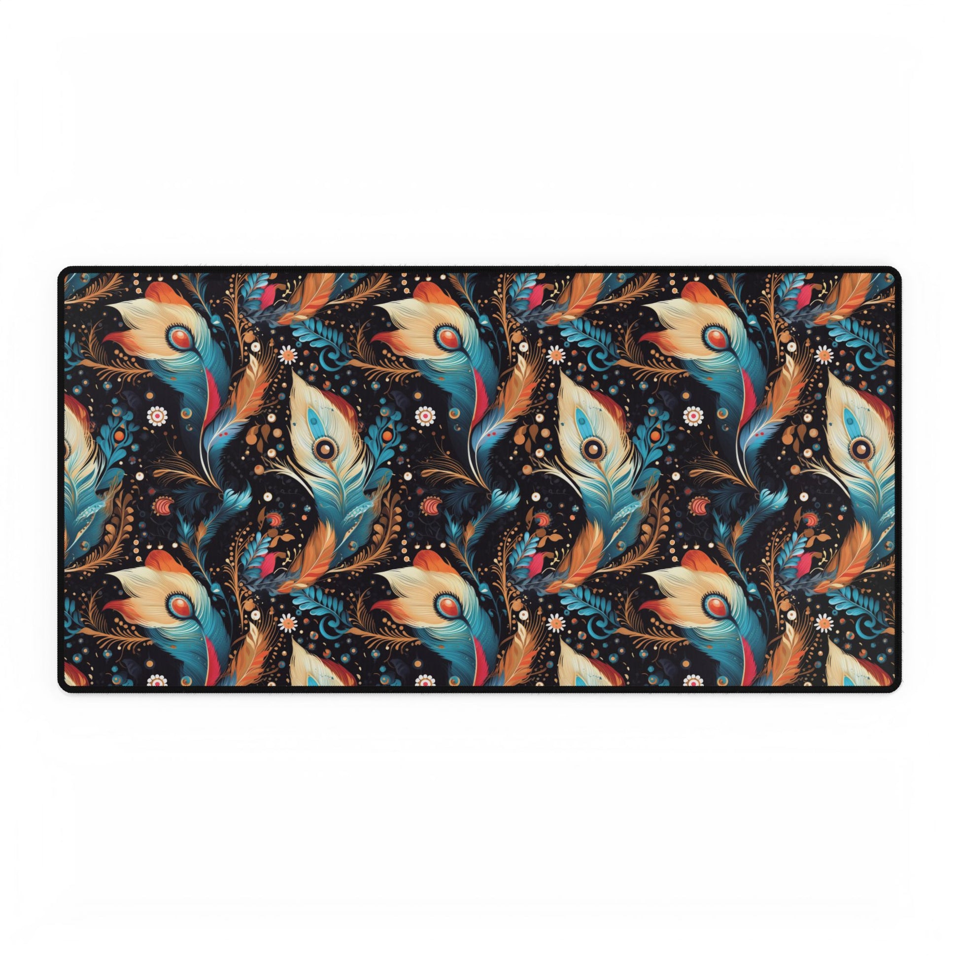 Elevate your workspace with the Ethereal Feathers Desk Mat, a perfect blend of functionality and style designed to inspire your daily tasks. This desk mat adds a touch of cool sophistication with its intricate patterns and rich colors, reflecting the beauty and serenity of nature. Not only does it enhance your desk's aesthetic, but it also serves a practical purpose by protecting your surface from scratches and stains.