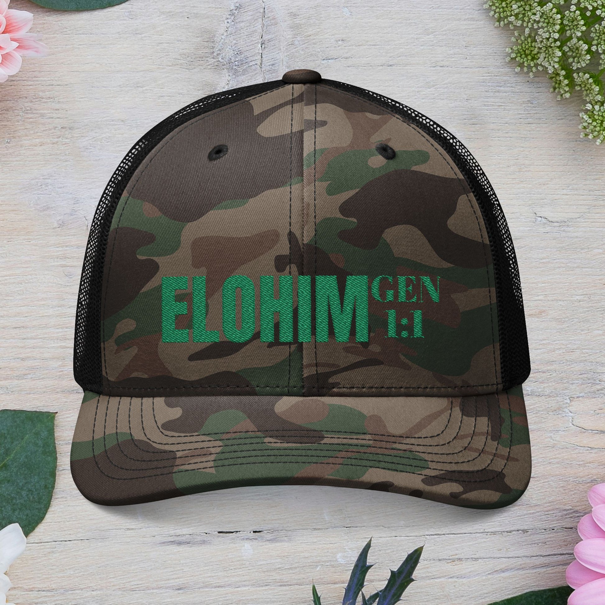 Green Camouflage Embroidered Trucker Hat with 'ELOHIM, GENESIS 1:1', Casual Style Hat, Adjustable, Unisex, Perfect Gift for Outdoors, Festivals, Daily Wear.