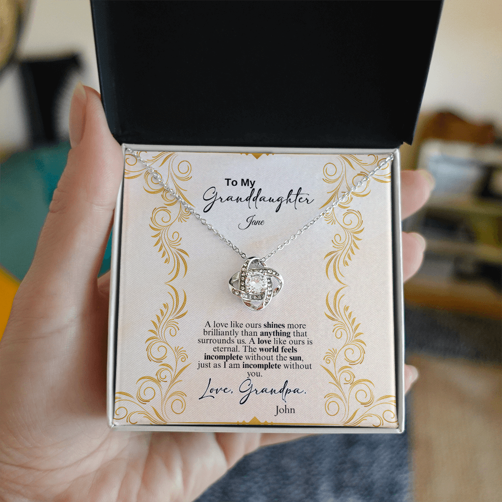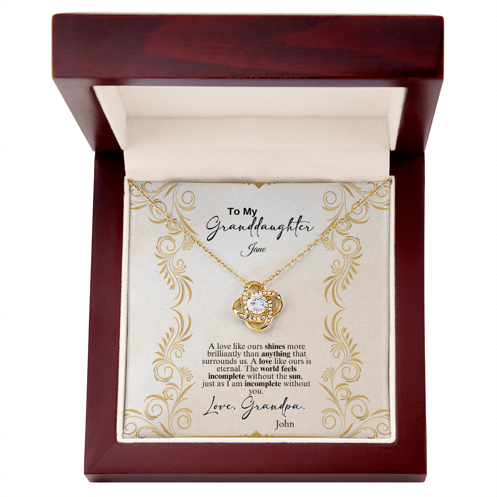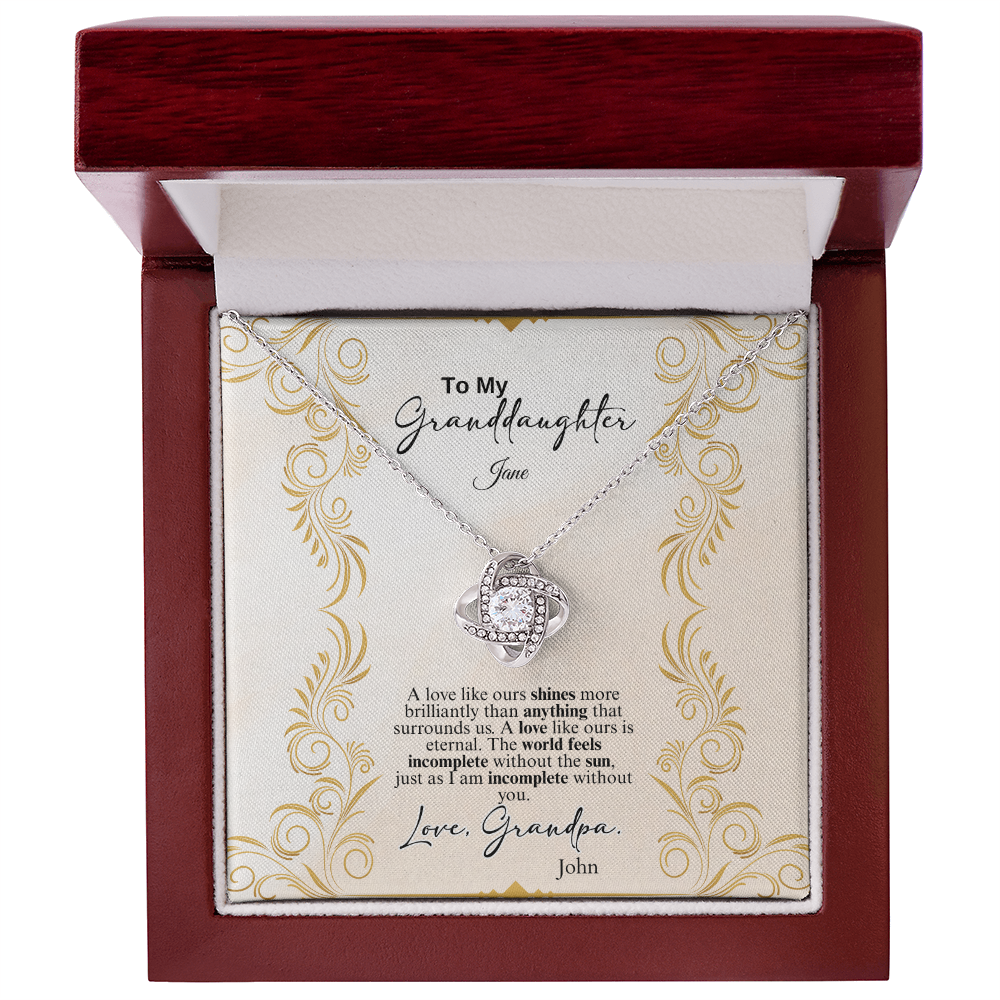 To My Granddaughter, A love like ours shines more brilliantly than anything that surrounds us. A love like ours is eternal. The world feels incomplete without the sun, just as I am incomplete without you. Love Grandpa.