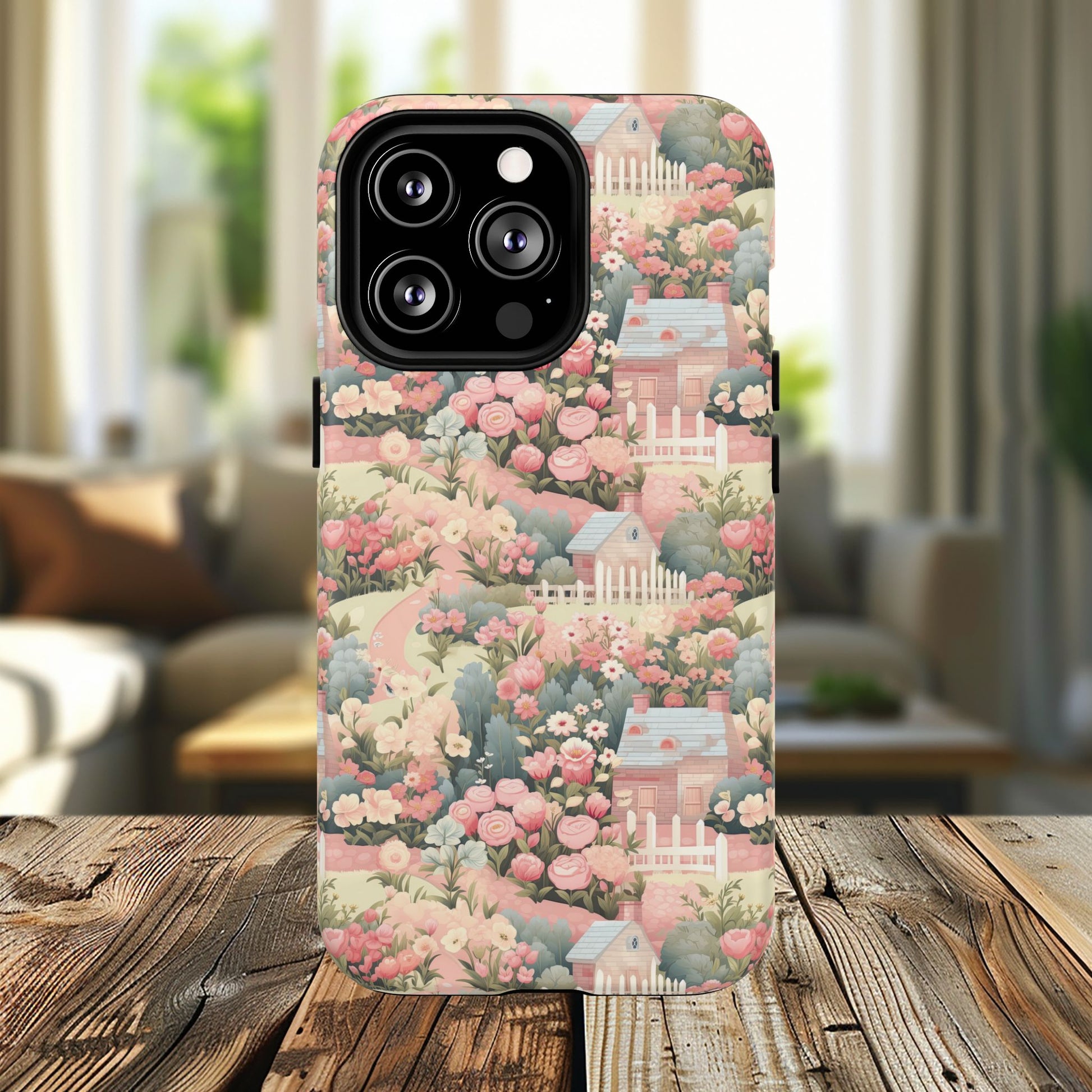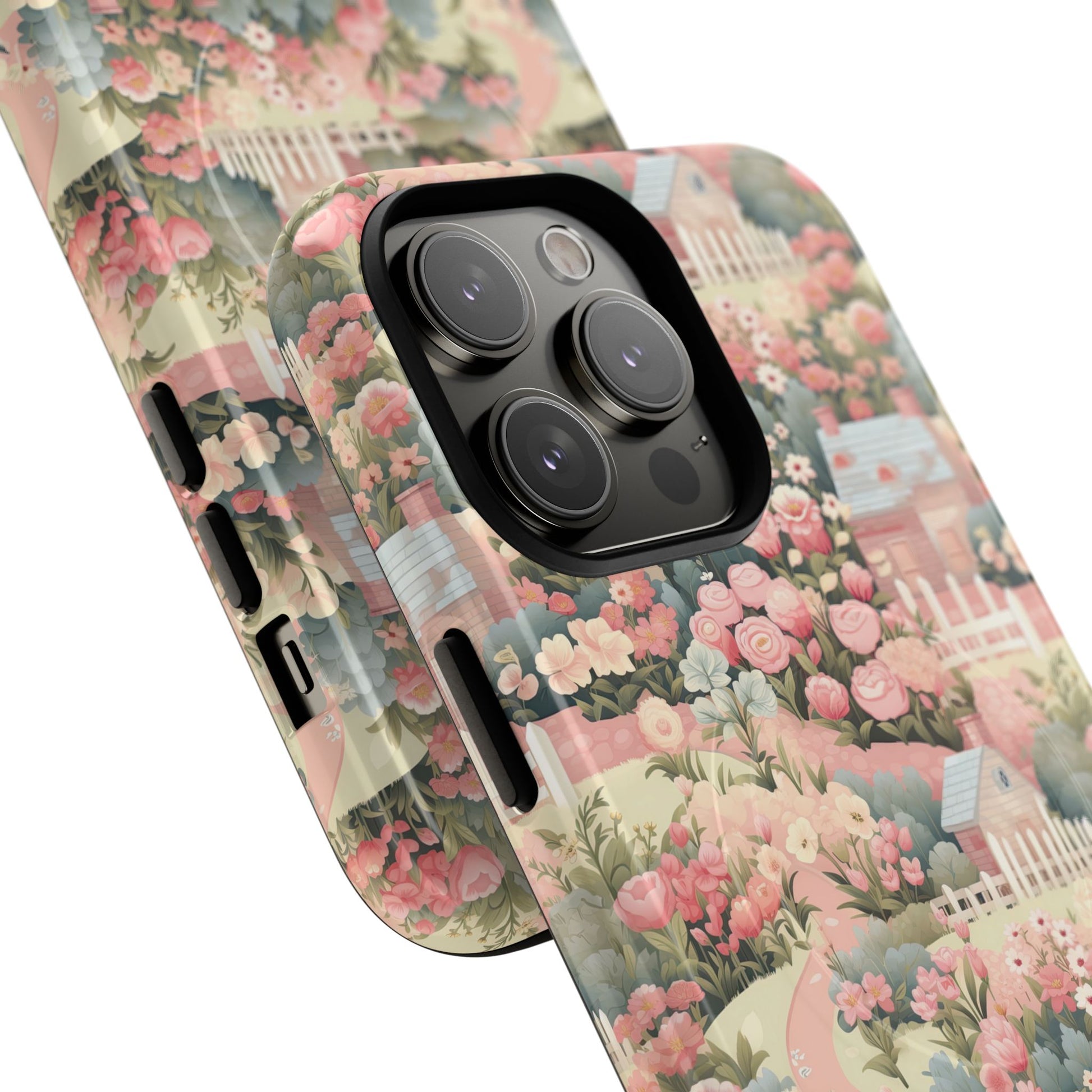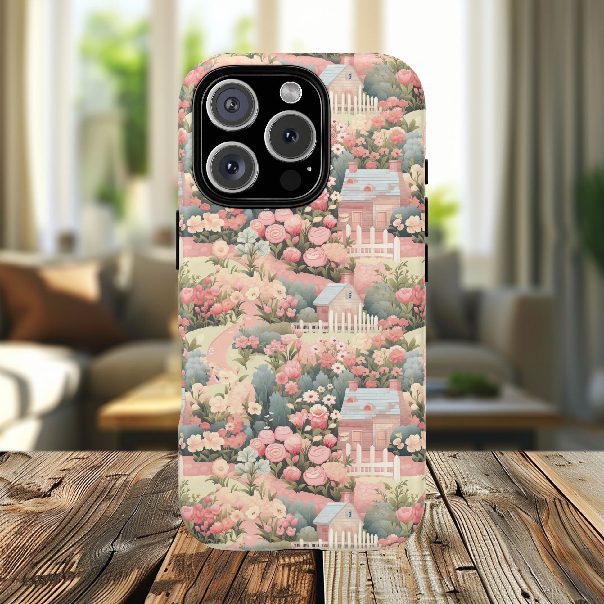 Pastel Garden Haven Tough iPhone Magnetic Case A cozy countryside escape with floral bliss and charming cottages in every corner.