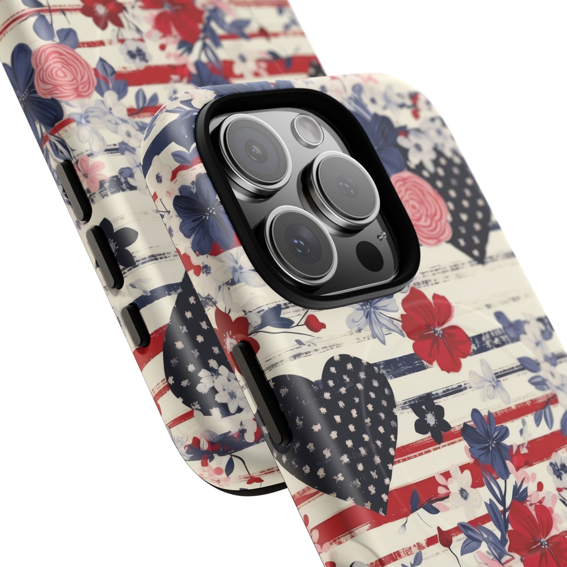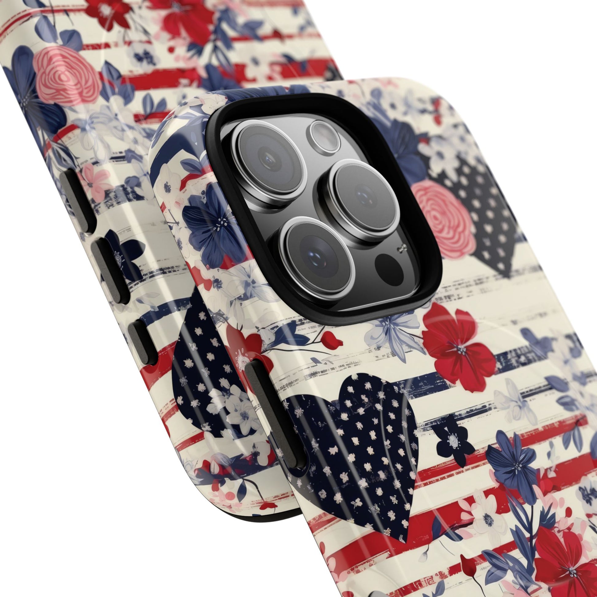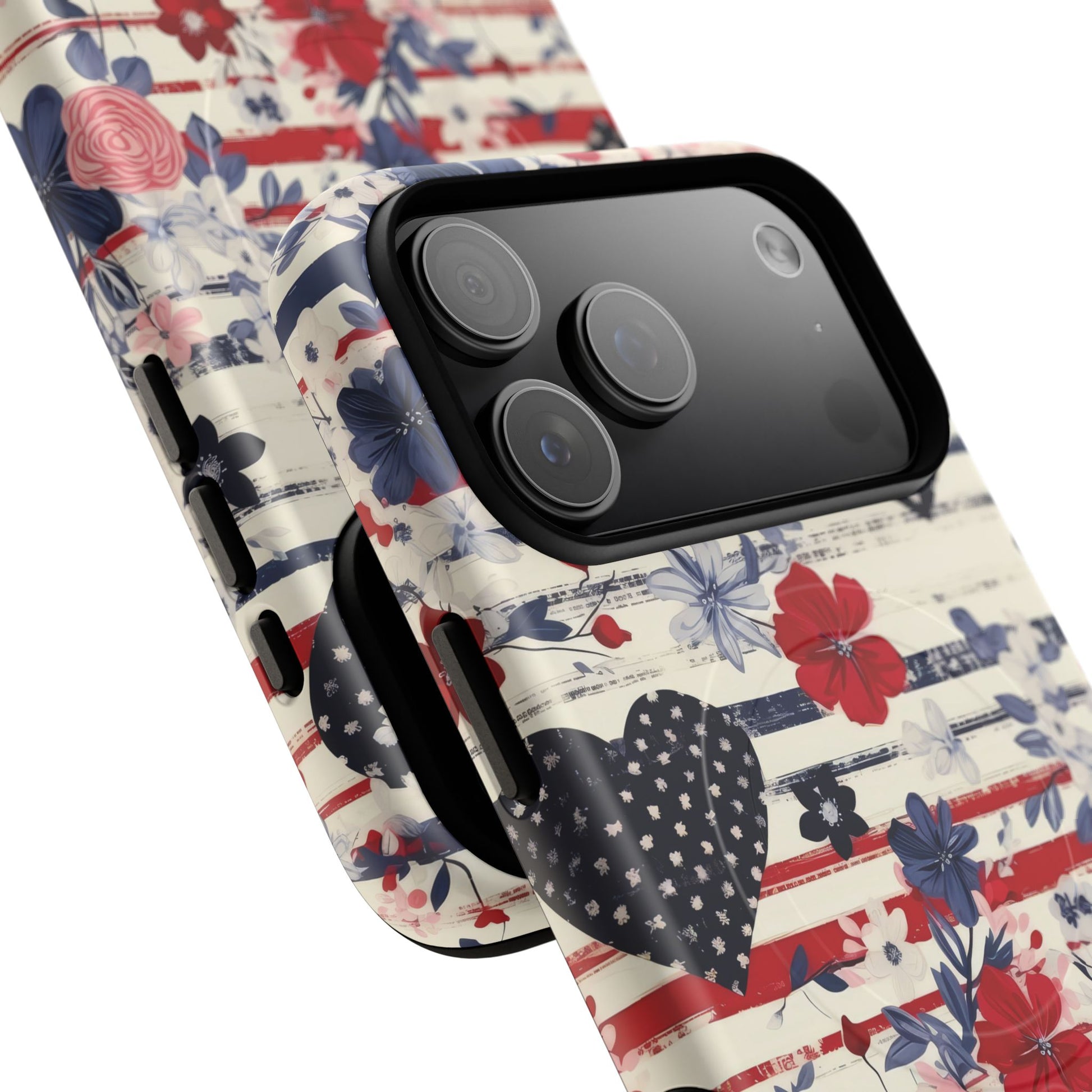 Hearts & Stripes Bloom Tough iPhone Magnetic Case A charming fusion of love, liberty, and lush florals in red, white, and blue.