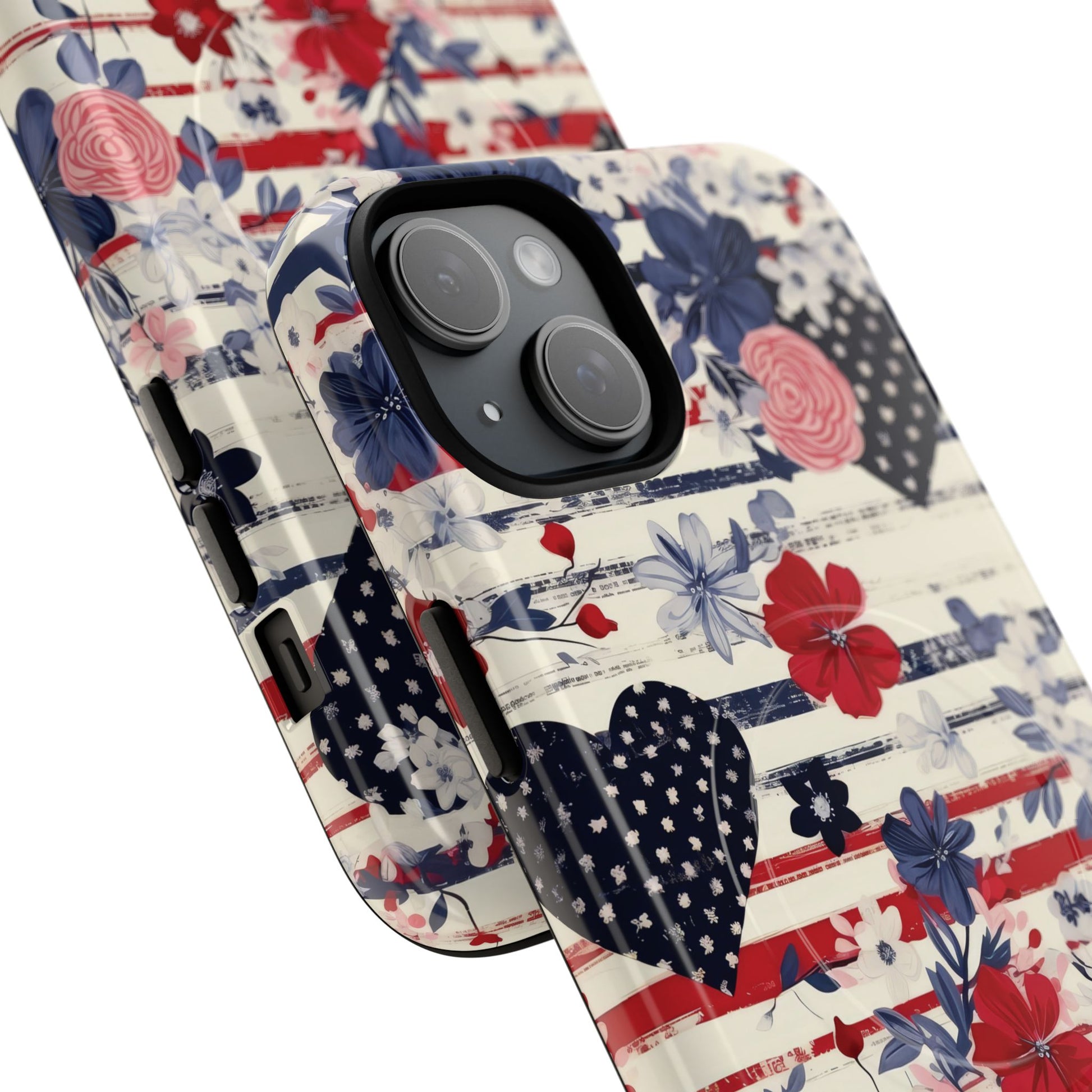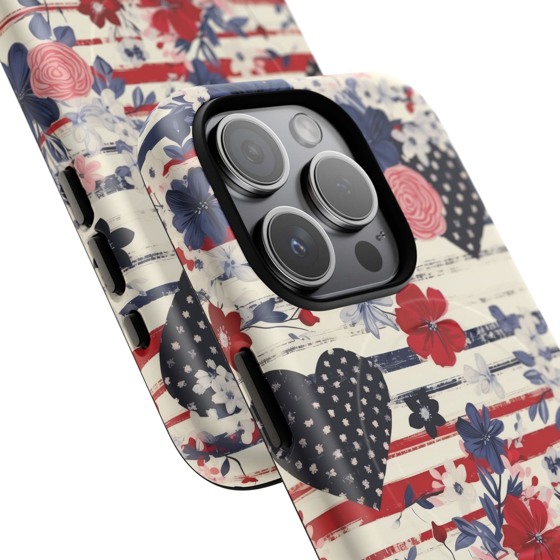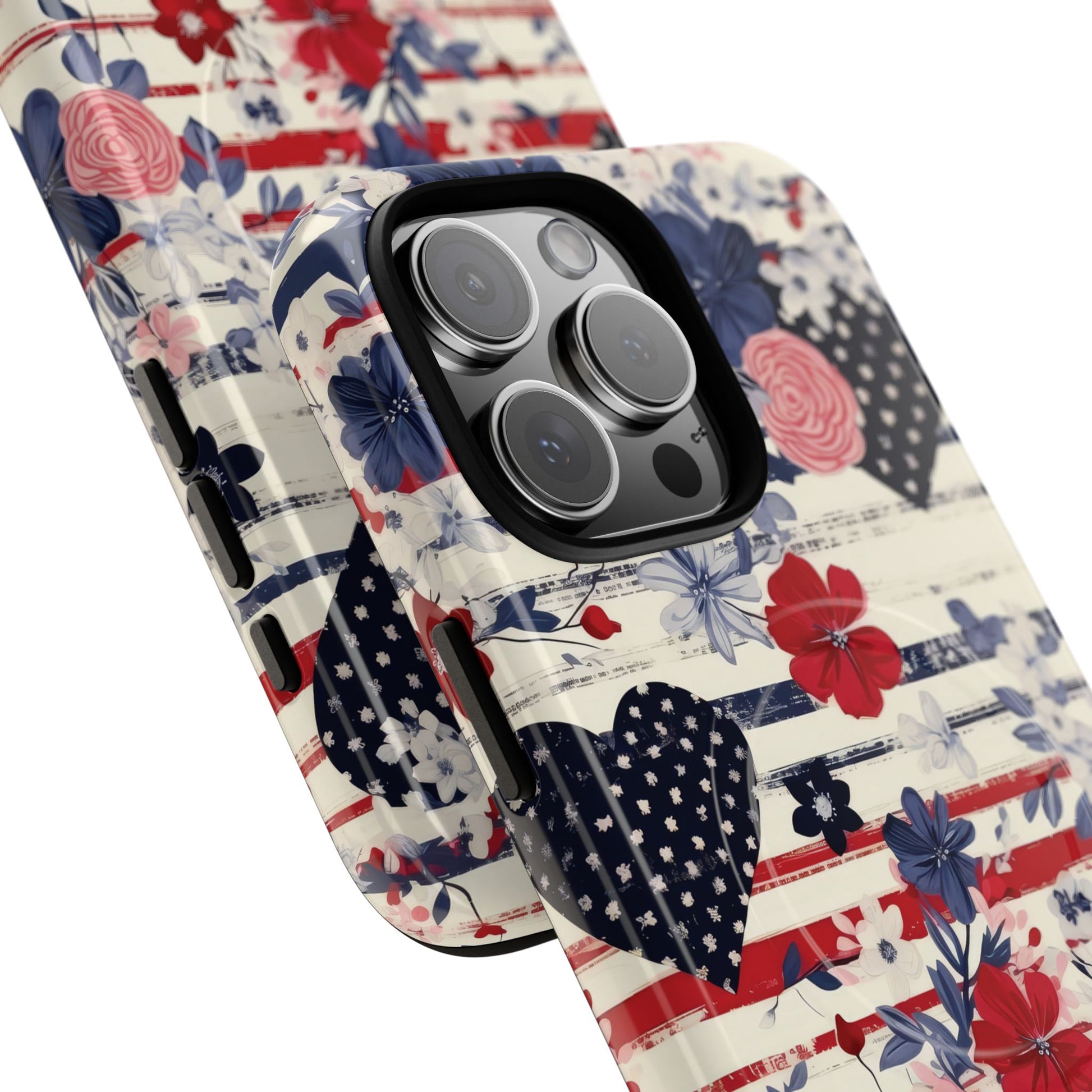 Hearts & Stripes Bloom Tough iPhone Magnetic Case A charming fusion of love, liberty, and lush florals in red, white, and blue.