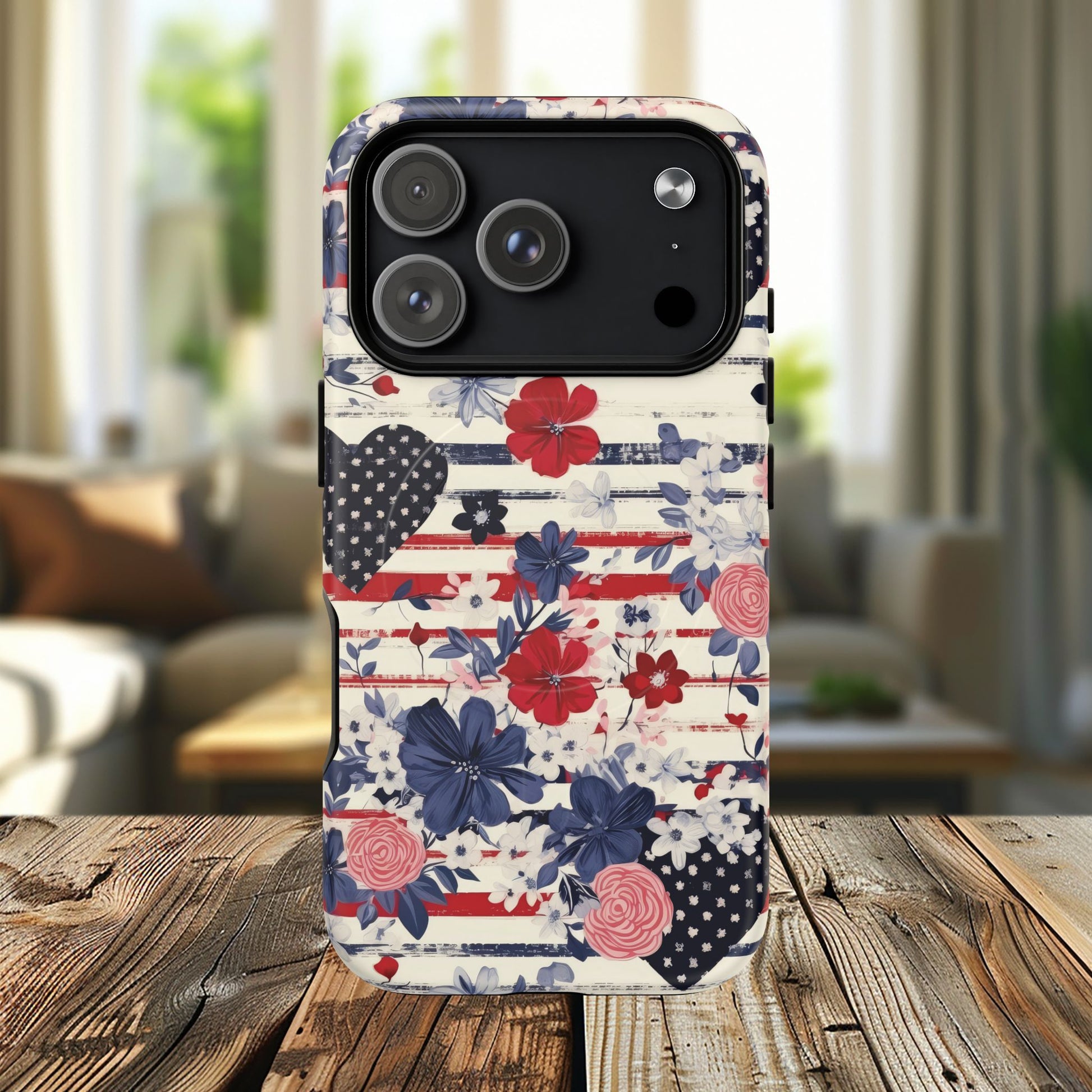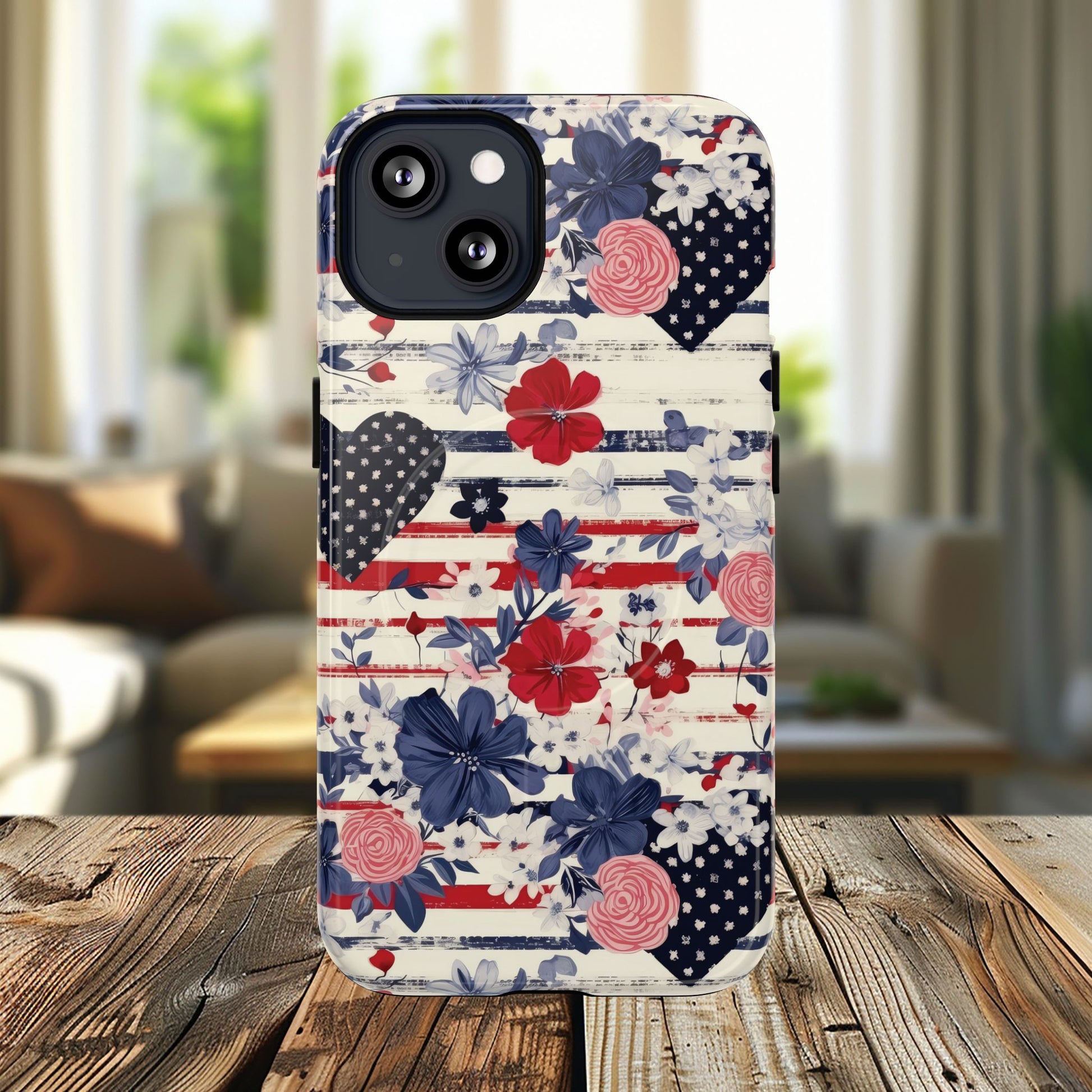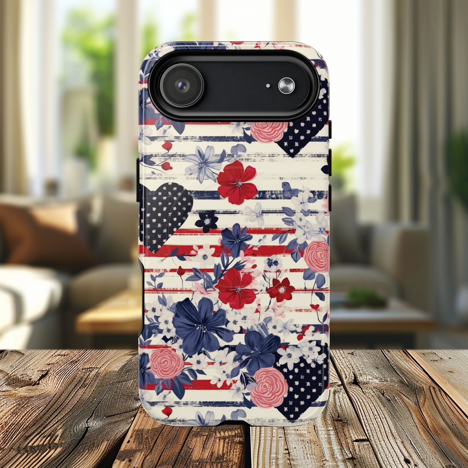 Introducing our Tough iPhone Magnetic Cases, the perfect blend of style and protection. Designed to keep your phone safe while making a statement, these cases feature a vibrant floral and patriotic design that adds a splash of personality to your device. Ideal for anyone who values both aesthetics and durability, these cases seamlessly fit into the daily lives of busy professionals and students alike. Whether you're out at a gathering or relaxing at home, this case enhances your style while offering peace of mind. Perfect for celebrating holidays like Independence Day or other occasions where you want to show off your love for the country, heeding admiration from family and friends. Elevate your phone's protection with a case that doesn't compromise on looks!