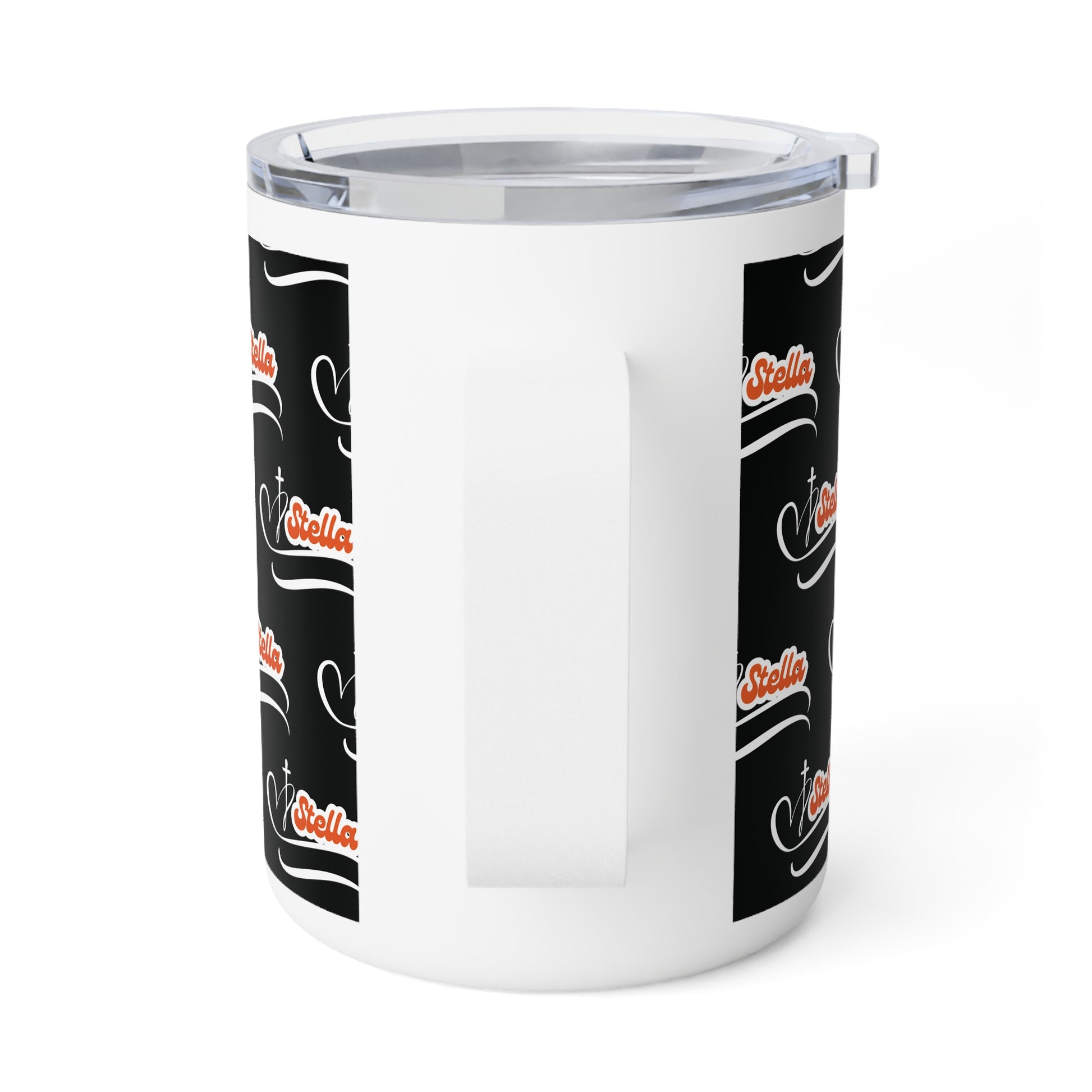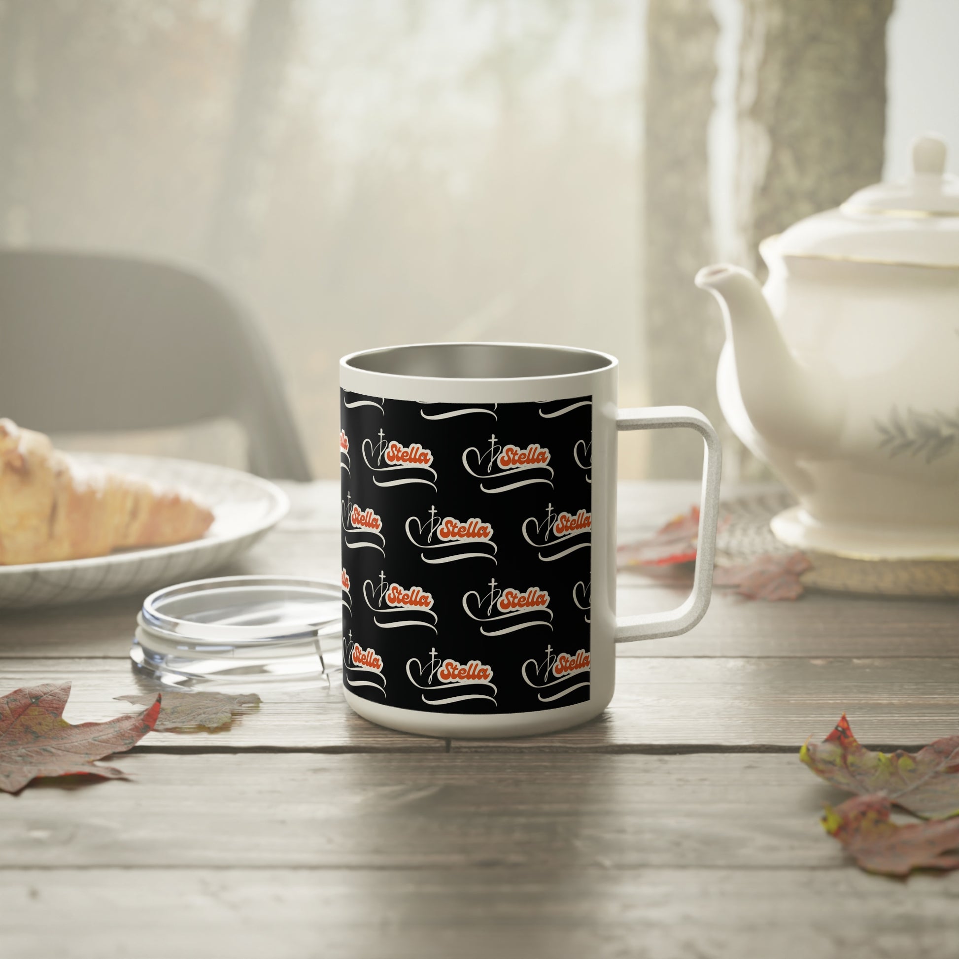 This 10oz insulated coffee mug brings warmth and personality to quiet mornings and busy commutes. The double-wall stainless steel keeps your drink hot while preventing condensation on the outside. A clear, push-on acrylic lid helps reduce spills and lets you see how much is left. The glossy, full-wrap design shows off a playful repeated logo motif on a deep black background — a bold, friendly look that stands out on a crowded desk or in a car cup holder. Lightweight and sturdy, it slips into backpacks and tote bags easily and cleans up with a quick hand wash. BPA- and lead-free construction means you can sip with confidence every day.