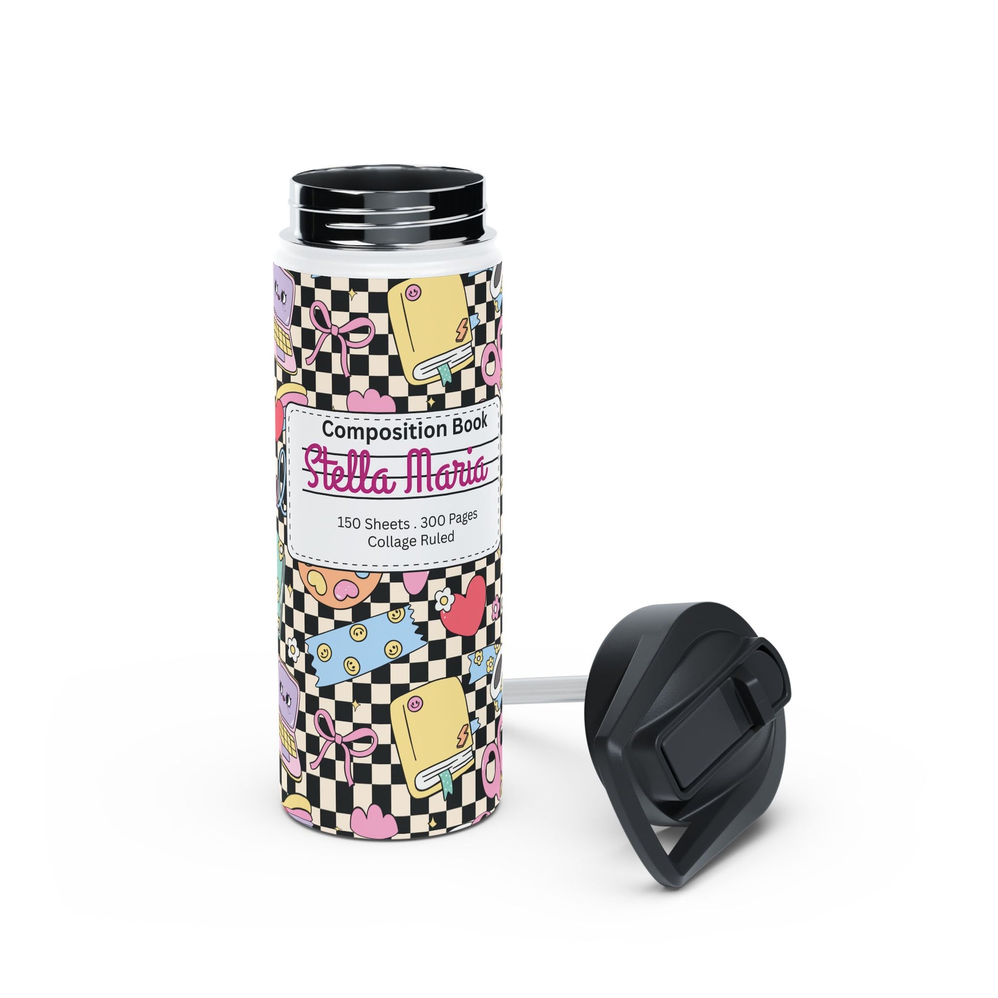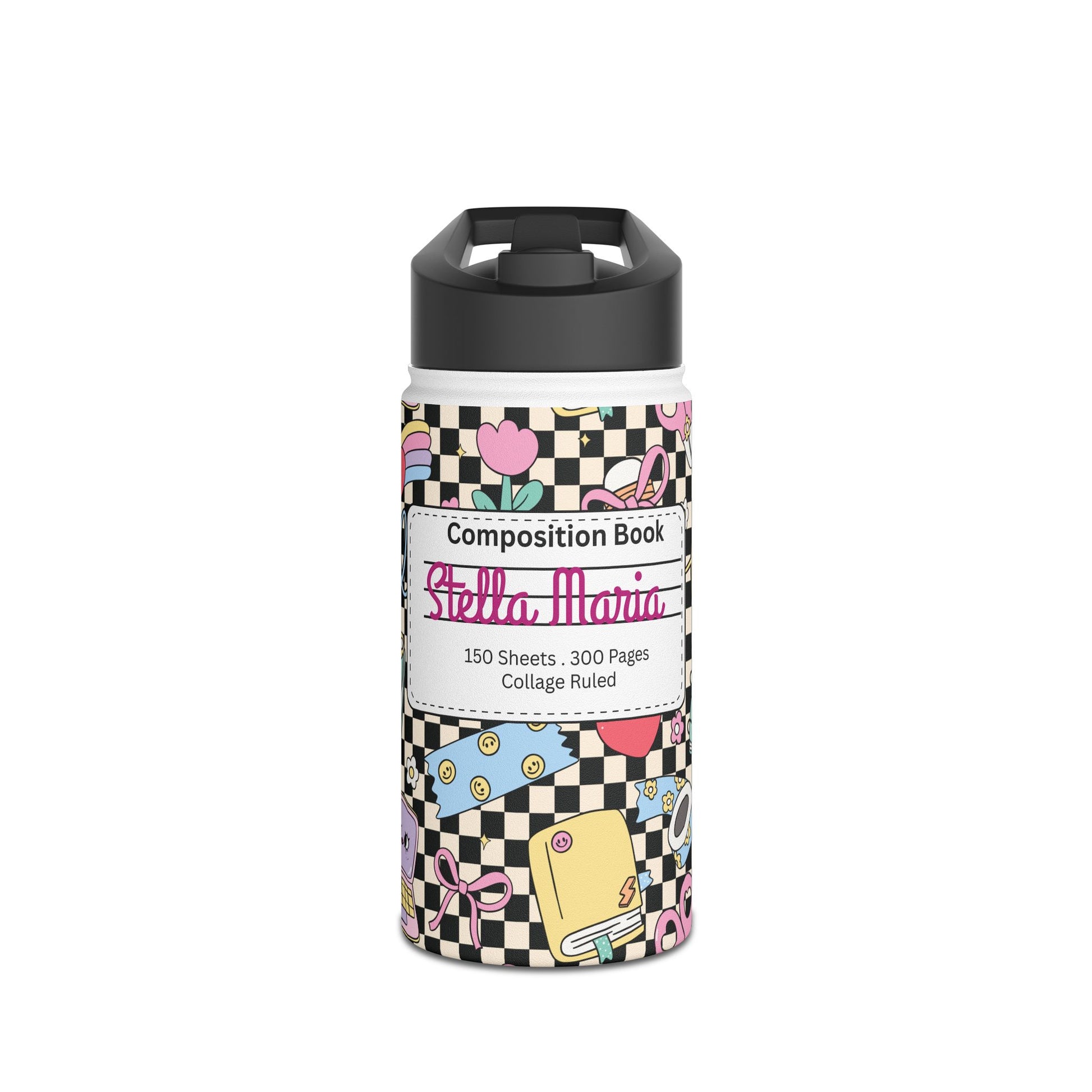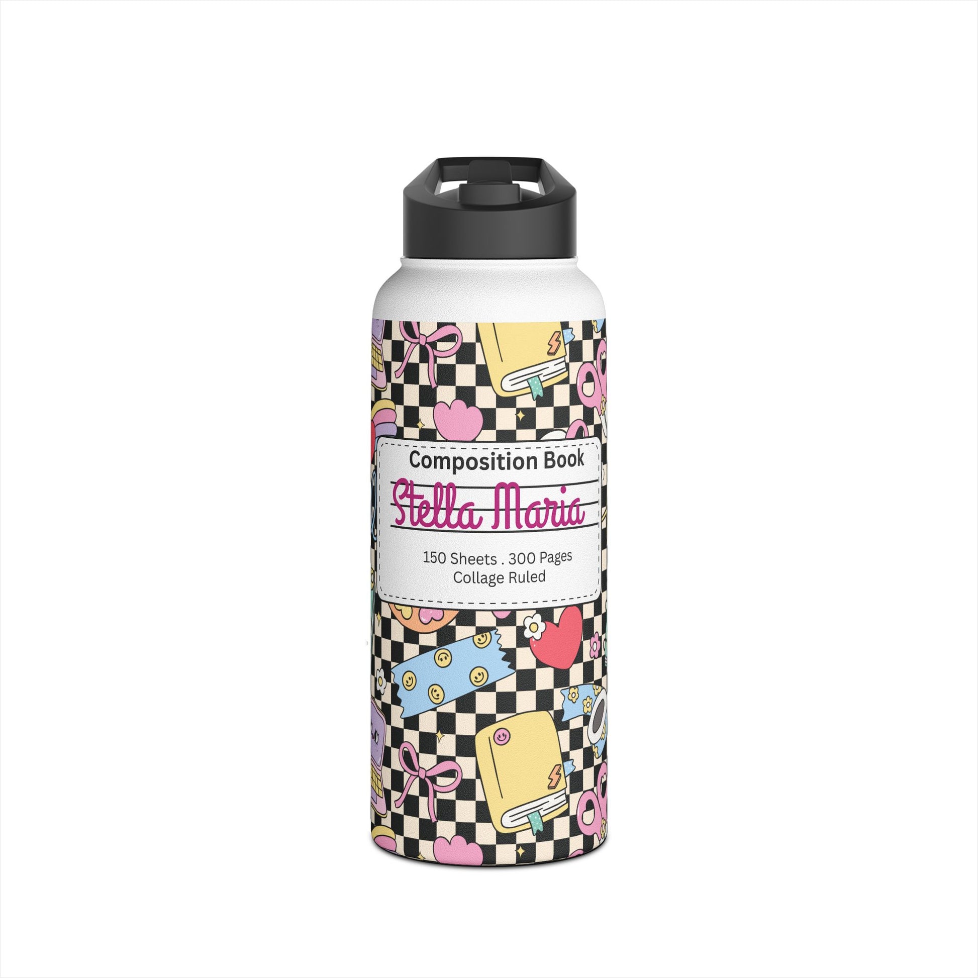 Personalized Black Doodle Daydream Composition Book Inspired Stainless Steel Water Bottle for Kids, School Supplies, Eco-Friendly Drinkware, Back to School, Teacher Gifts