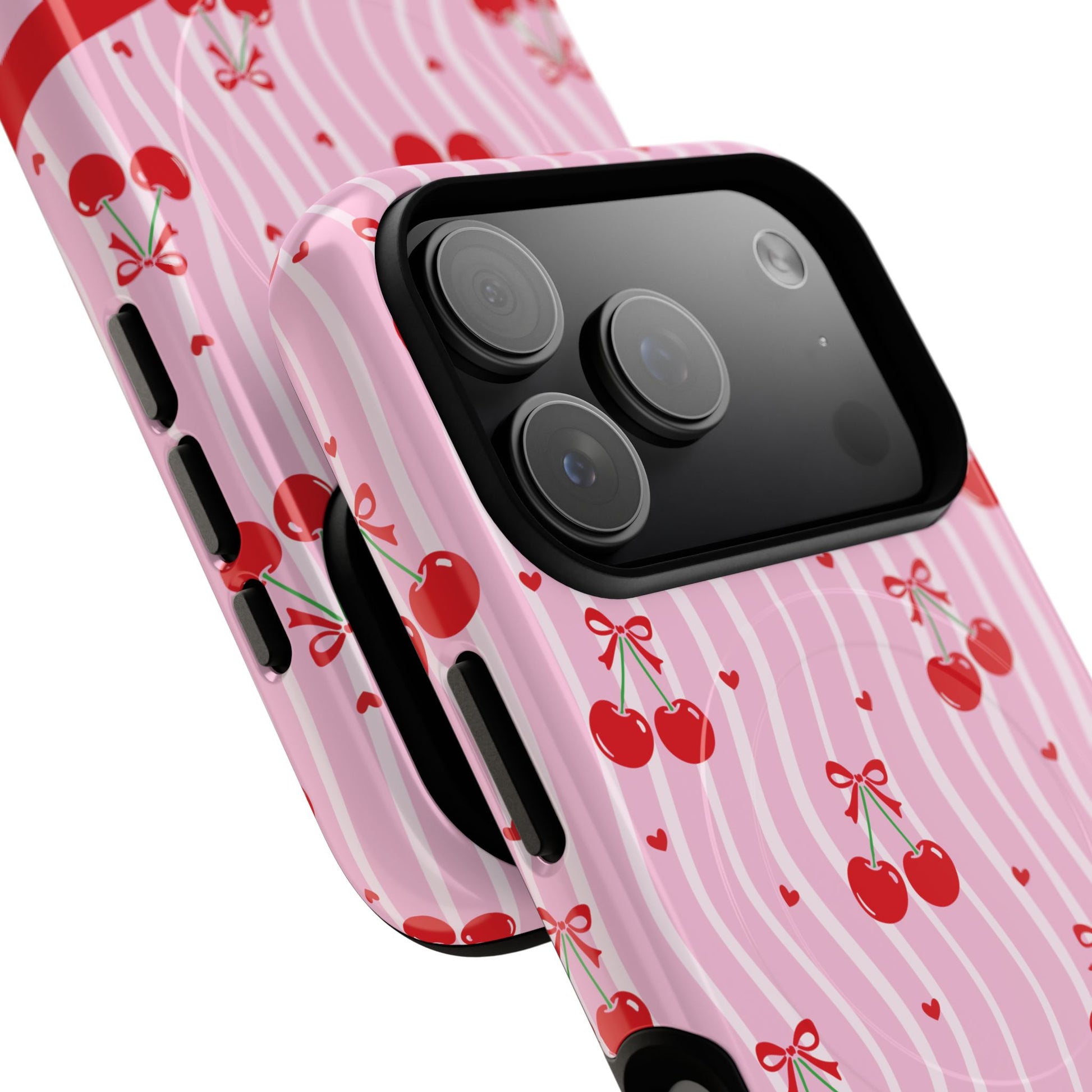 A slim, protective phone case that pairs joyful retro charm with modern MagSafe convenience. Lightweight yet durable, the dual-layer shell and TPU liner cushion everyday drops while the 3D wrap print gives bright, glossy cherries a soft, wavy-pastel background. Small hearts and bow-tied cherries lend a playful, feminine feel—finished with a diagonal band for optional personalization. Clear port cutouts and MagSafe-compatible magnetic module keep charging and connectivity simple, while the choice of glossy or matte lets you pick the look you love.