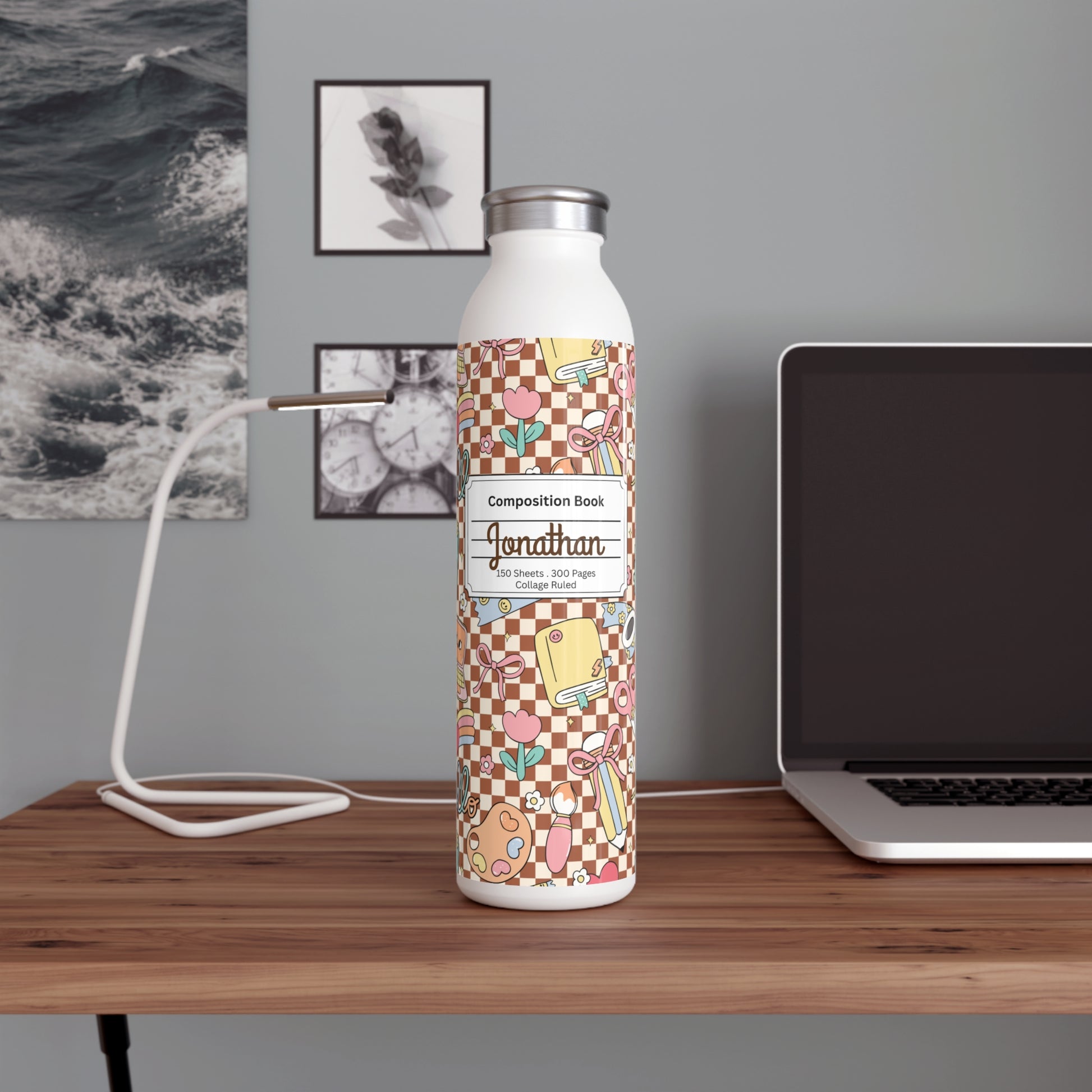 Personalized Composition Brown Doodle Daydream Book Inspired Slim Water Bottle, Customizable Drinkware, Eco-Friendly Hydration Bottle, Perfect for Gifts, School Supplies, Back to School