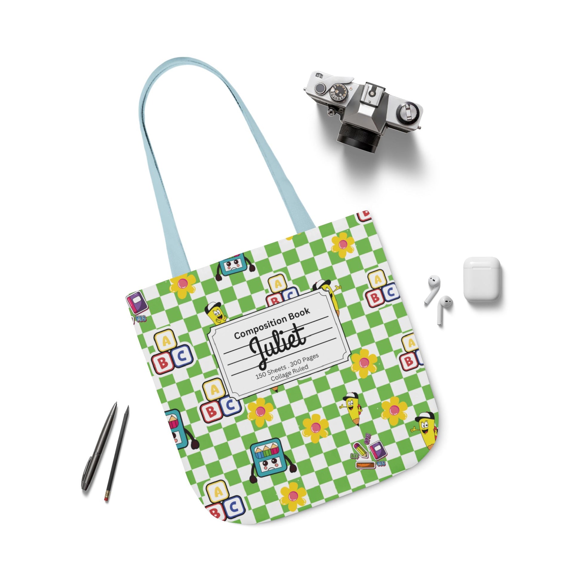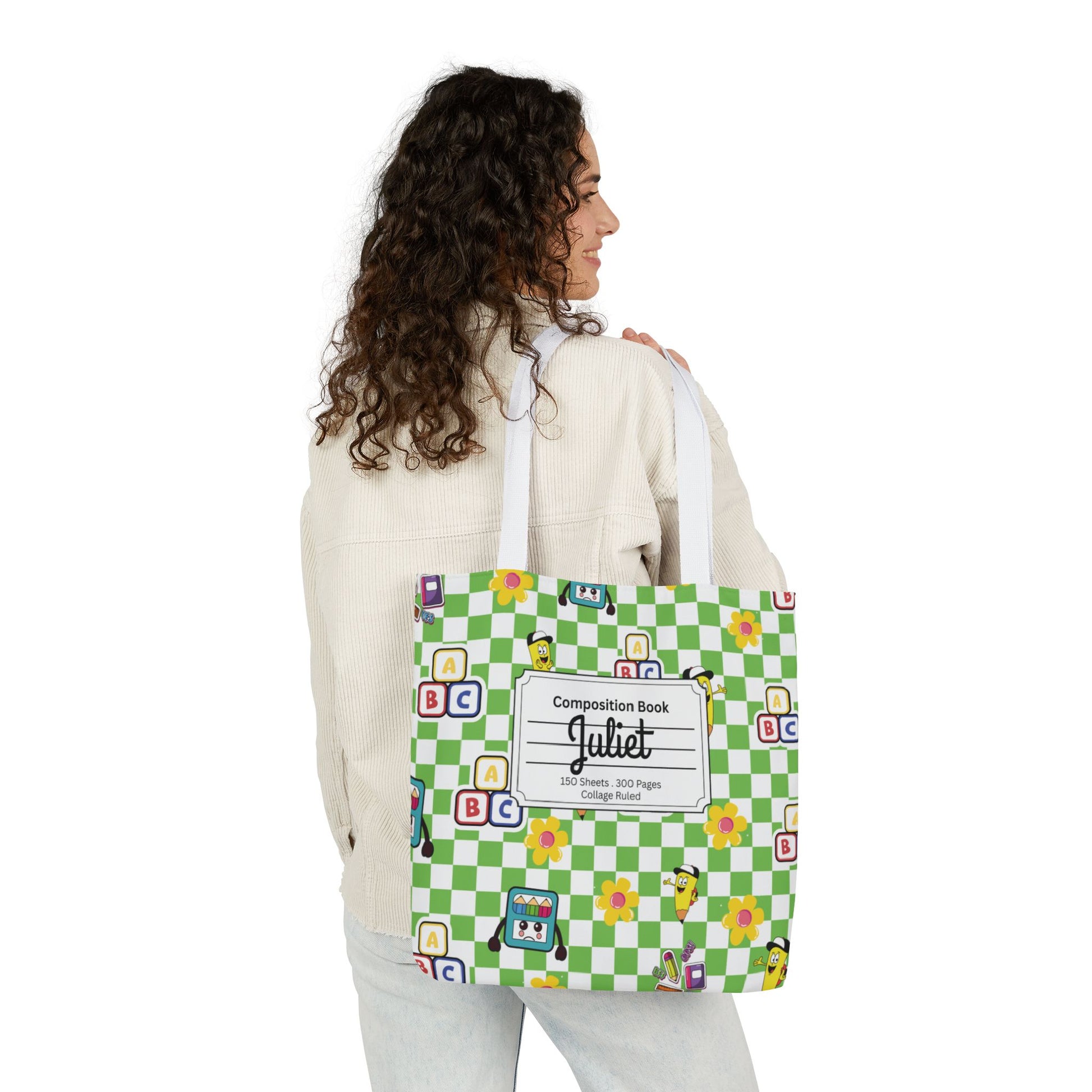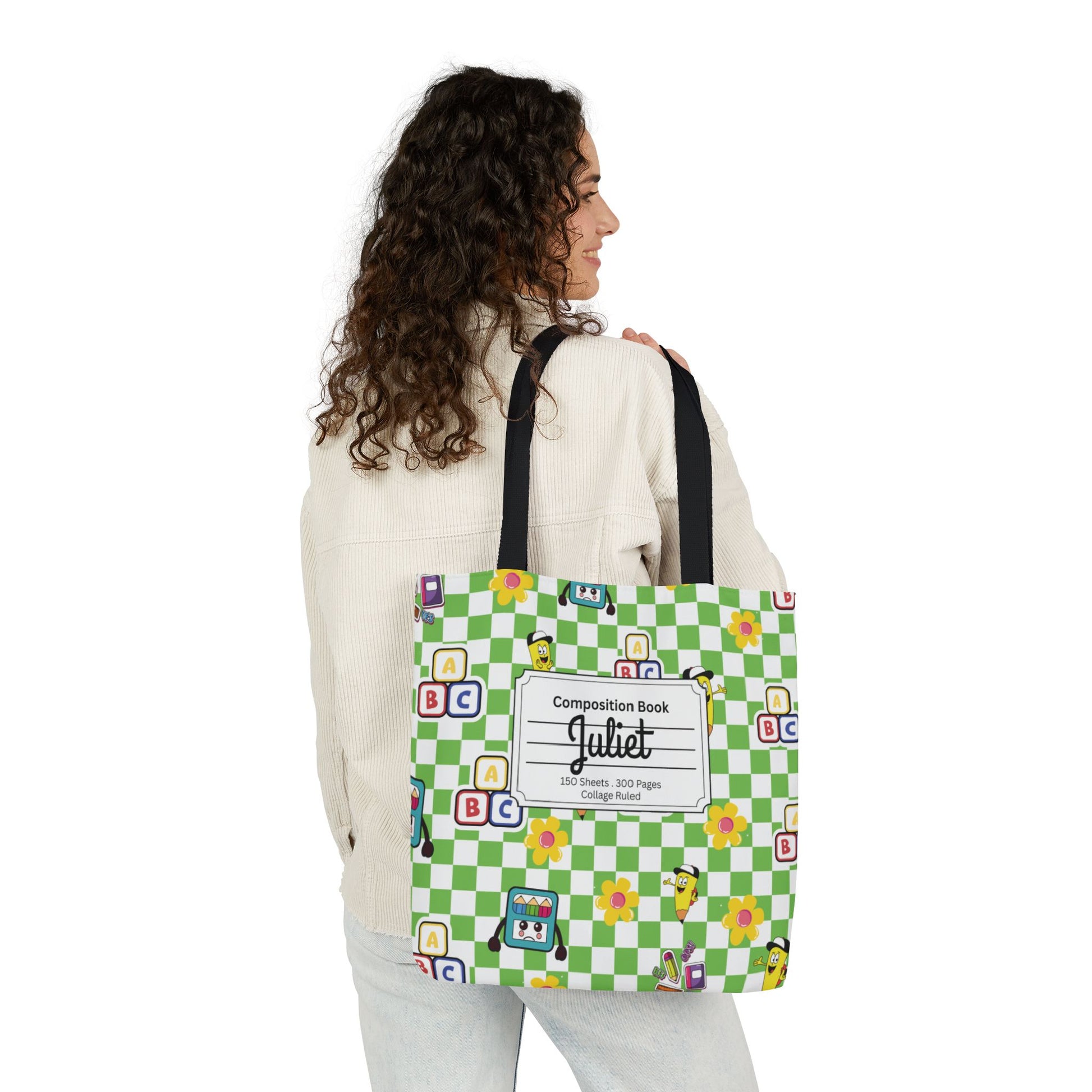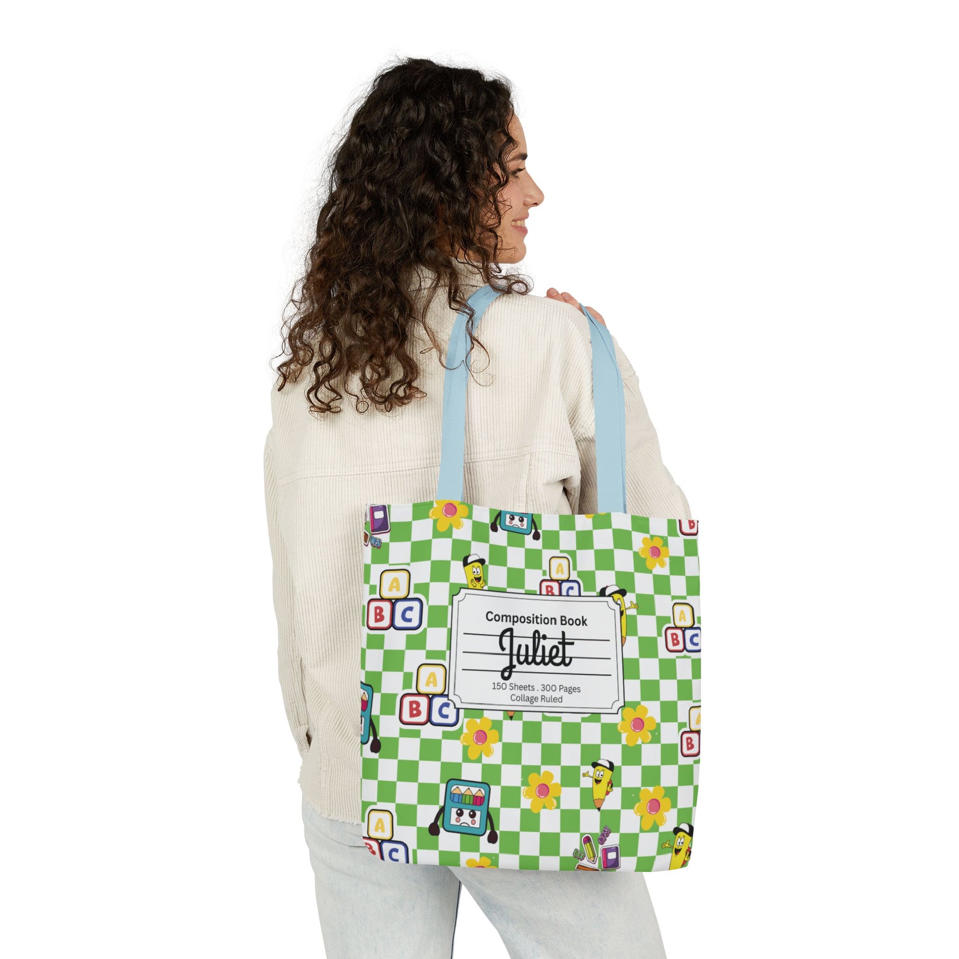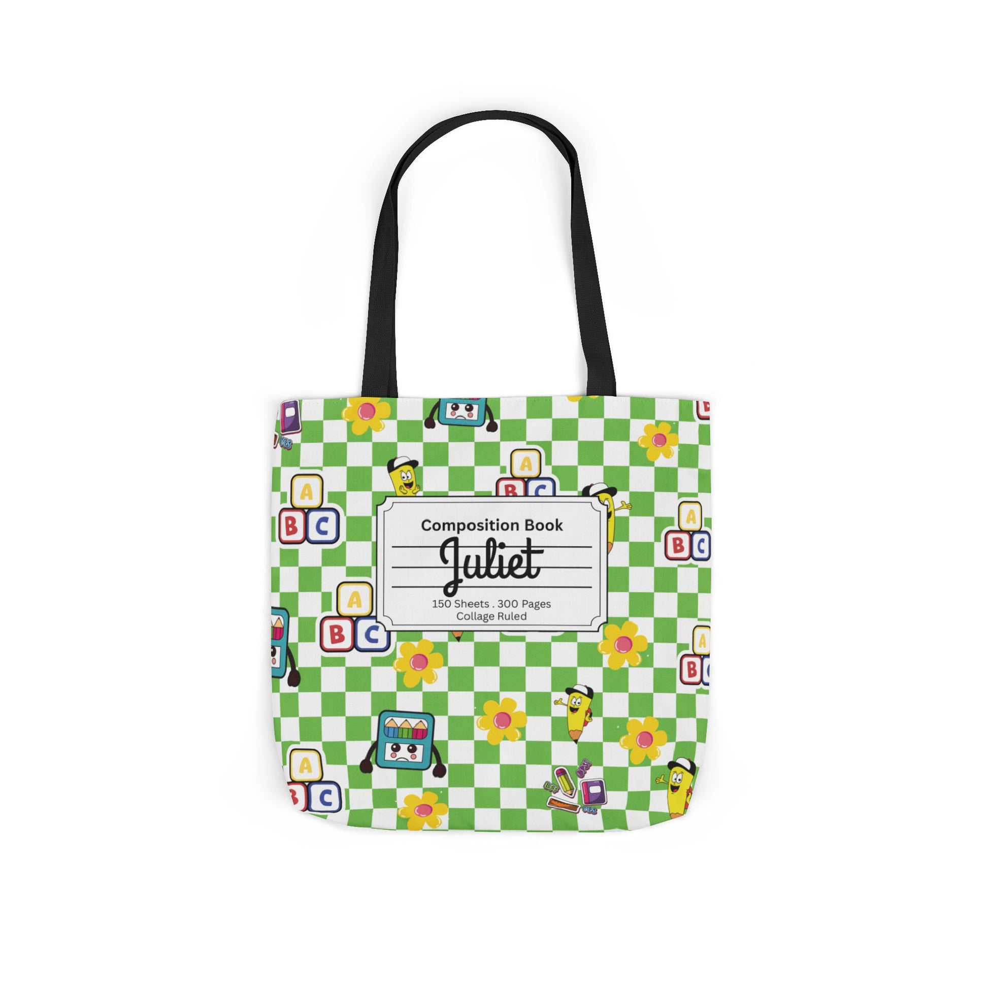Personalized Green Schoolyard Chic Composition Book Inspired Canvas Tote Bag with Colorful Straps, Cute School Bag, Eco-Friendly Tote, Back to School Shopping Bag, Teacher Gift Idea
