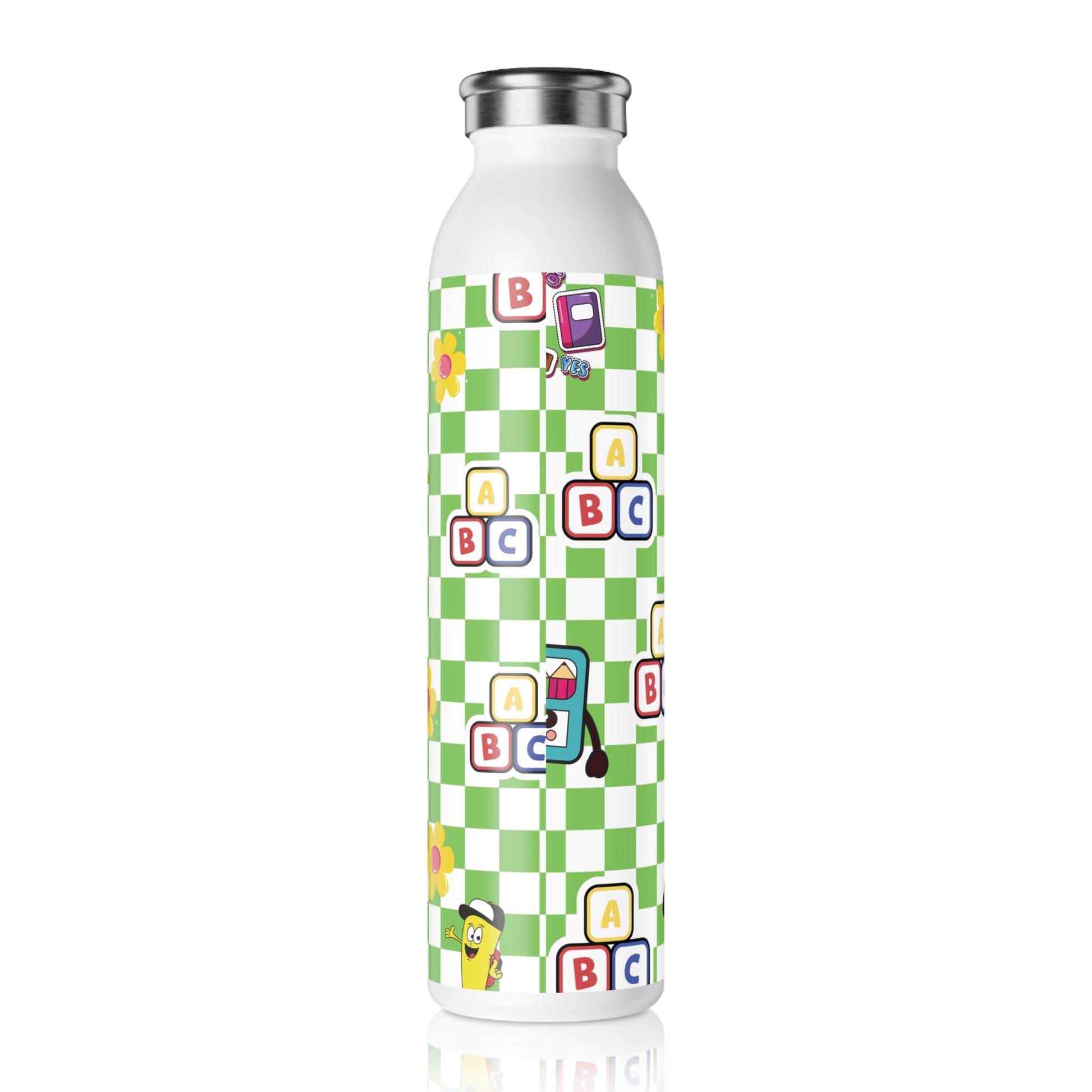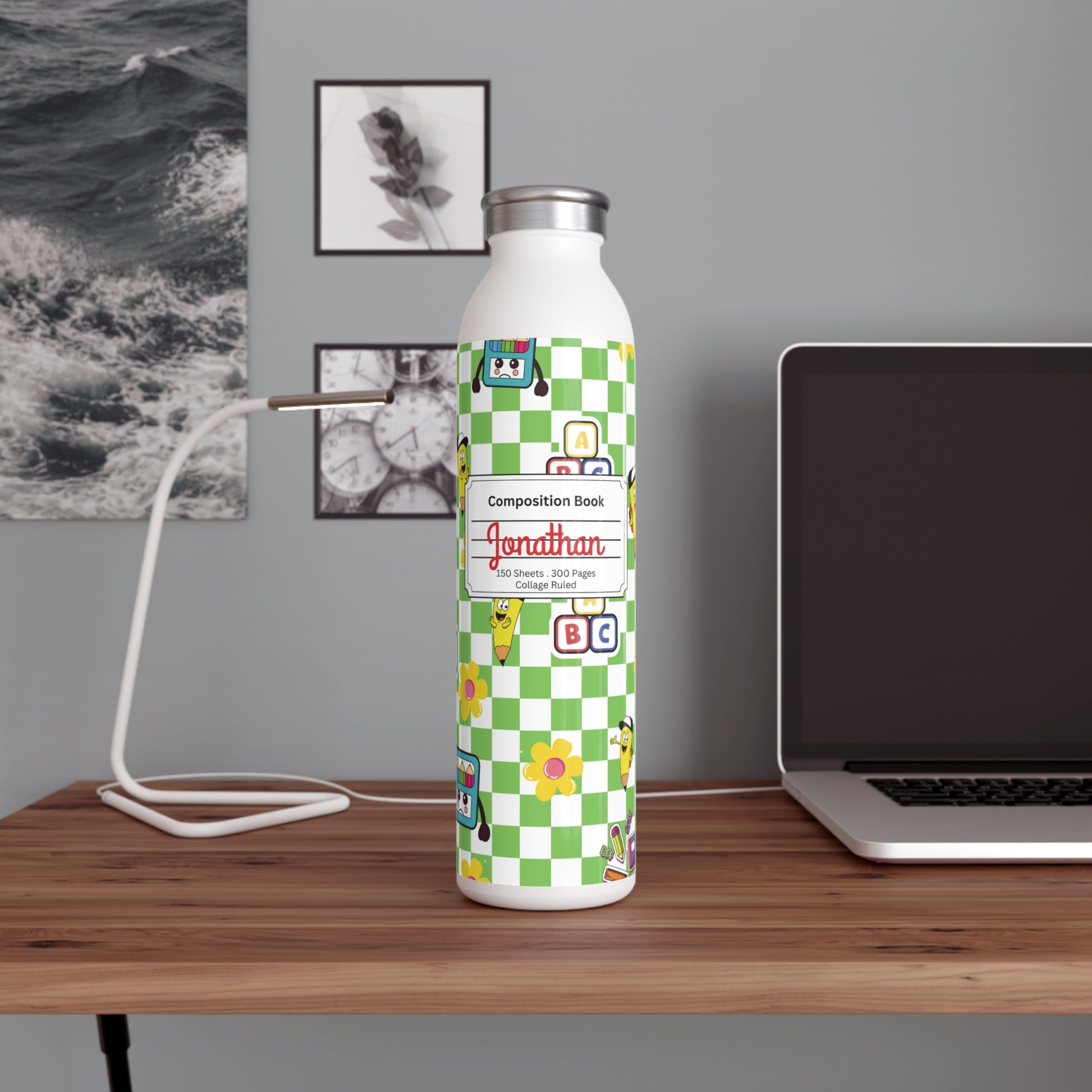 Personalized Green SchoolYard Chic Composition Book Inspired Slim Water Bottle, Customizable Drinkware, Eco-Friendly Hydration Bottle, Perfect for Gifts, School Supplies, Back to School