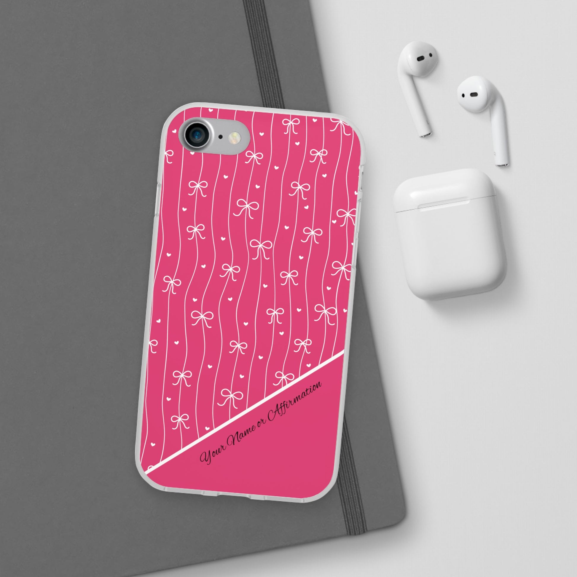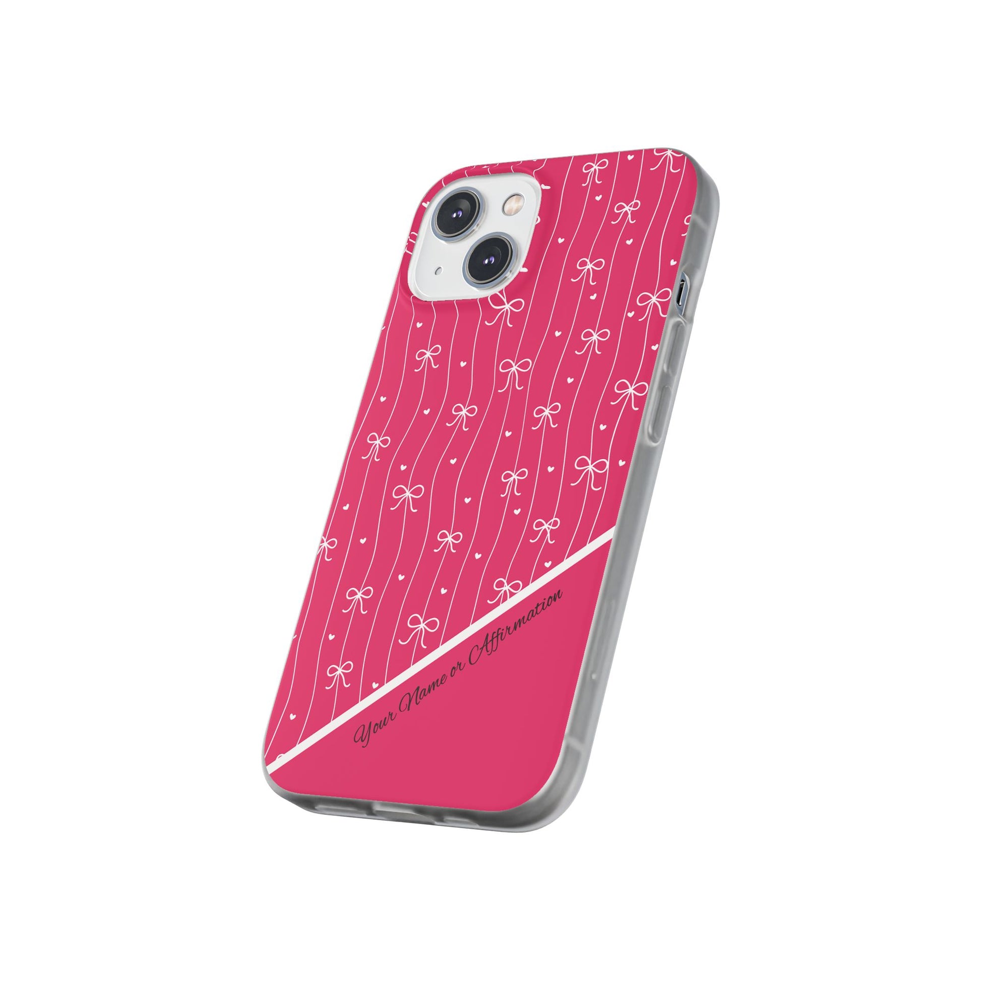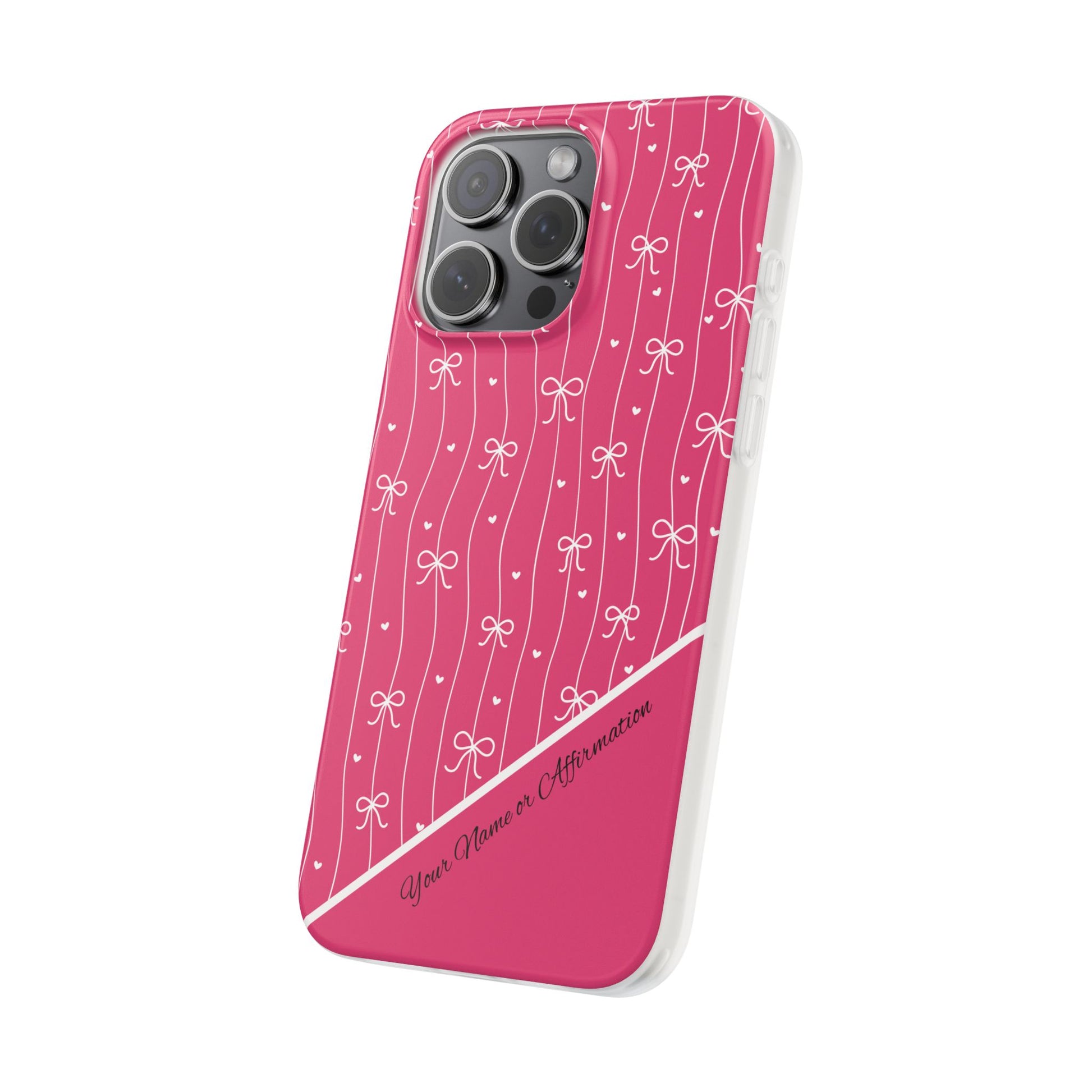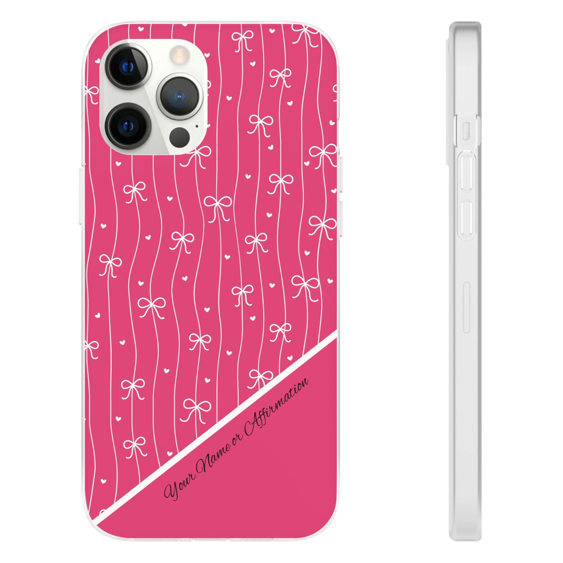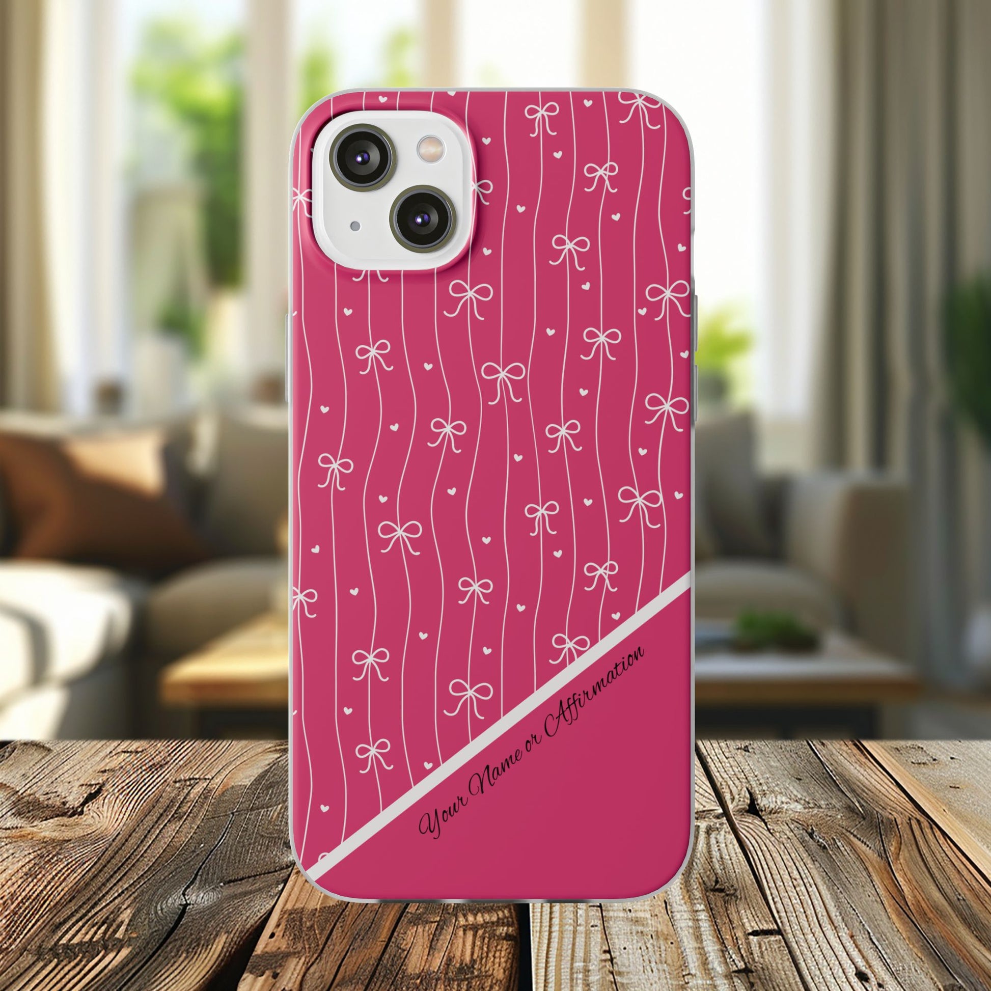 A slim, flexible phone case that brings playful charm and everyday protection to your device. The semi-transparent matte TPU shell slips on easily and absorbs shocks from daily drops while keeping a low-profile look. Bright, crisp printing shows off the whimsical bow-and-heart pattern and a customizable name or short affirmation panel, so your phone feels personal and cheerful. Lightweight and precisely cut for full access to ports and buttons, it supports wireless charging and arrives with optional gift packaging for a thoughtful presentation.