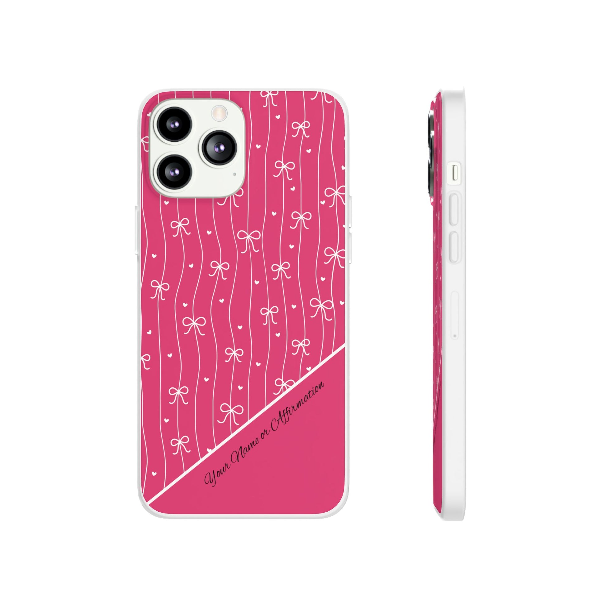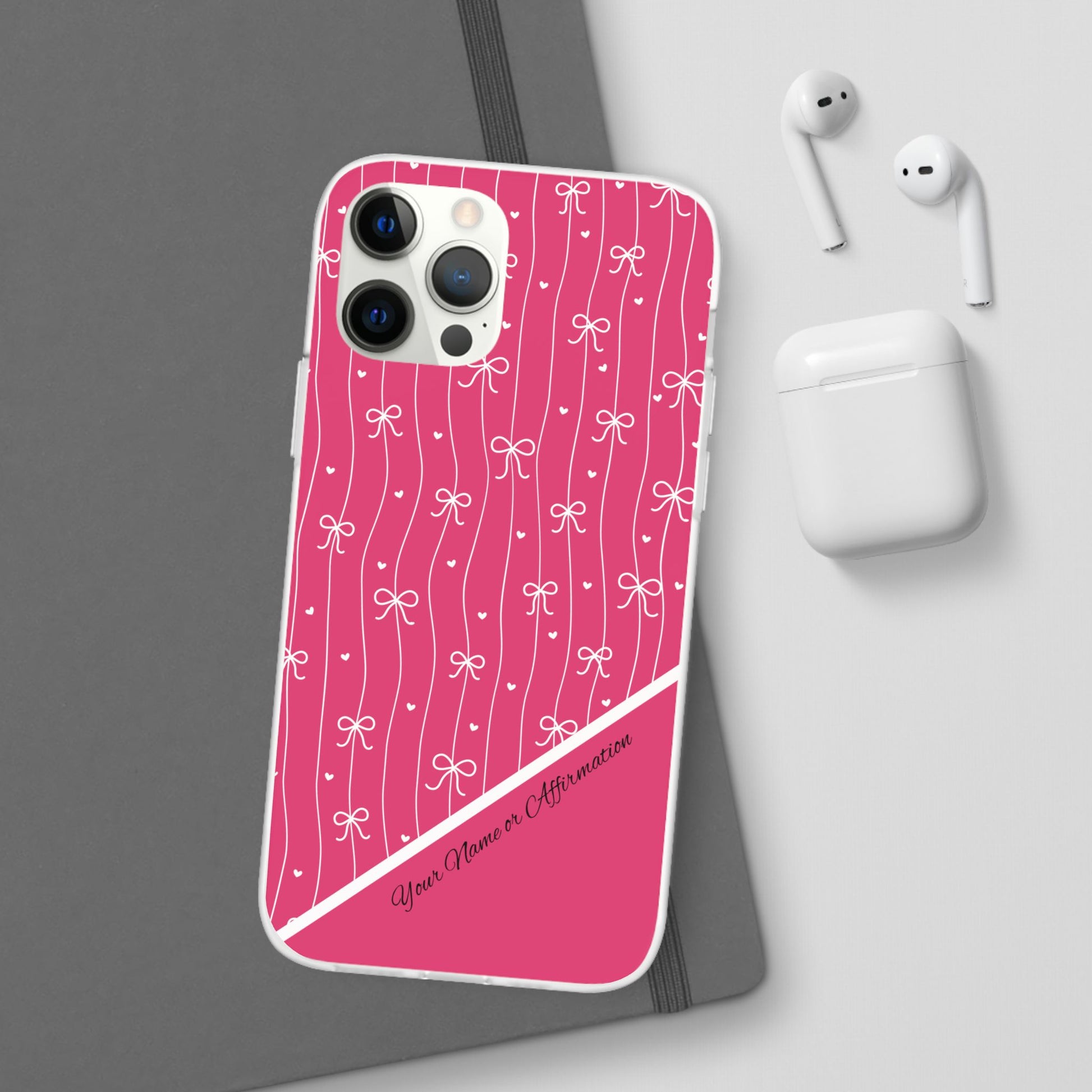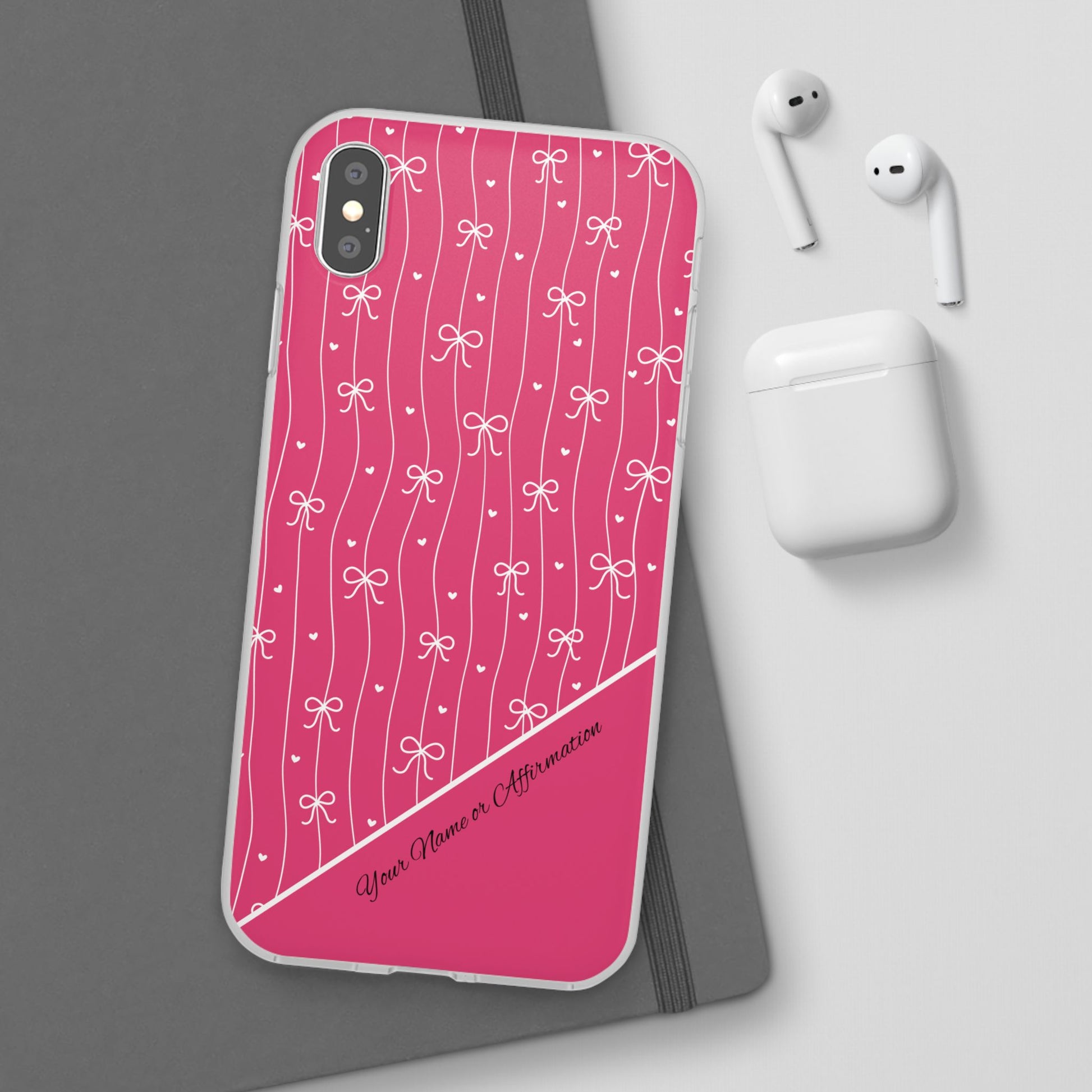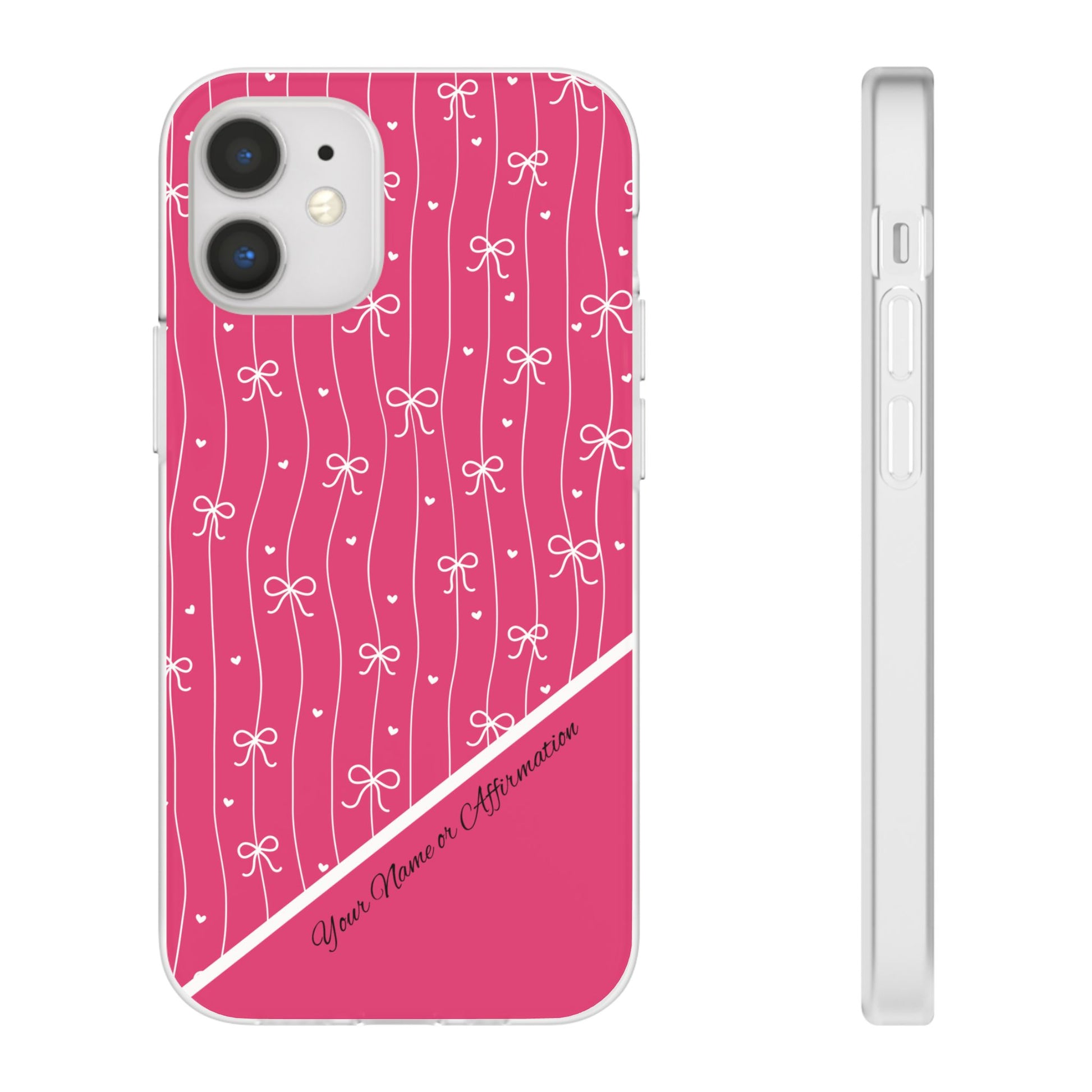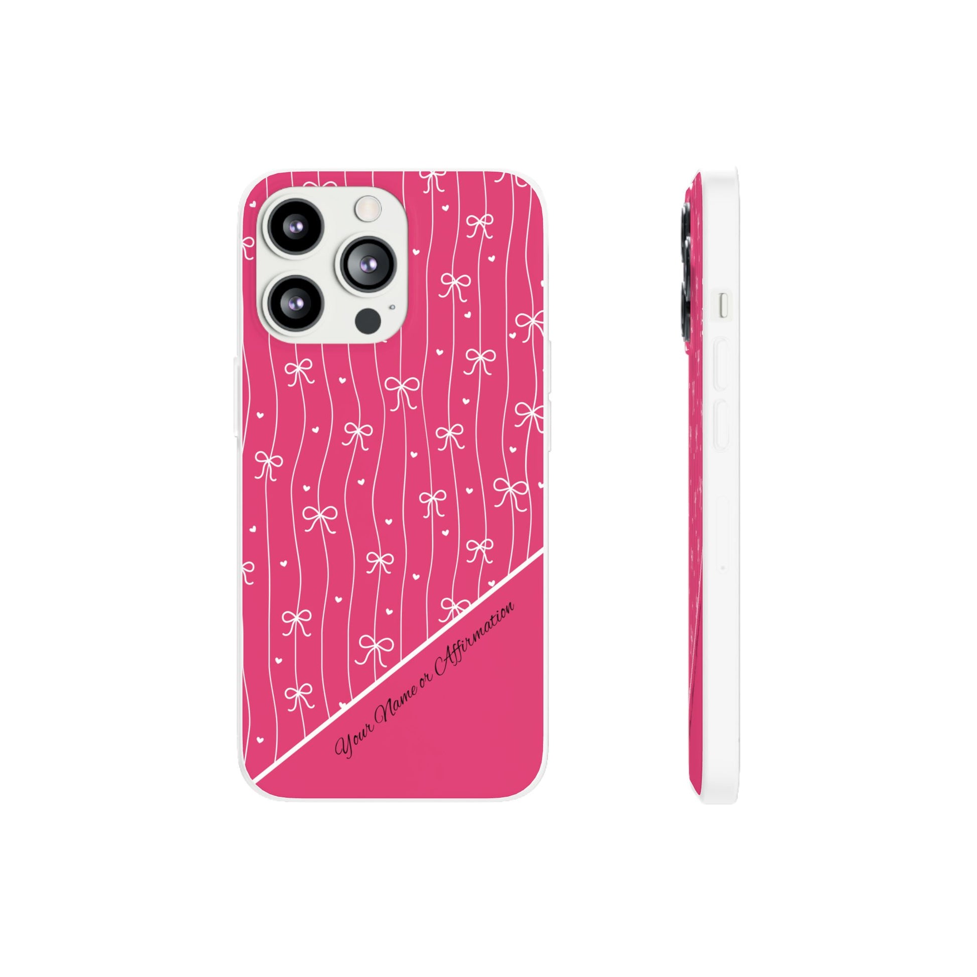 A slim, flexible phone case that brings playful charm and everyday protection to your device. The semi-transparent matte TPU shell slips on easily and absorbs shocks from daily drops while keeping a low-profile look. Bright, crisp printing shows off the whimsical bow-and-heart pattern and a customizable name or short affirmation panel, so your phone feels personal and cheerful. Lightweight and precisely cut for full access to ports and buttons, it supports wireless charging and arrives with optional gift packaging for a thoughtful presentation.