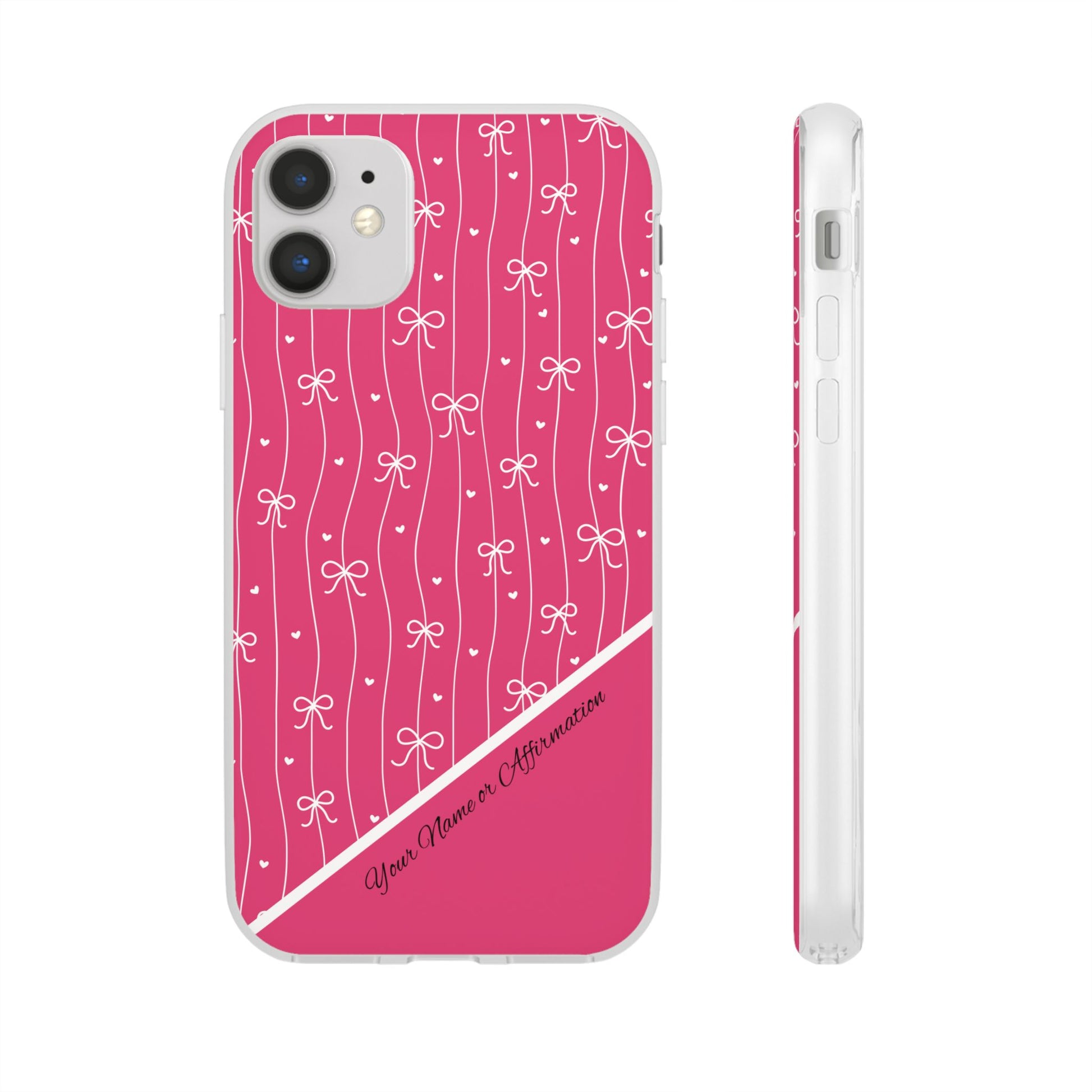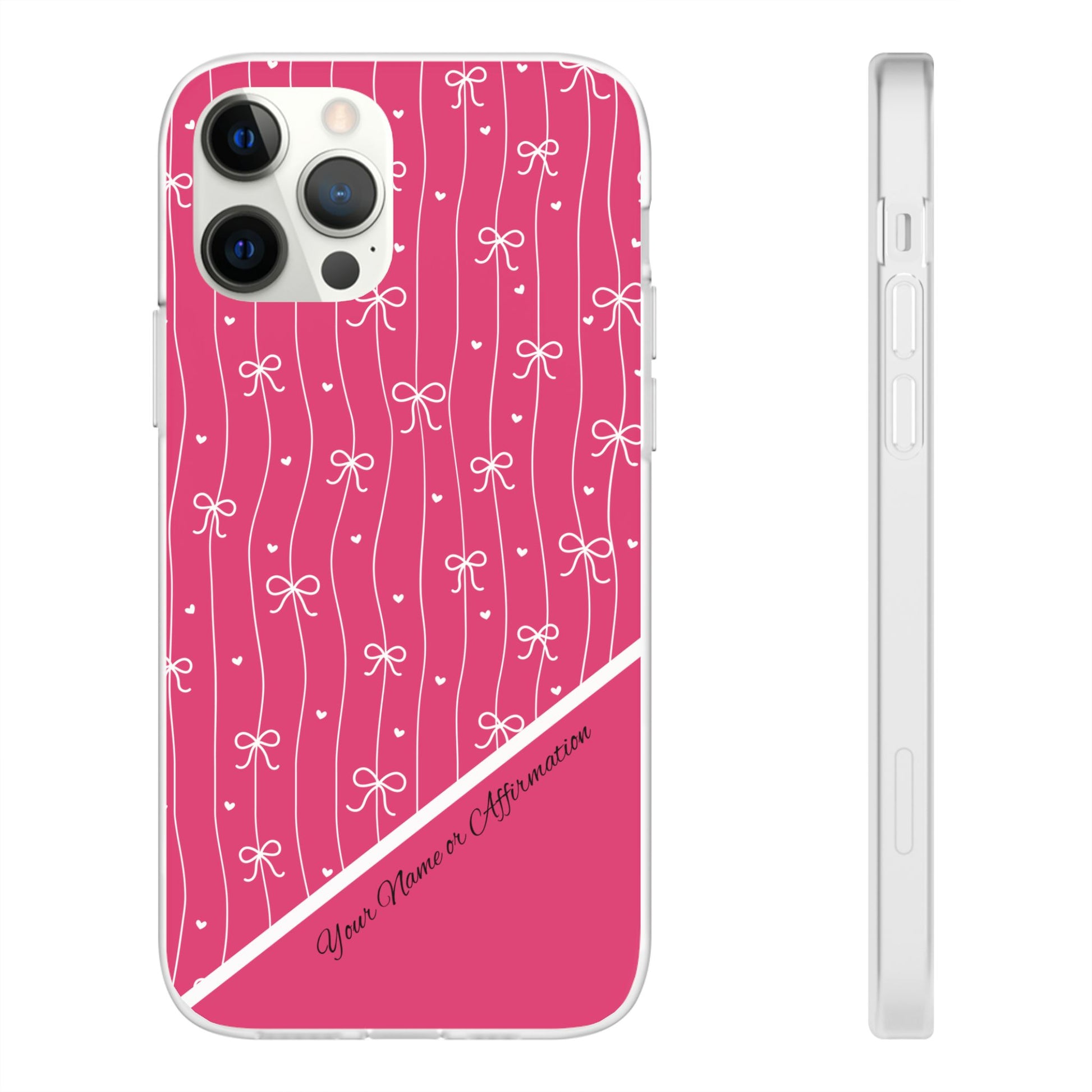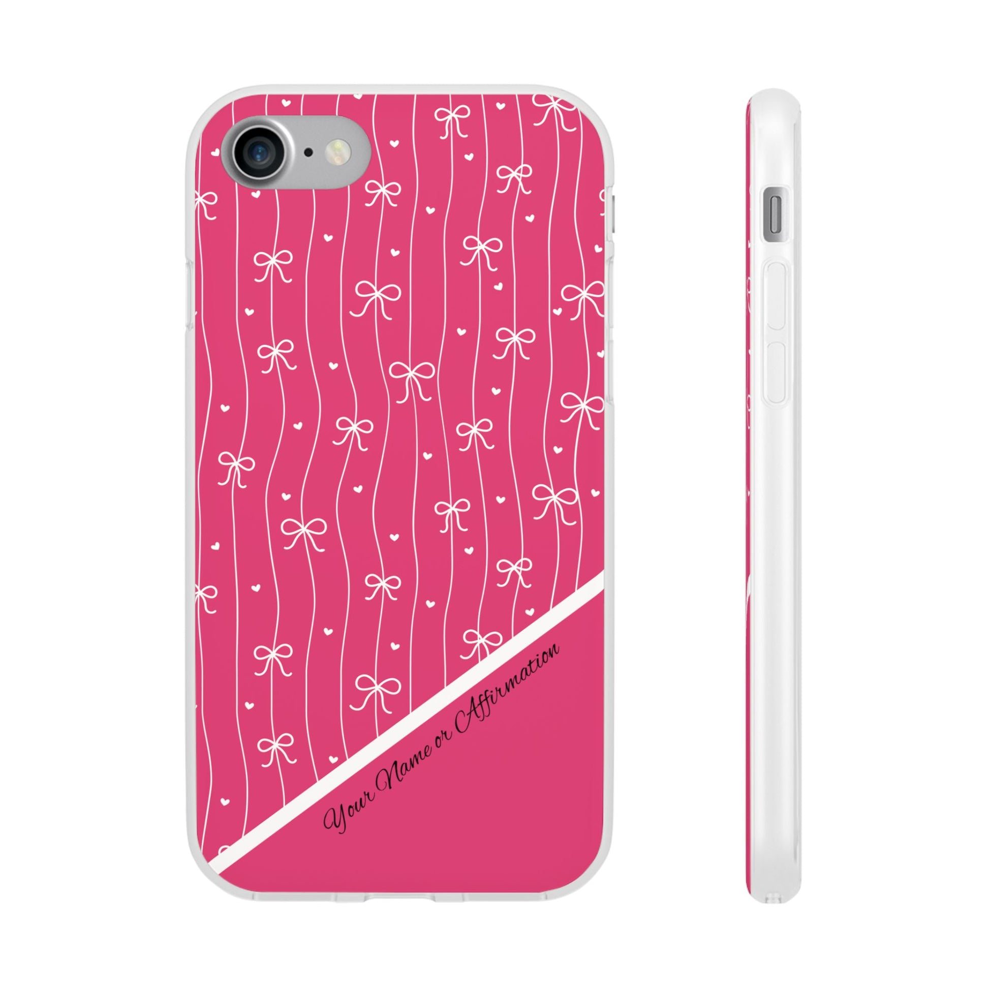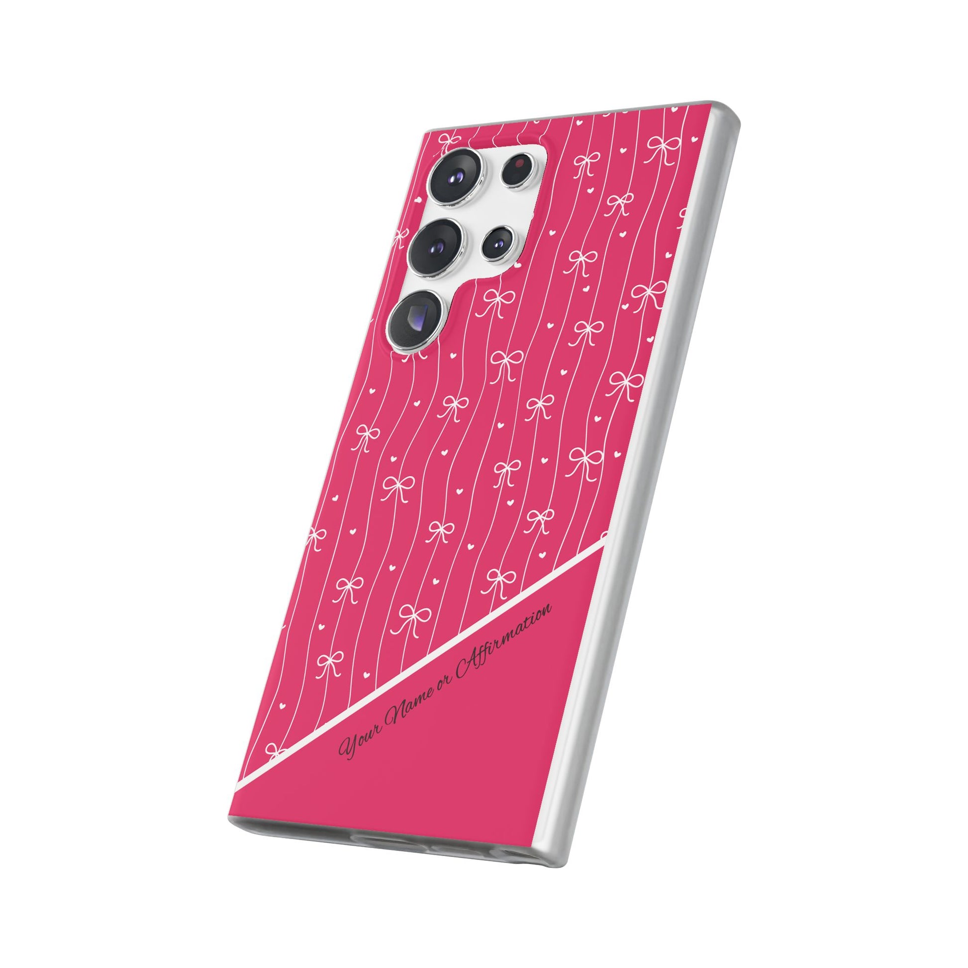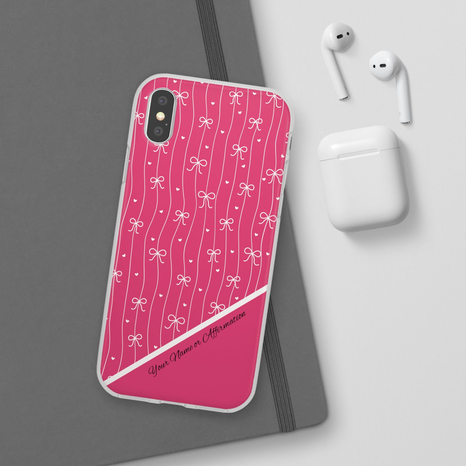 A slim, flexible phone case that brings playful charm and everyday protection to your device. The semi-transparent matte TPU shell slips on easily and absorbs shocks from daily drops while keeping a low-profile look. Bright, crisp printing shows off the whimsical bow-and-heart pattern and a customizable name or short affirmation panel, so your phone feels personal and cheerful. Lightweight and precisely cut for full access to ports and buttons, it supports wireless charging and arrives with optional gift packaging for a thoughtful presentation.