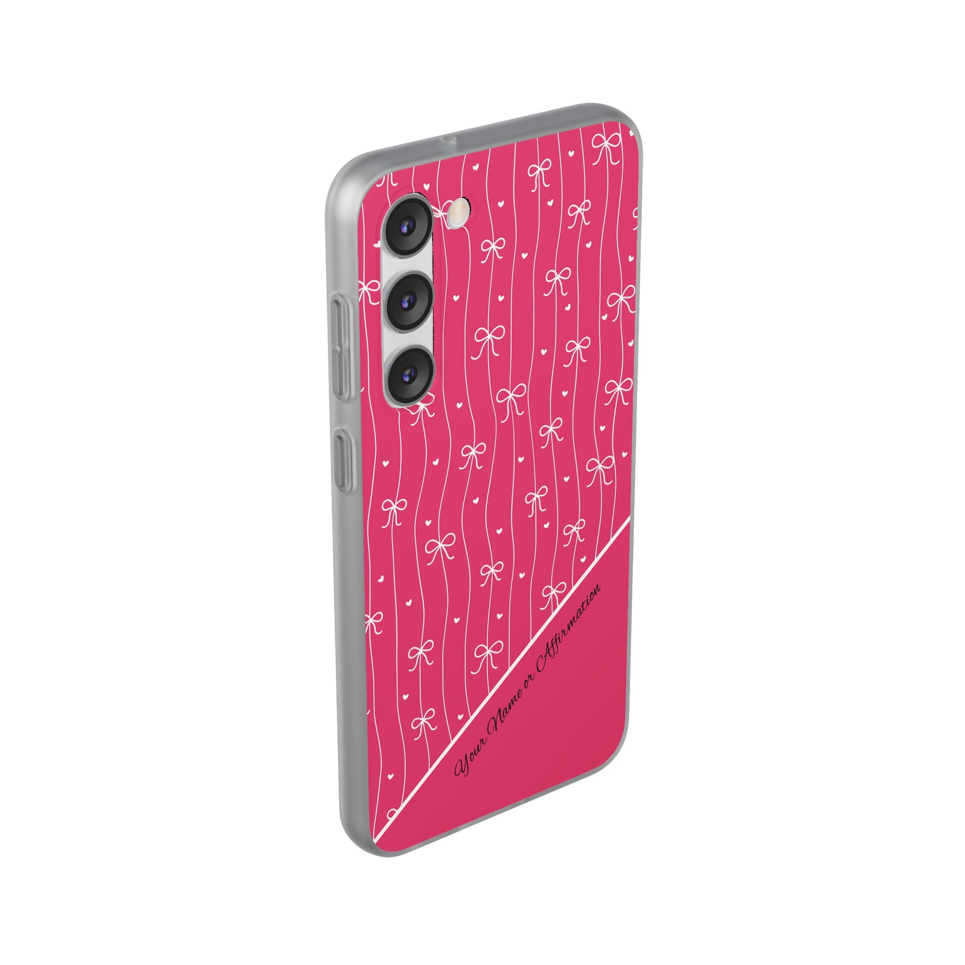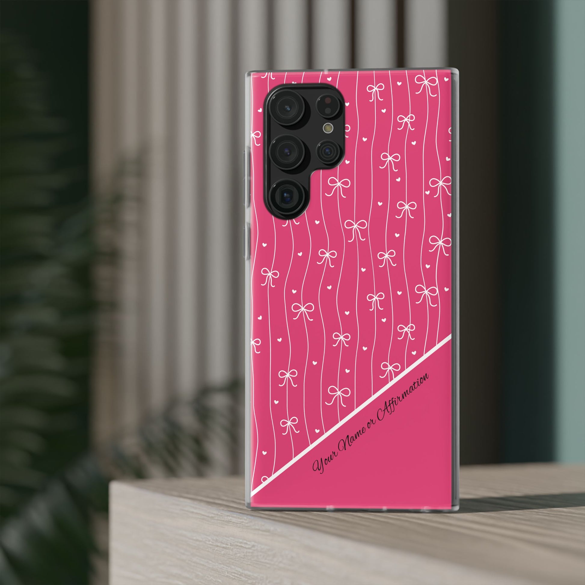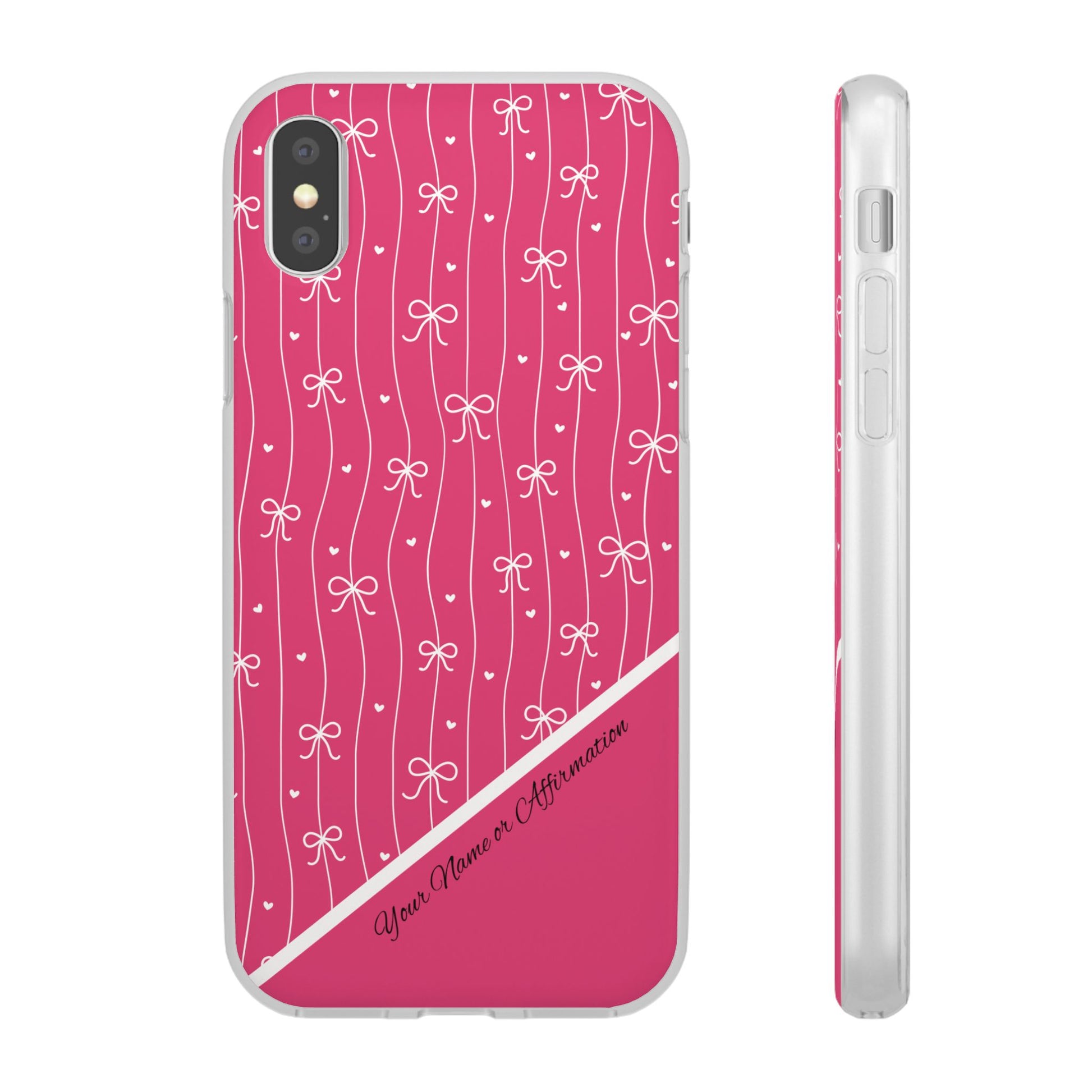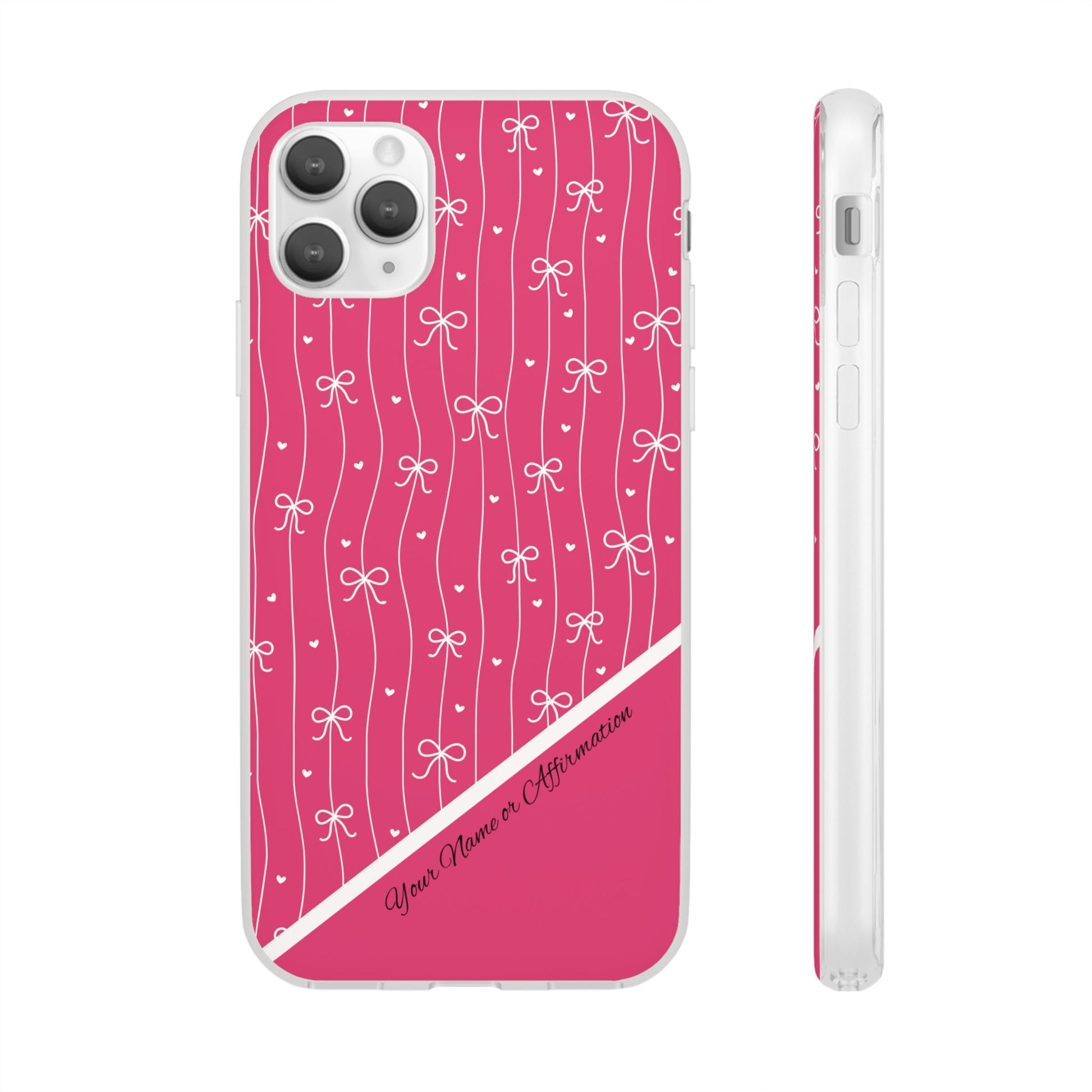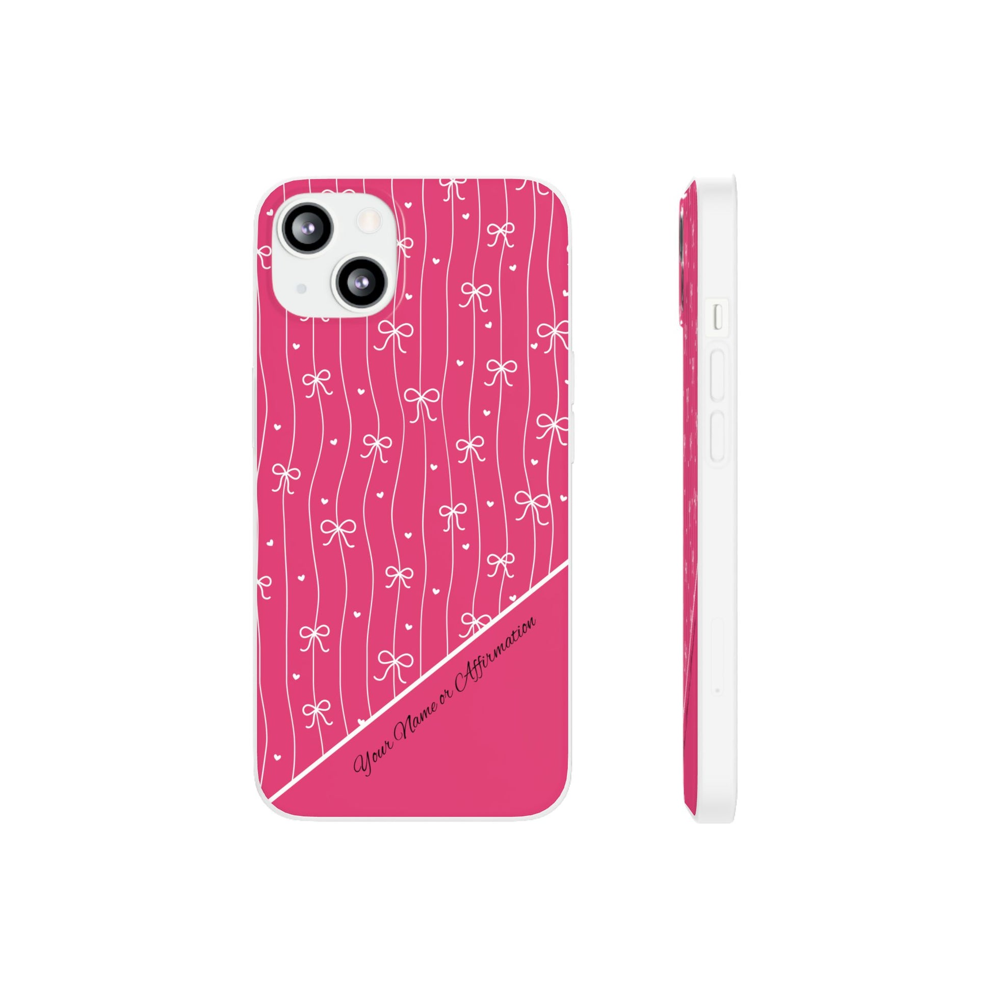 A slim, flexible phone case that brings playful charm and everyday protection to your device. The semi-transparent matte TPU shell slips on easily and absorbs shocks from daily drops while keeping a low-profile look. Bright, crisp printing shows off the whimsical bow-and-heart pattern and a customizable name or short affirmation panel, so your phone feels personal and cheerful. Lightweight and precisely cut for full access to ports and buttons, it supports wireless charging and arrives with optional gift packaging for a thoughtful presentation.