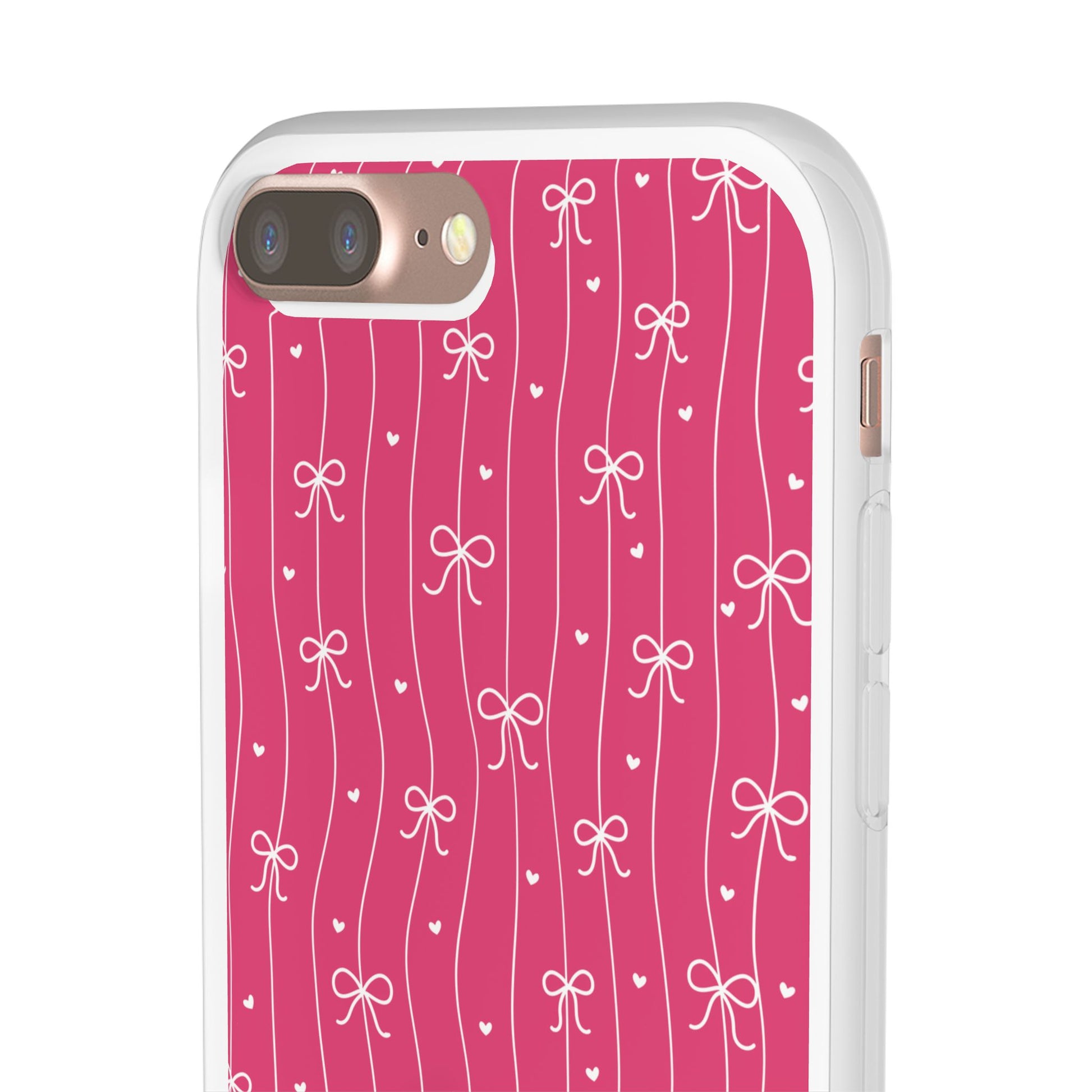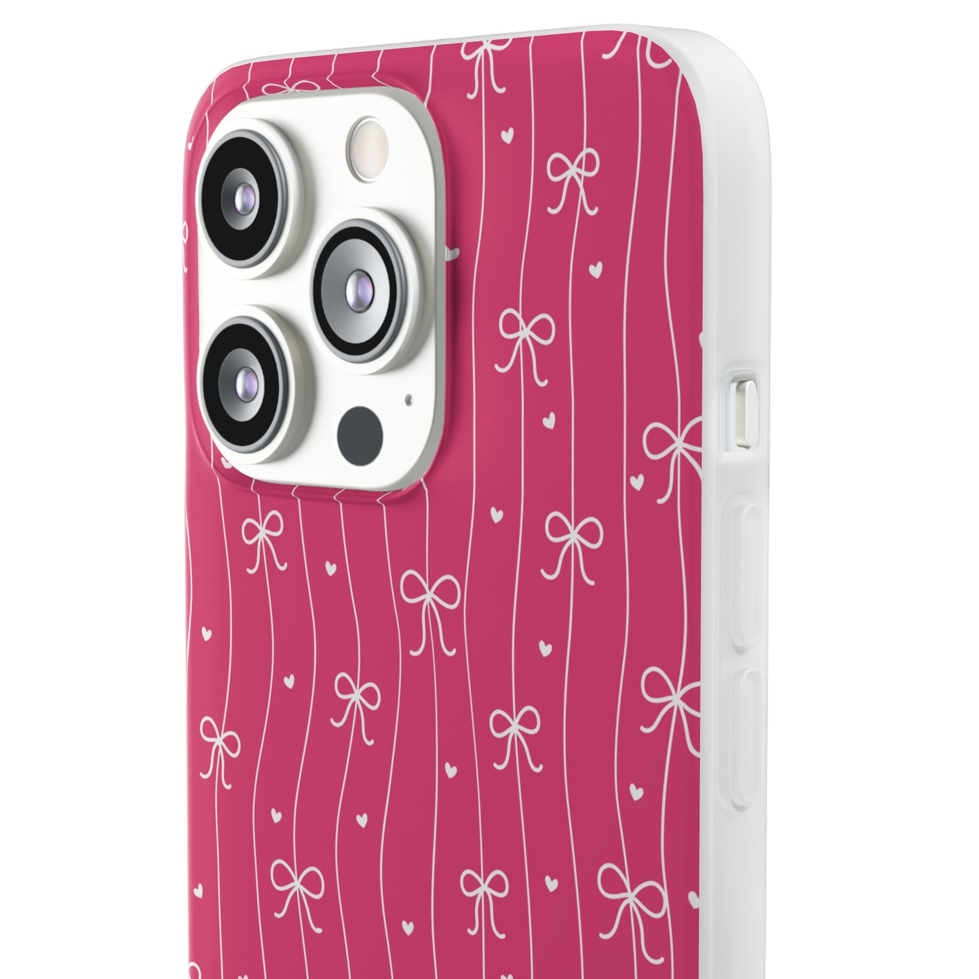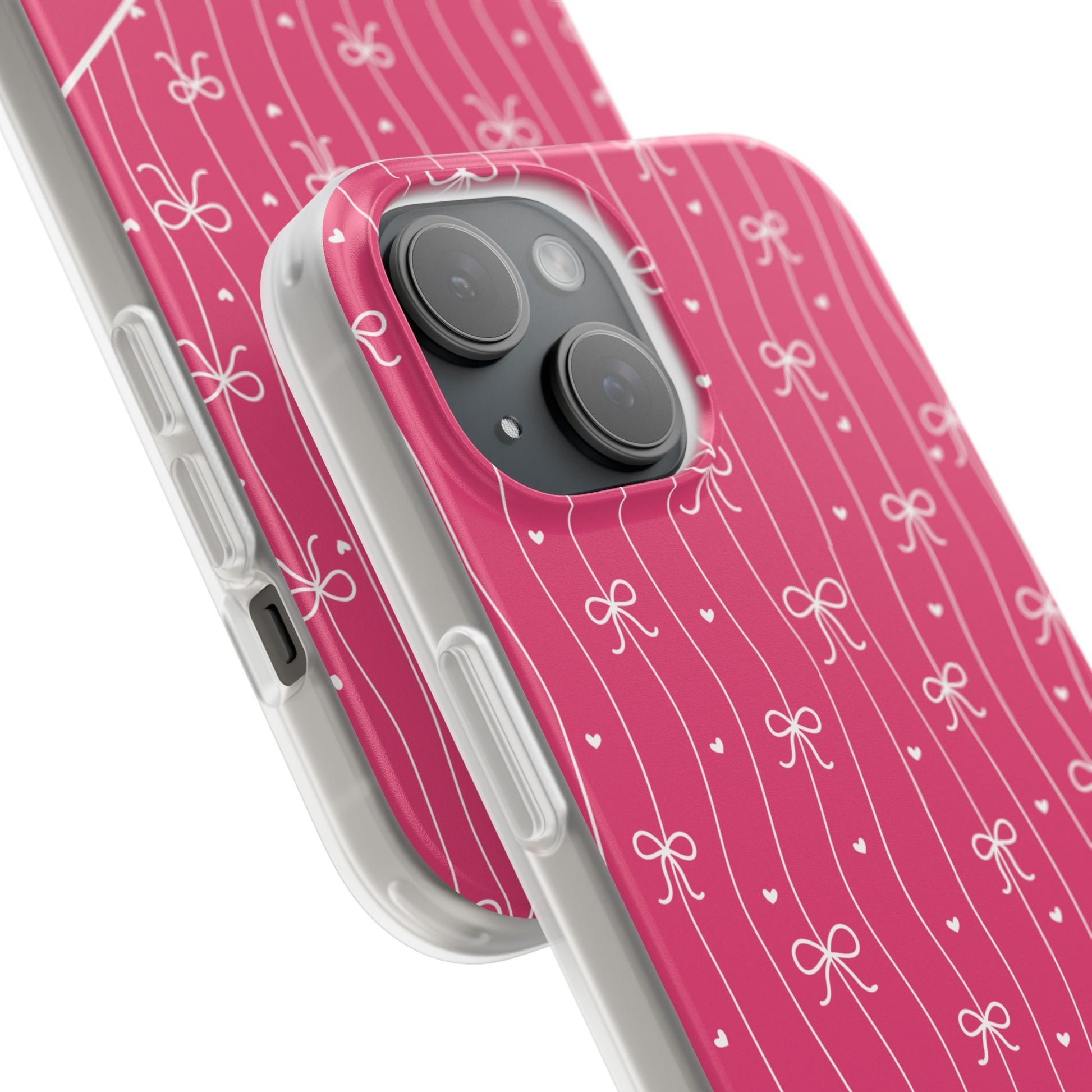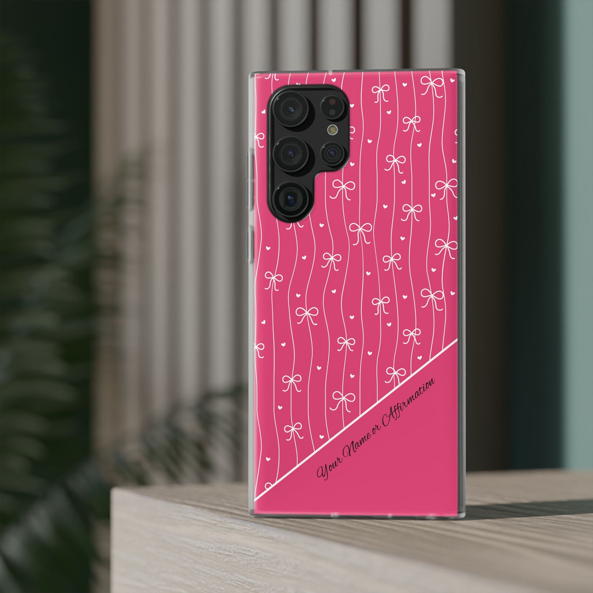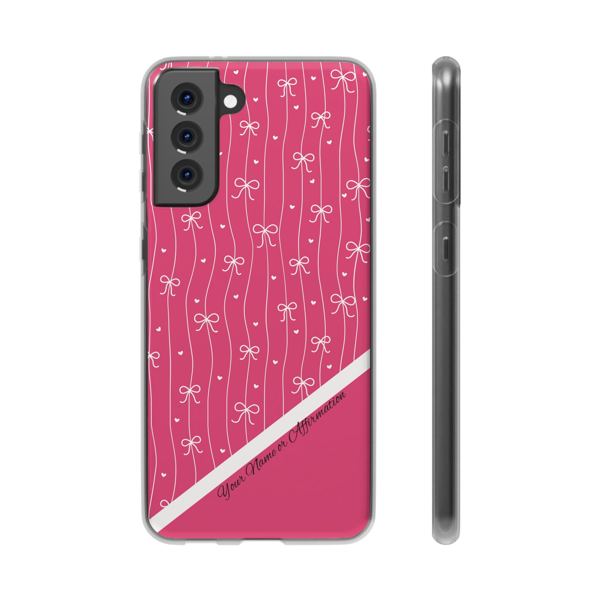 A slim, flexible phone case that brings playful charm and everyday protection to your device. The semi-transparent matte TPU shell slips on easily and absorbs shocks from daily drops while keeping a low-profile look. Bright, crisp printing shows off the whimsical bow-and-heart pattern and a customizable name or short affirmation panel, so your phone feels personal and cheerful. Lightweight and precisely cut for full access to ports and buttons, it supports wireless charging and arrives with optional gift packaging for a thoughtful presentation.