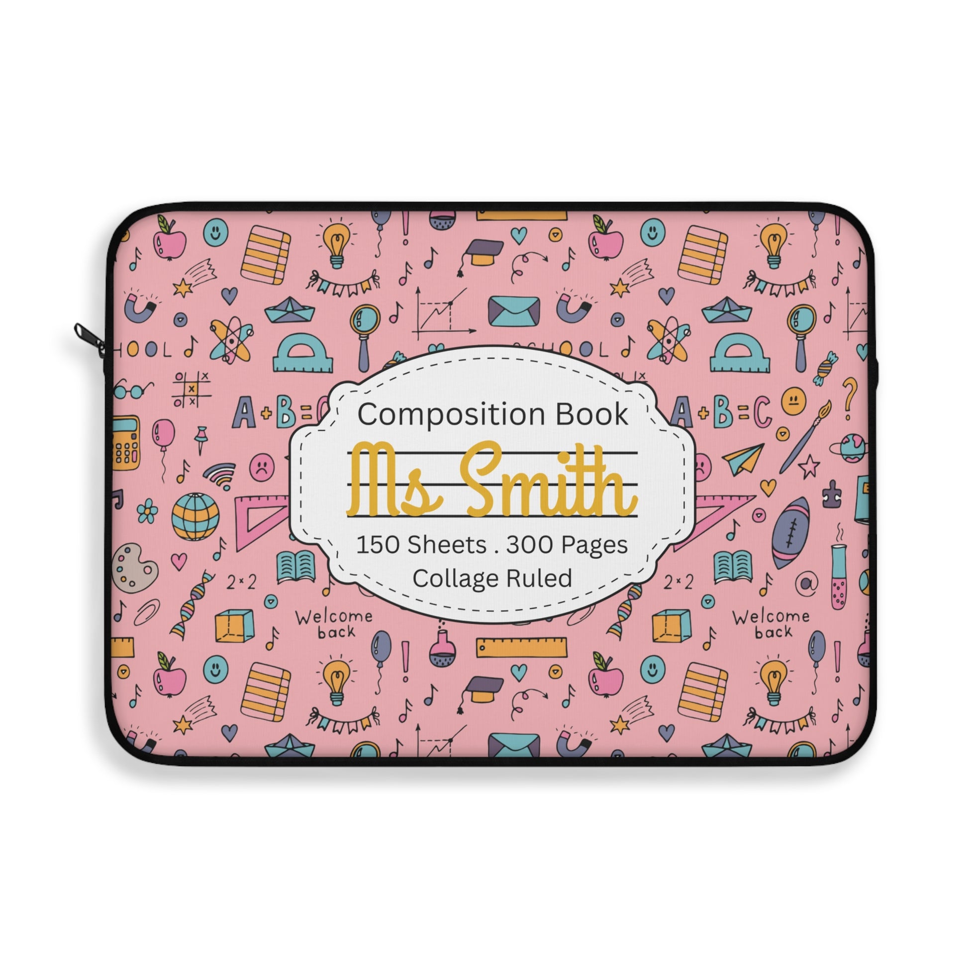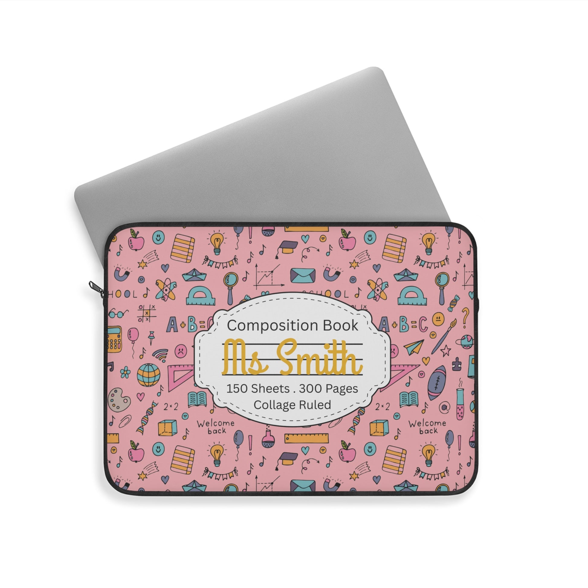 Personalized Pink Chalkboard Chic Laptop Sleeve with Composition Book Inspired Design, Educational Gift for Teachers, Classroom Organization, Back to School, Unique Teacher Accessory