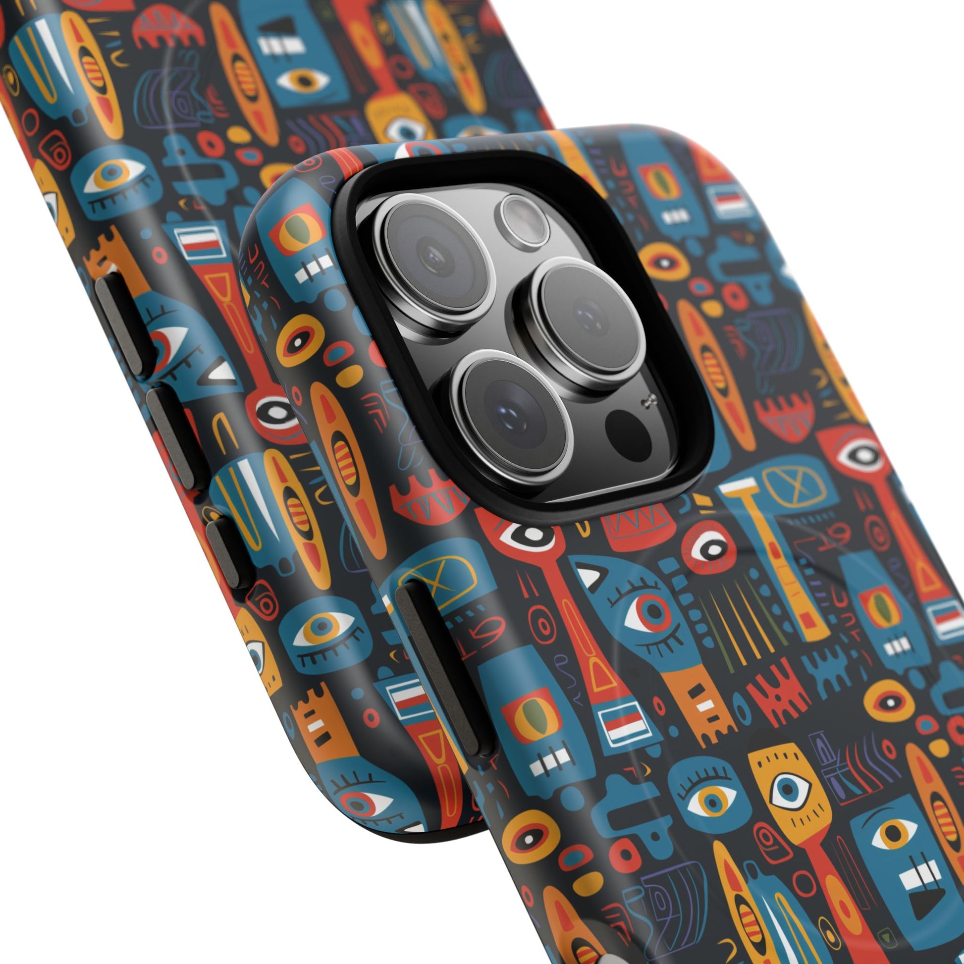 This slim, protective phone case brings bold, modern art to your everyday carry. A dual-layer shell combines a rigid polycarbonate exterior with a soft TPU silicone liner to absorb shocks and guard against drops. The all-over 3D wrap art features playful, abstract totem-like figures in rich teals, rusts, and golds that catch the eye from every angle. A built-in magnetic module keeps MagSafe® accessories aligned, while precise cutouts preserve easy access to ports and buttons. Finished in your choice of glossy or matte, it feels smooth in hand and resists wear so the design stays vibrant. It’s made with durable, impact-resistant materials and crafted with attention to detail in South Korea.