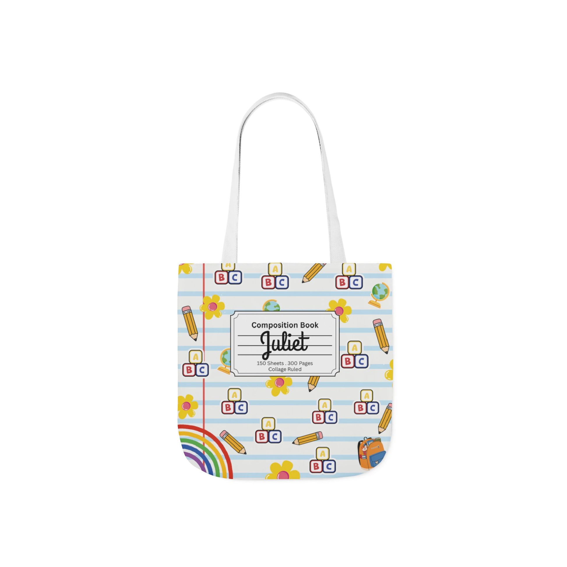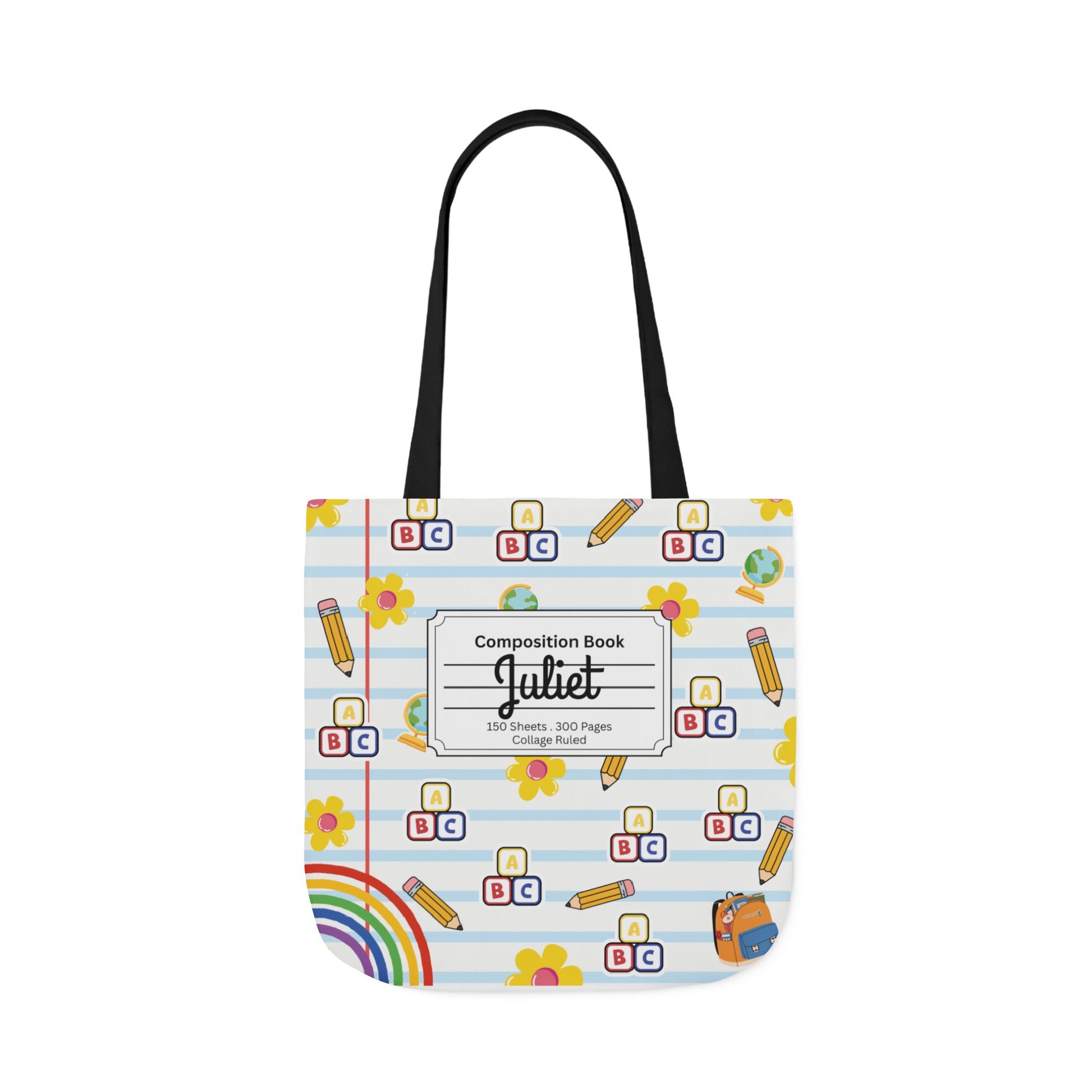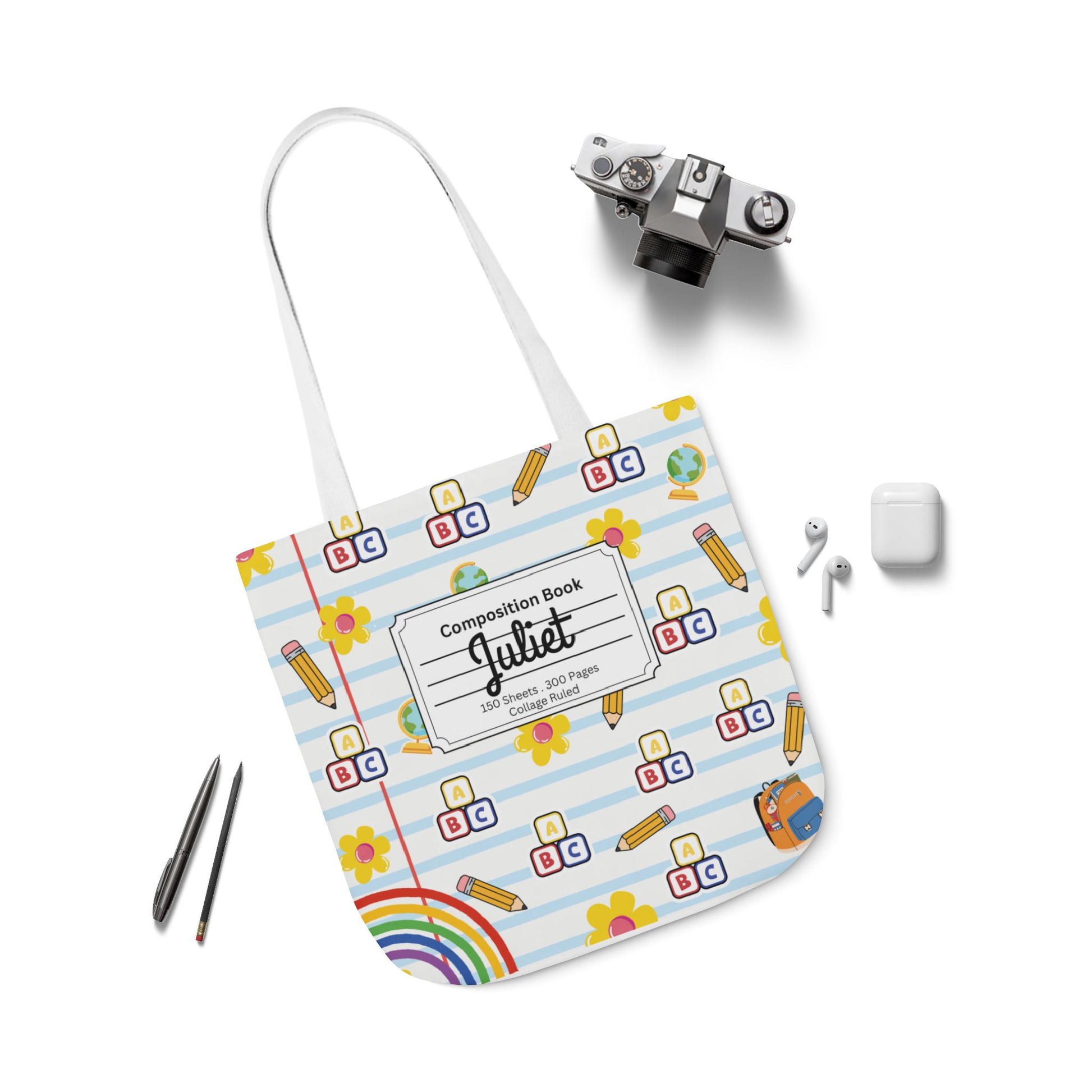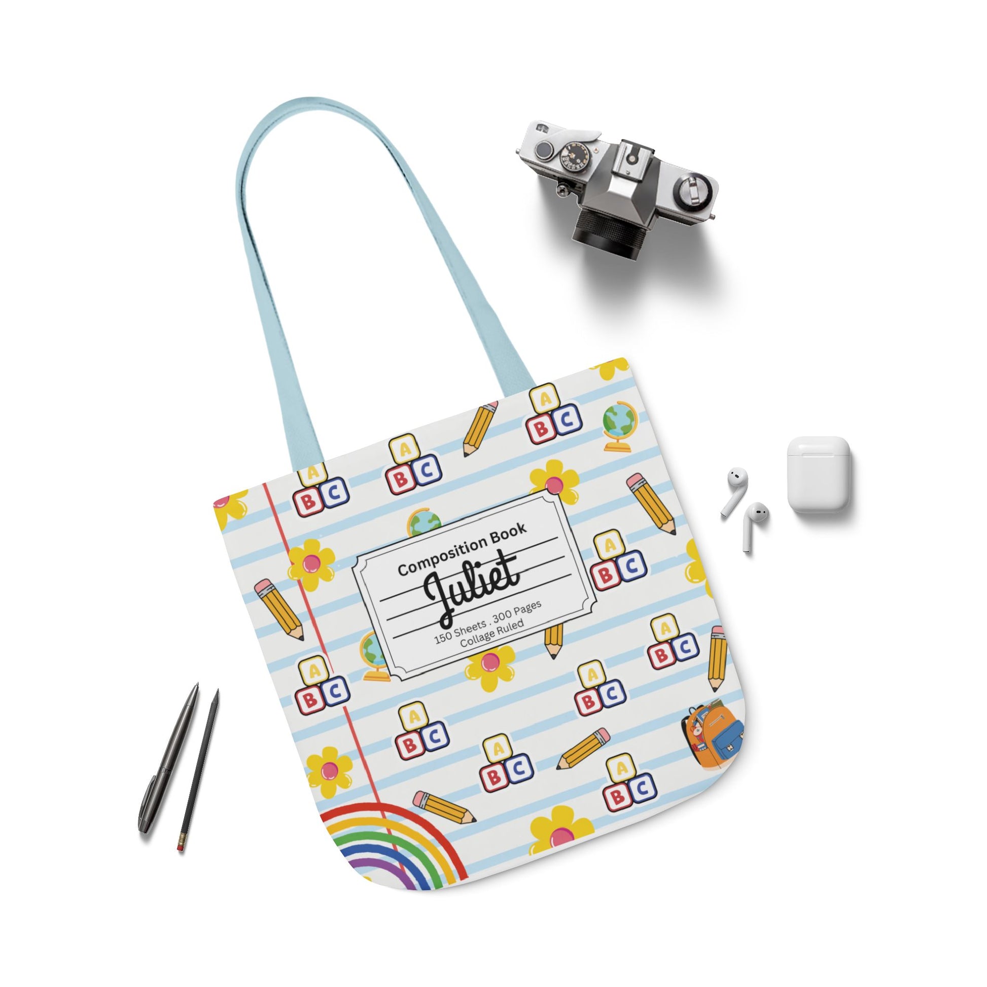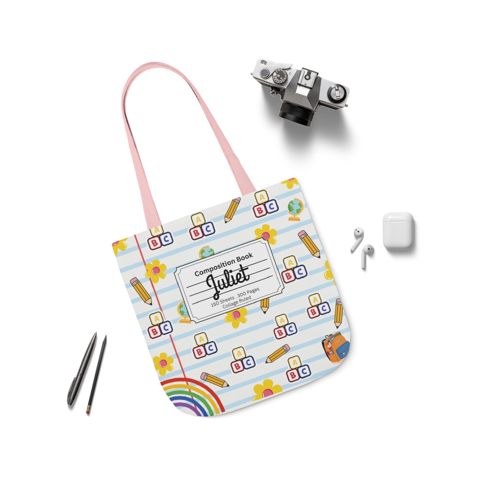 Personalized White Schoolyard Chic Composition Book Inspired Canvas Tote Bag with Colorful Straps, Cute School Bag, Eco-Friendly Tote, Back to School Shopping Bag, Teacher Gift Idea