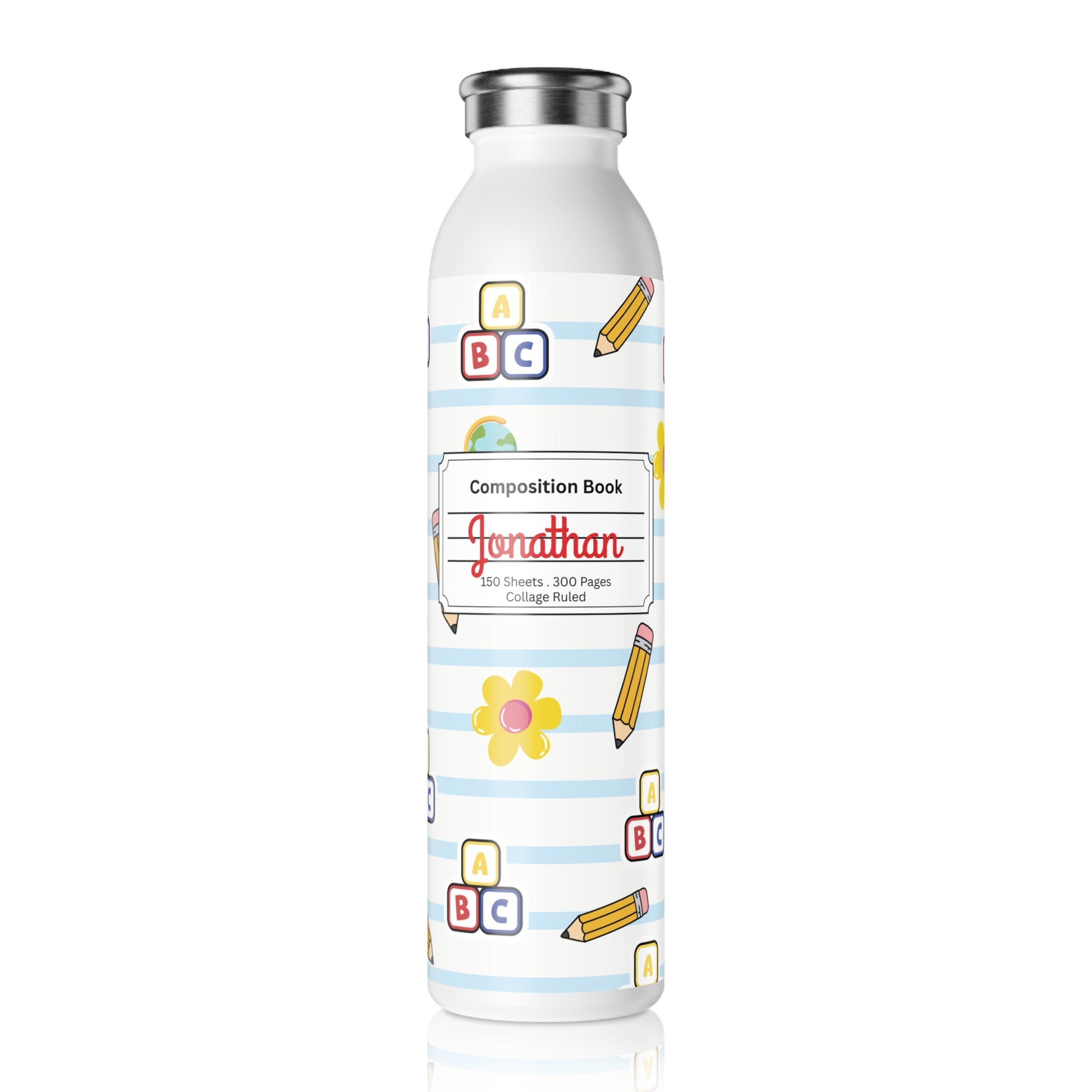 Personalized White SchoolYard Chic Composition Book Inspired Slim Water Bottle, Customizable Drinkware, Eco-Friendly Hydration Bottle, Perfect for Gifts, School Supplies, Back to School