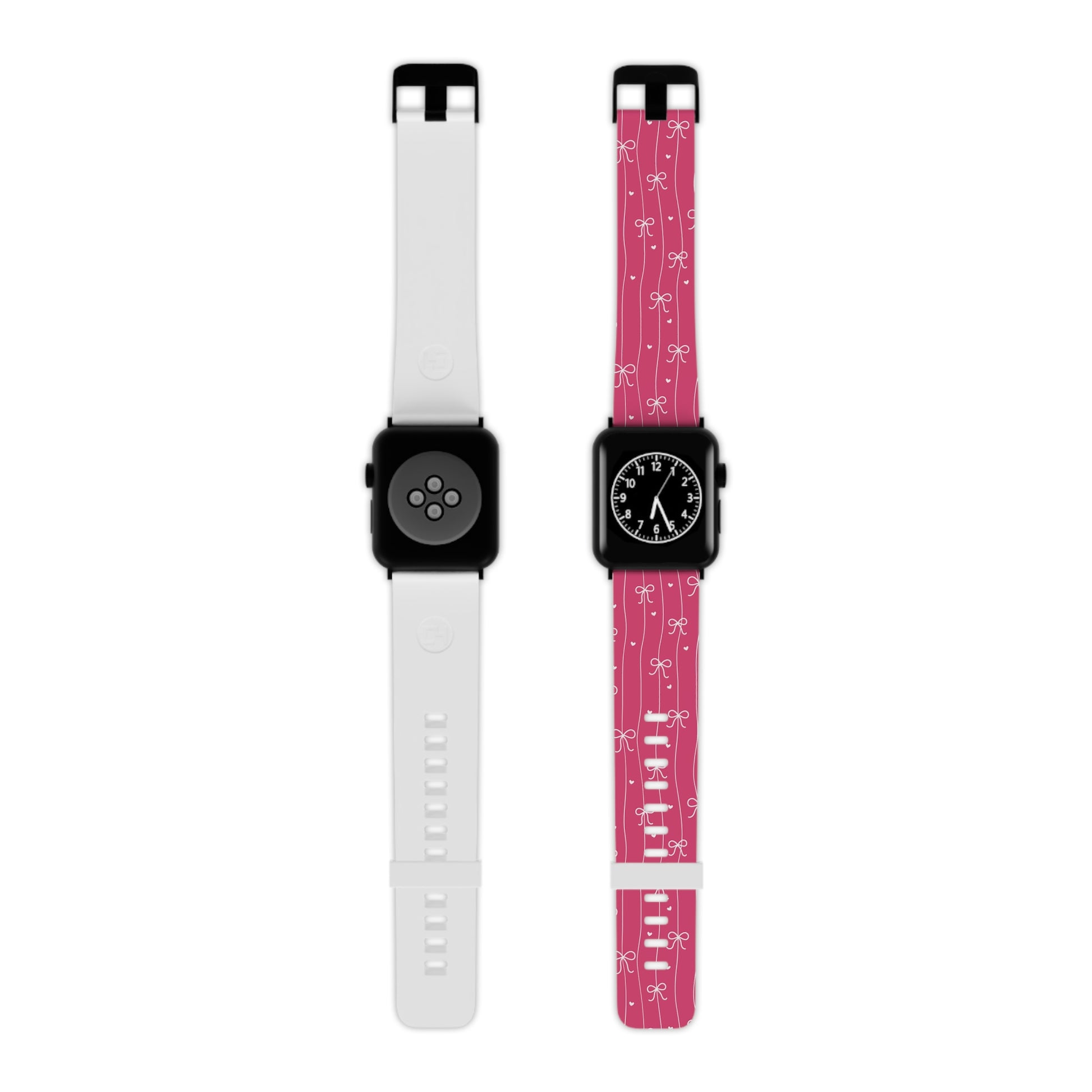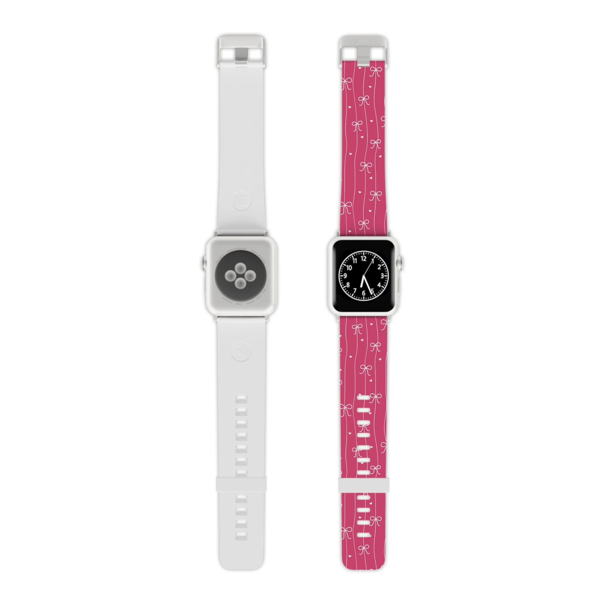 A cheerful, durable watch band made to bring a playful touch to everyday wear. The smooth, medical-grade thermo elastomer feels light against the skin and resists sweat during long days. A lively ribbon-and-bow pattern in warm pink runs the length of the band, giving a hand-drawn, whimsical look that pairs well with casual and dressy moments alike. Anodized aluminum buckles and stainless steel adapter hardware keep the band secure through hikes, errands, and evening outings. Available in standard and long lengths and compatible with most Apple Watch models, this strap balances comfort, resilience, and a bit of joyful style.