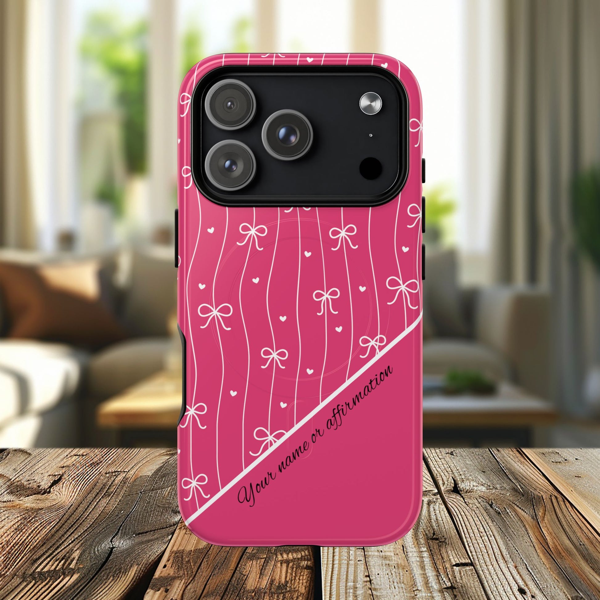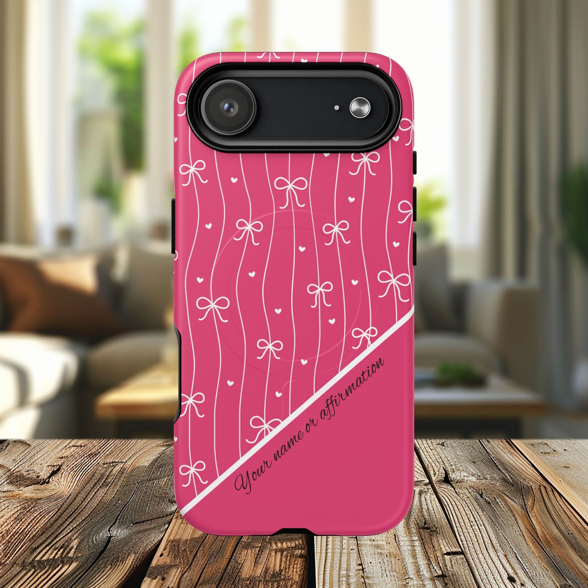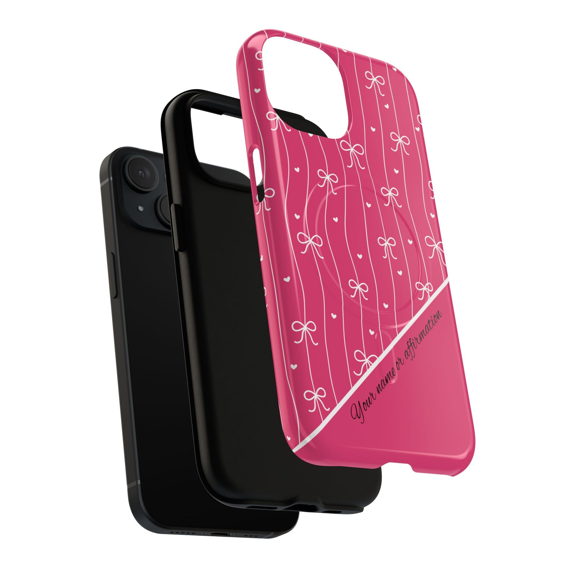 Pink Bow Coquette Magnetic Tough Magnetic MagSafe® Case — (Add Name or Affirmation)-iPhone® 13, 14, iPhone 15, iPhone 16, iPhone 17, Pro, Pro Max, Plus Cases.