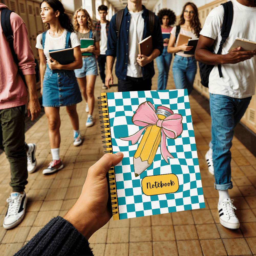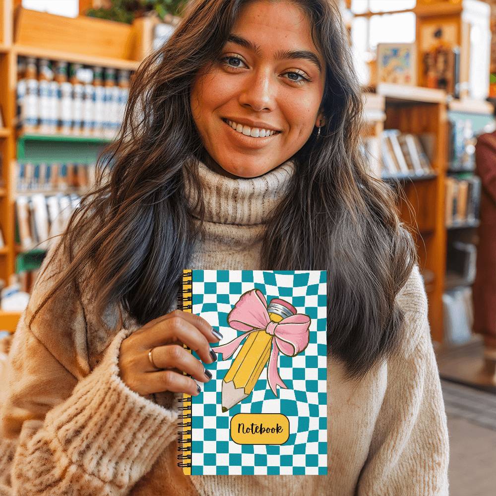 Introducing the Checkered Charm Notebook, a delightful blend of style and functionality designed to brighten up your school days. Measuring a convenient 6" x 8", this spiral-bound notebook features a vibrant checkered cover adorned with a charming pink bow and pencil design. It's the perfect companion for students and anyone who loves a touch of whimsy in their stationery.