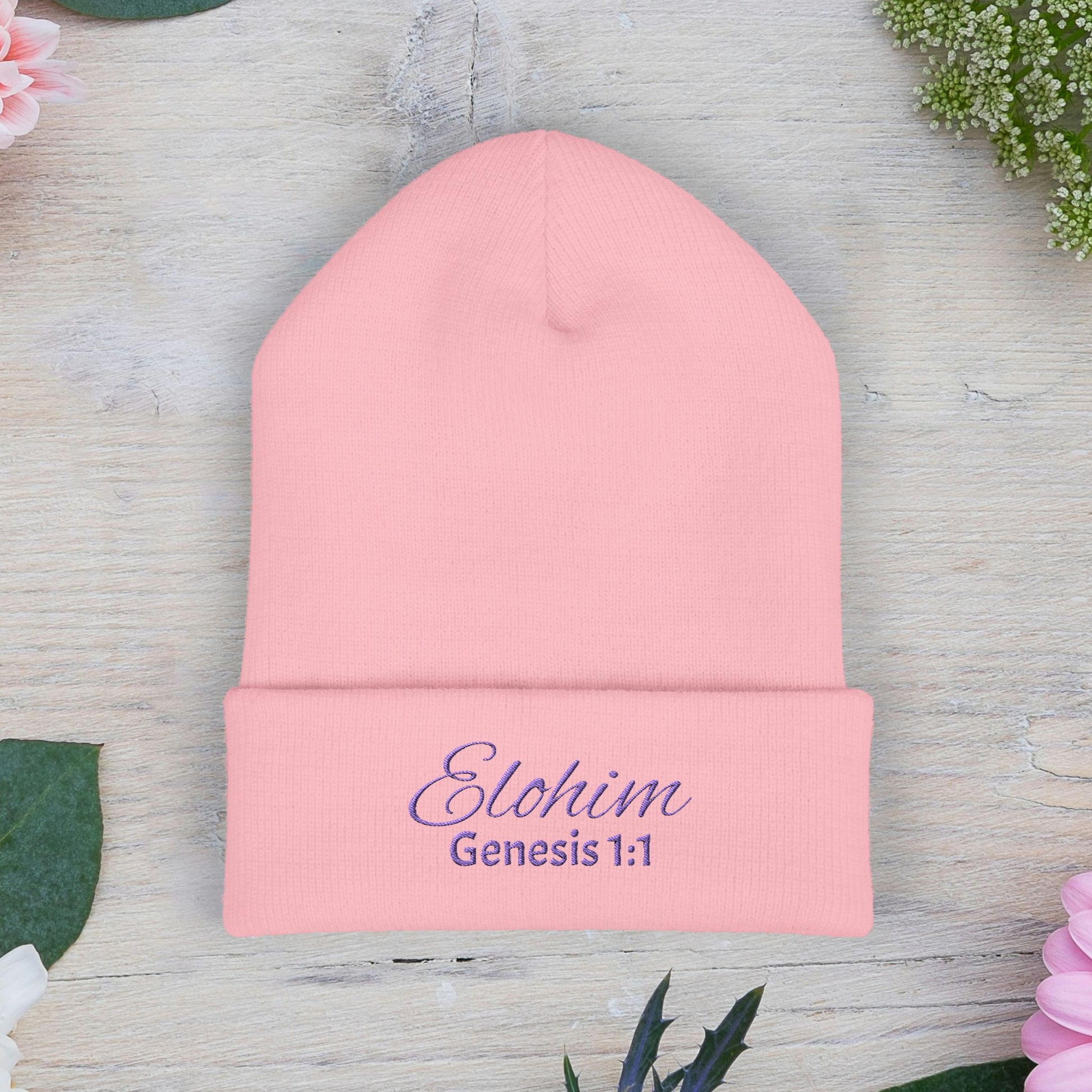 Purple Embroidered 'ELOHIM, GENESIS 1:1' Classic Cuffed Beanie - Cozy Winter Hat, Streetwear Accessory, Personalized Gifts, Religious Apparel, Unisex Beanie