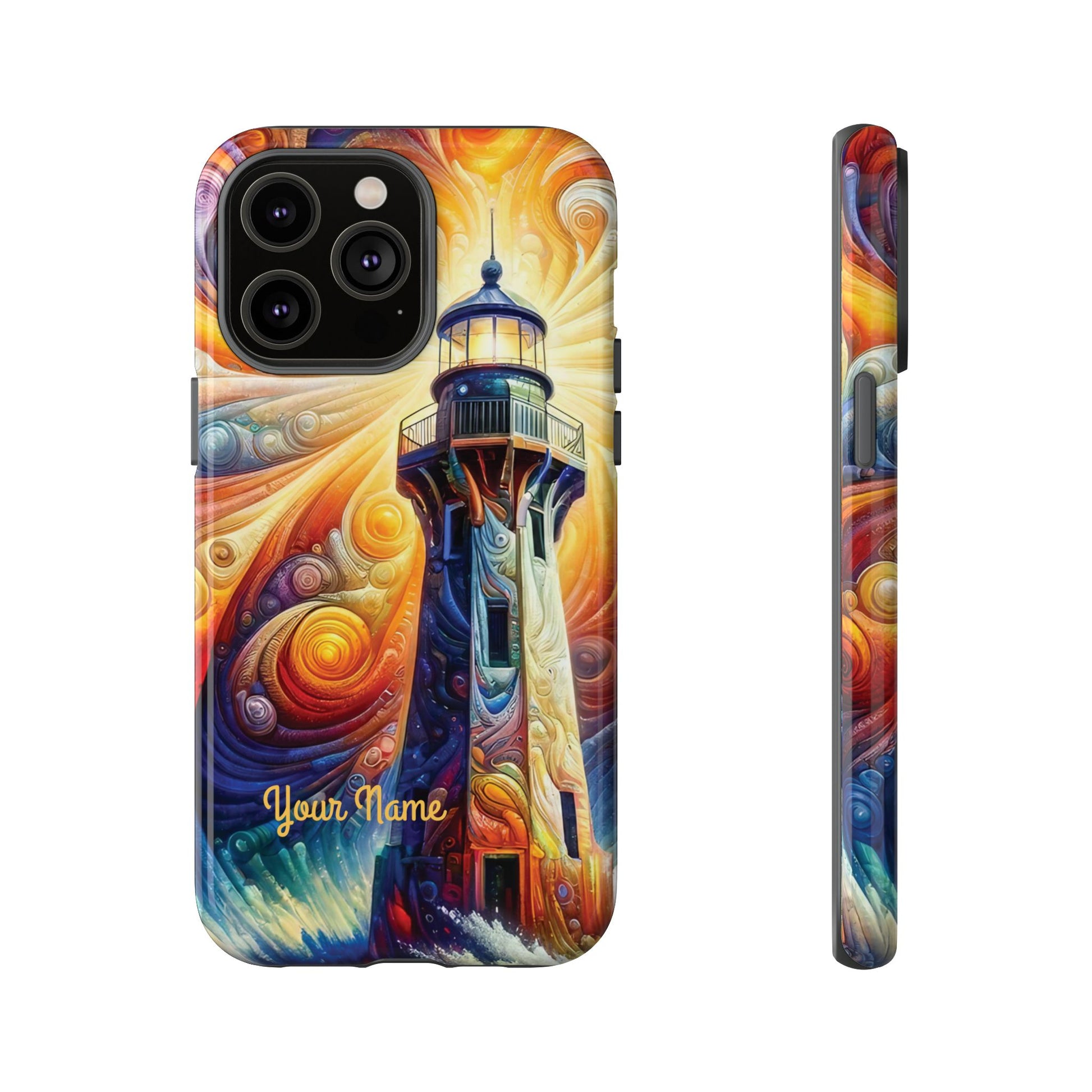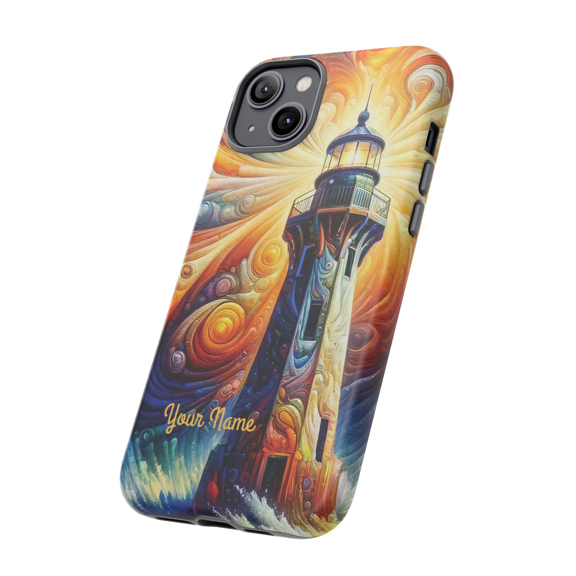 Cosmic Beacon phone case- this name captures the vibrant, swirling, celestial-themed artwork surrounding the lighthouse, suggesting guidance and illumination in a vast, dynamic universe. A perfect gift for your loved ones.