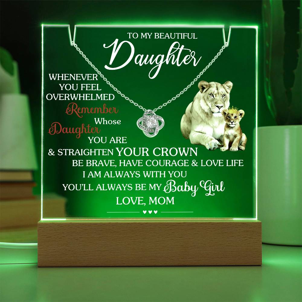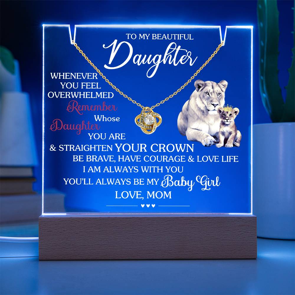 To My Beautiful Daughter, Whenever you feel overwhelmed REMEMBER whose DAUGHTER you are and strengthen your CROWN be Brave have courage and love life I am always with you. You will always be my Baby Girl, Love Mom.