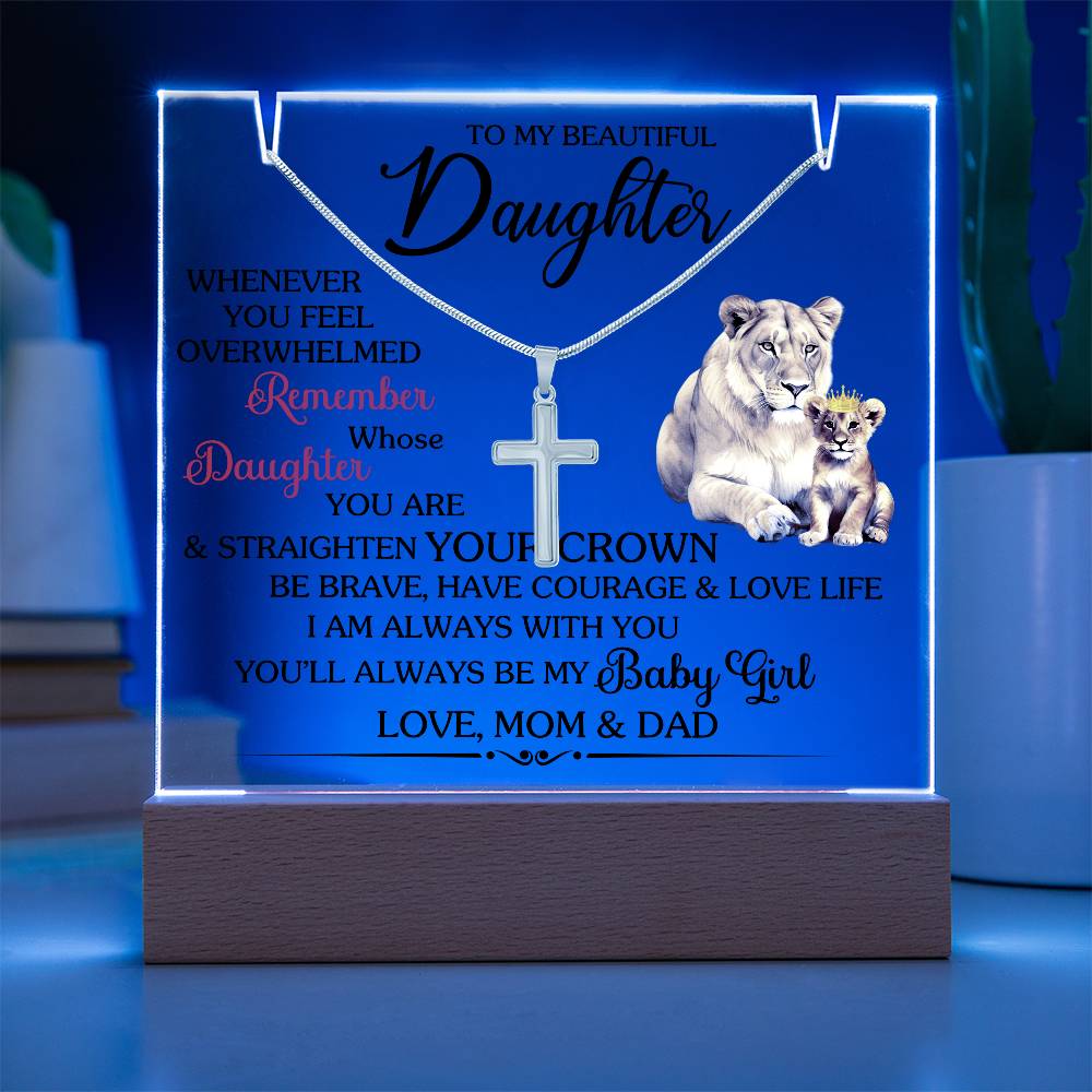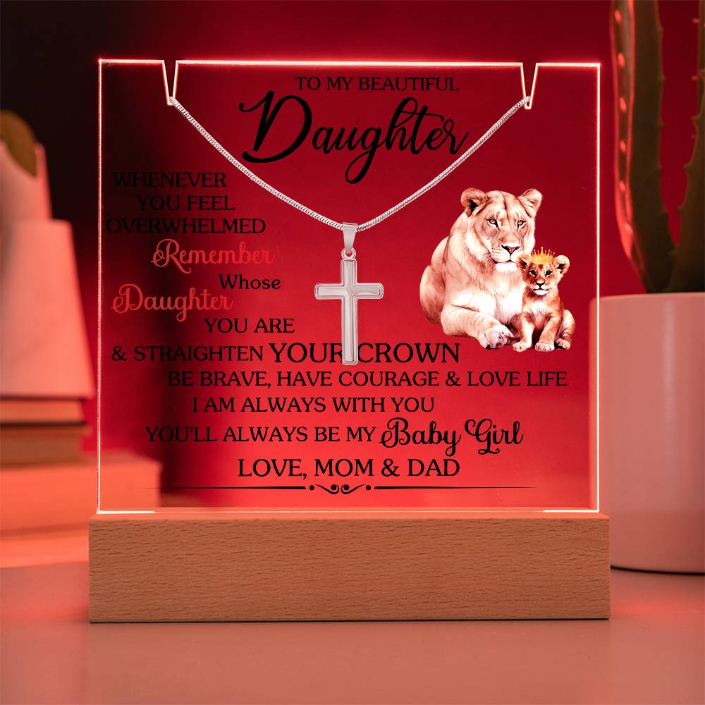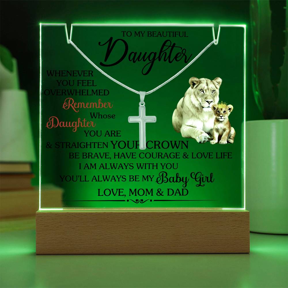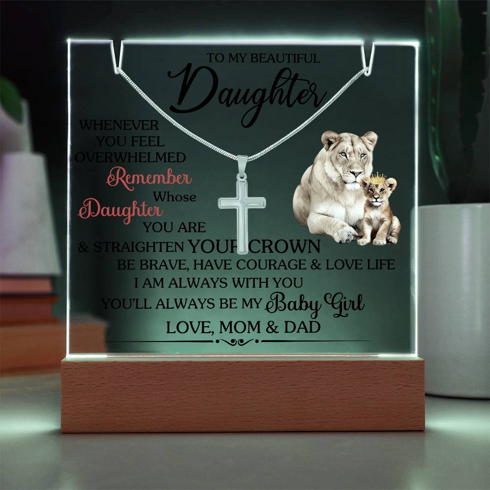To My Beautiful Daughter, Whenever you feel overwhelmed REMEMBER whose DAUGHTER you are and strengthen your CROWN be Brave have courage and love life I am always with you. You will always be my Baby Girl, Love MOM and DAD.