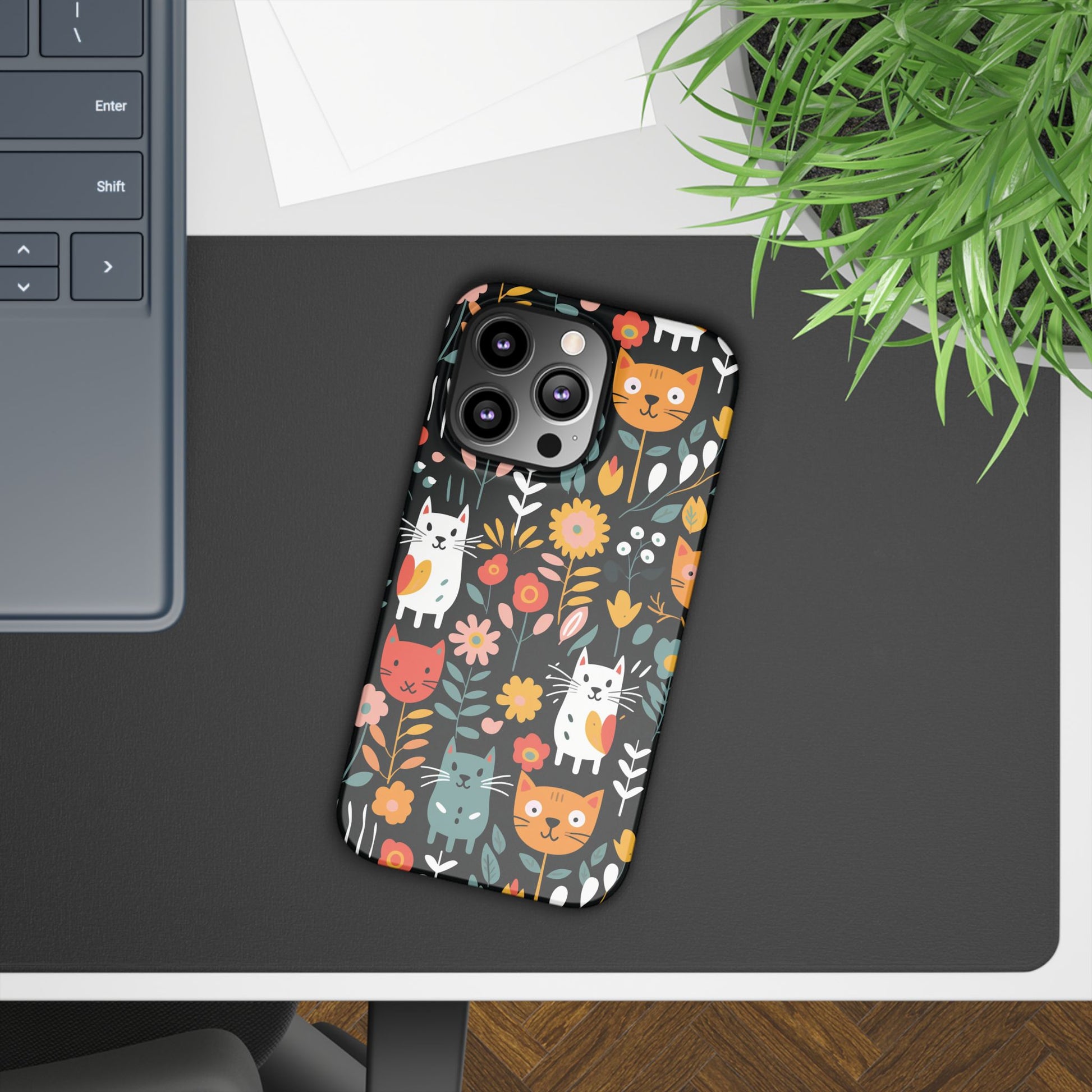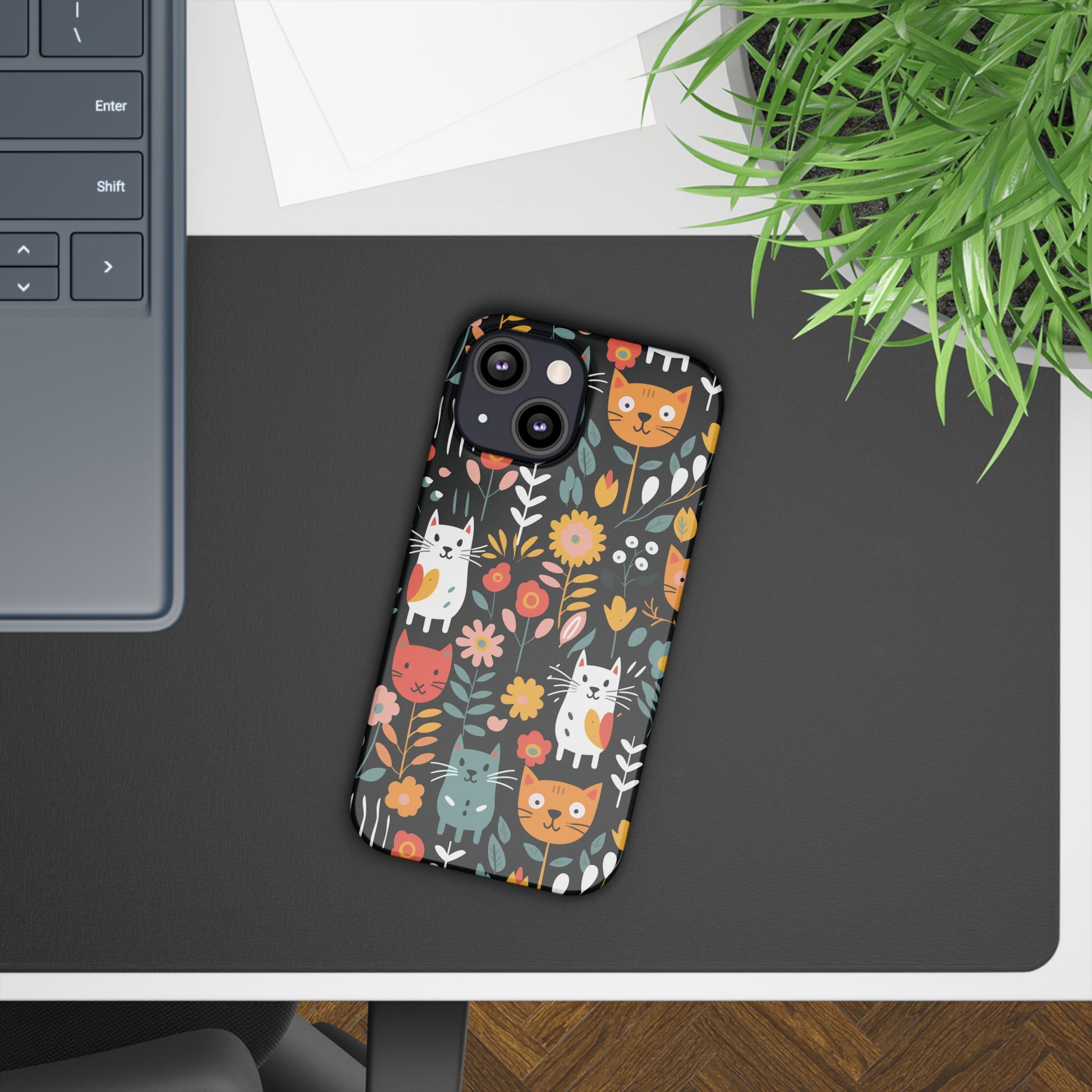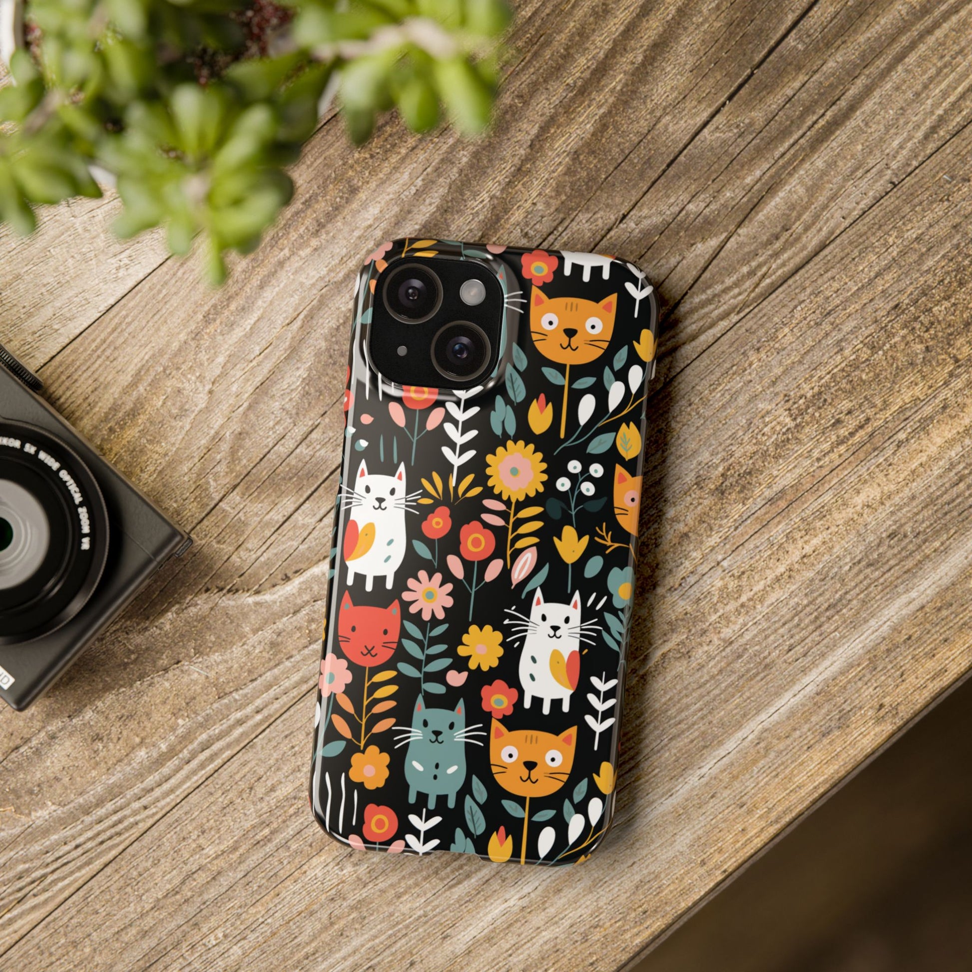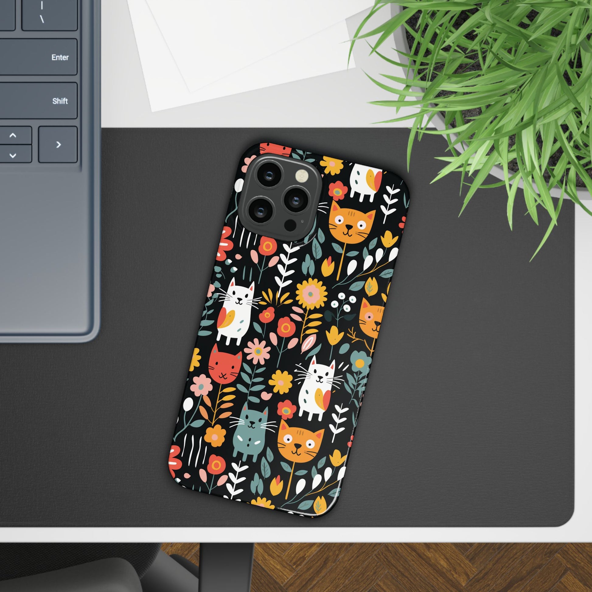 Bring a little garden whimsy to your everyday carry. This slim phone case wraps your device in vivid, full-bleed artwork of playful cats among blooms — bright, crisp colors that pop whether you choose a glossy or matte look. The slim polycarbonate shell keeps your phone feeling light in hand while providing reliable resistance to scratches and chips. It hugs your phone without adding bulk, lets you charge wirelessly, and shows off the design edge-to-edge so the scene feels uninterrupted. Carry a bit of joy with you: it’s the kind of case that sparks a smile when you slide your phone out, blends easily into a busy commute or a sunny café table, and still protects the pieces that matter.
