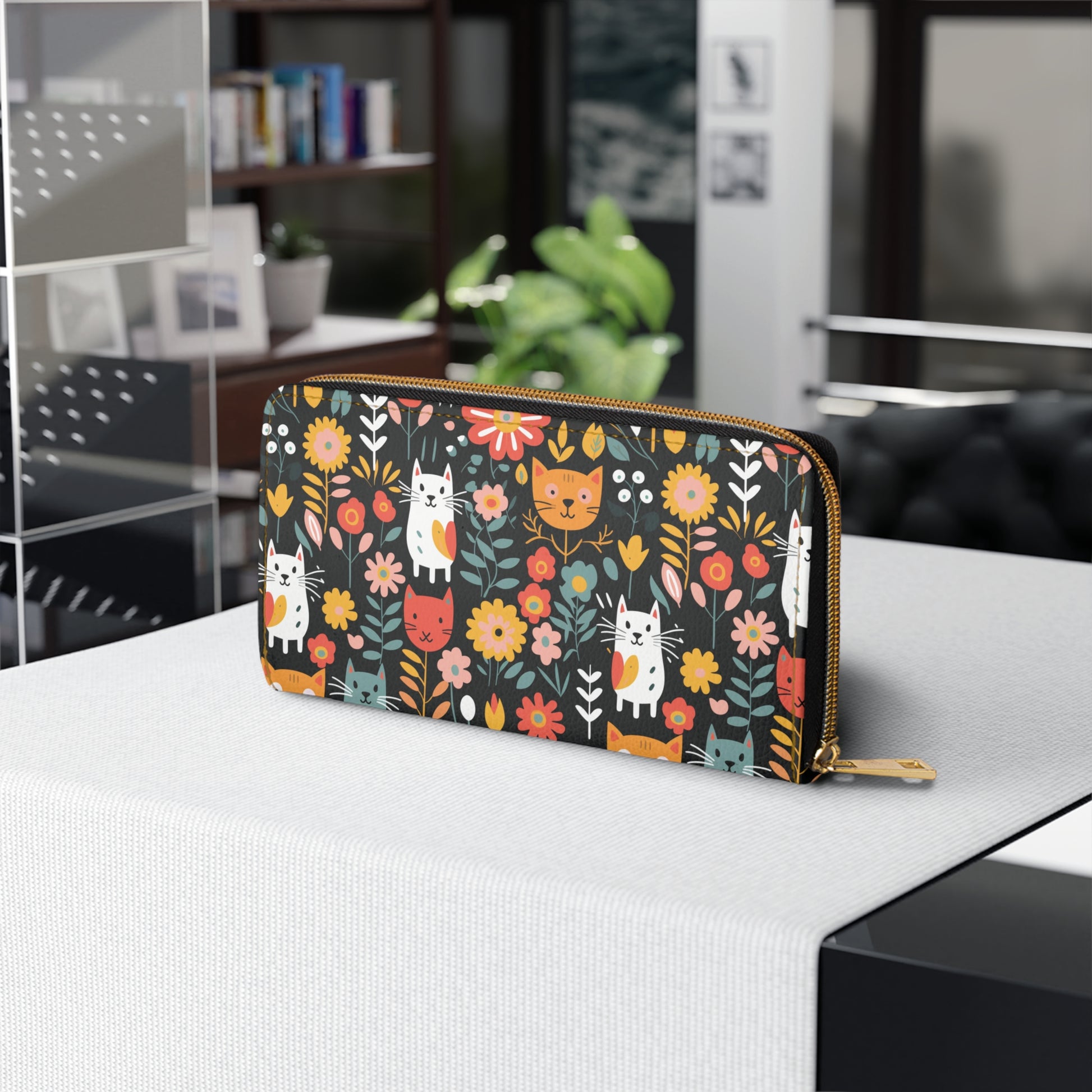 Whimsical Feline Garden Zipper Wallet, Cat Lover Gift, Adorable Wallet Accessory, Wallet for Women, Floral Print Purse